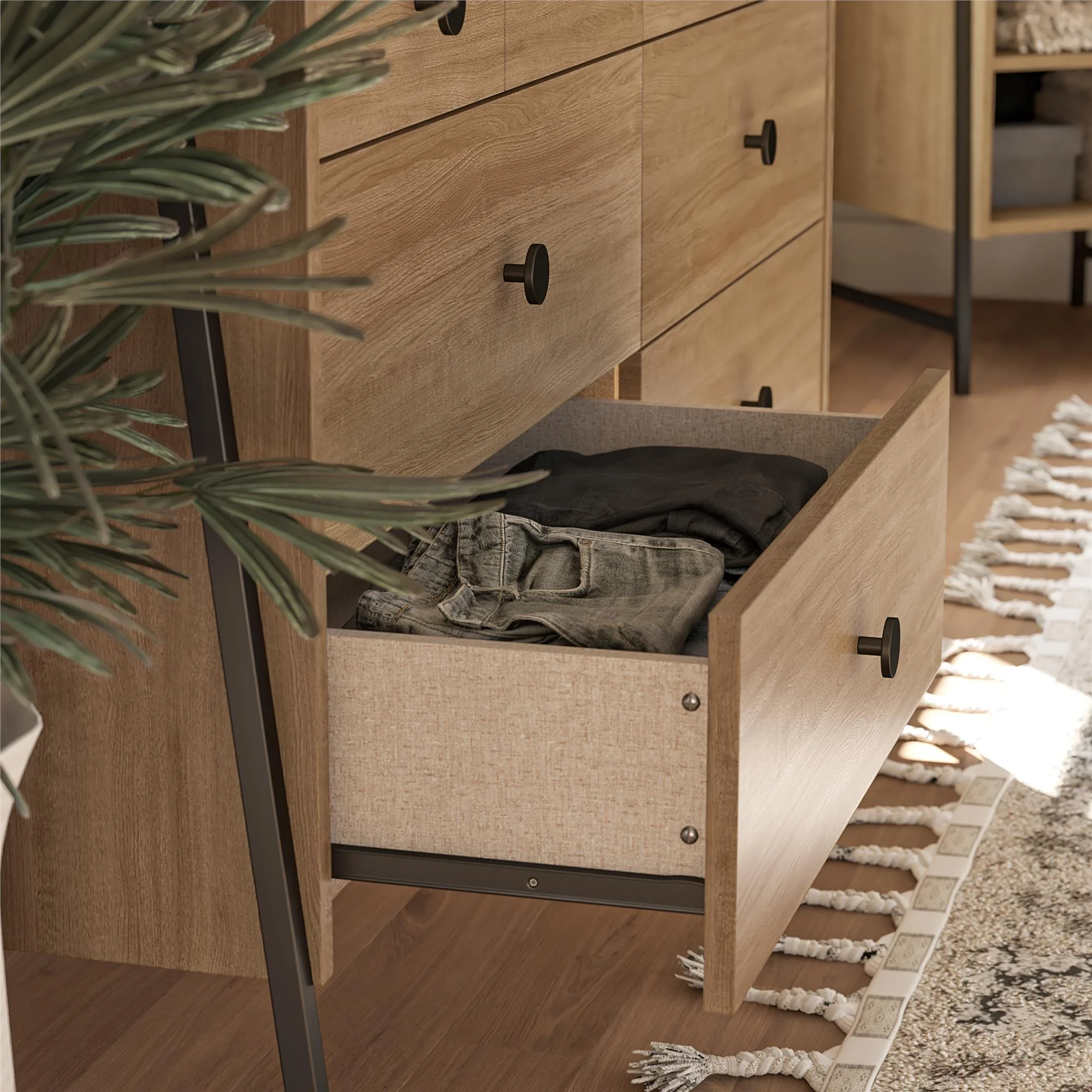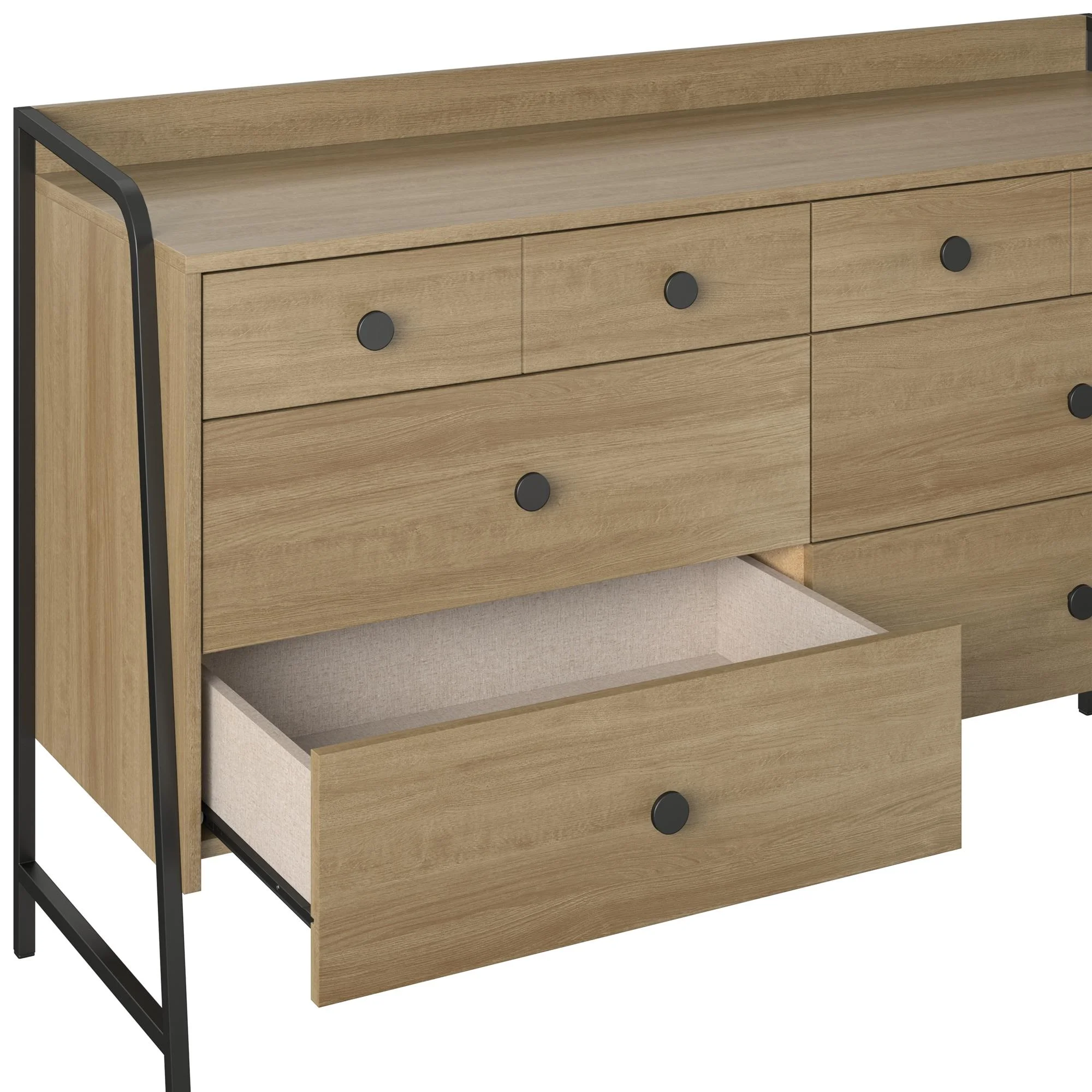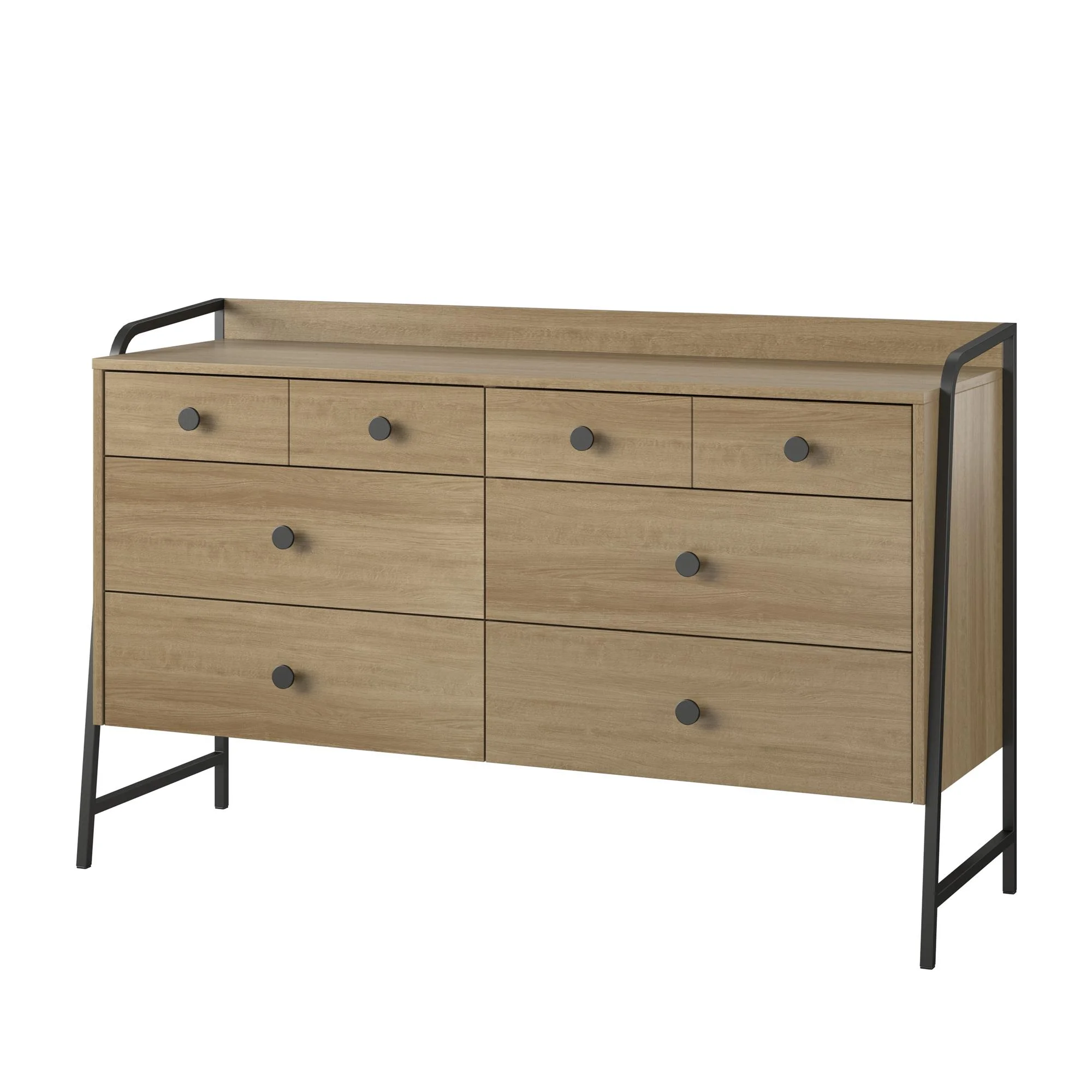 Give your bedroom a fresh makeover with the Bushwick Collection from Novogratz This rustic Wide 6 Drawer Dresser is comprised of engineered wood with a natural wood grain finish atop an industrial style power coated metal frame The top 2 drawers are conveniently sized for smaller items, while the roomy lower 4 drawers give enough space to stow away an abundance of clothing Complete the look with the entire Bushwick collection. (each sold separately) The Wide 6 Drawer Dresser ships flat in one box and requires assembly. Two adults are recommended to assemble. Once assembled, the Dresser measures to be 50.2″ W x 16.3″ D x 31.2″ H Top drawer measurements (x2): 21.6″ W x 13″ D x 3″ H. Lower drawer measurements (x4): 21.6″ W x 13″ D x 4.1″ Max weight capacities: Top: 75 lbs. Top drawers (x2): 15 lbs. each Lower drawers (x4): 25 lbs. each. Assembled unit weight: 84 lbs. 1-Year Limited Warranty Included