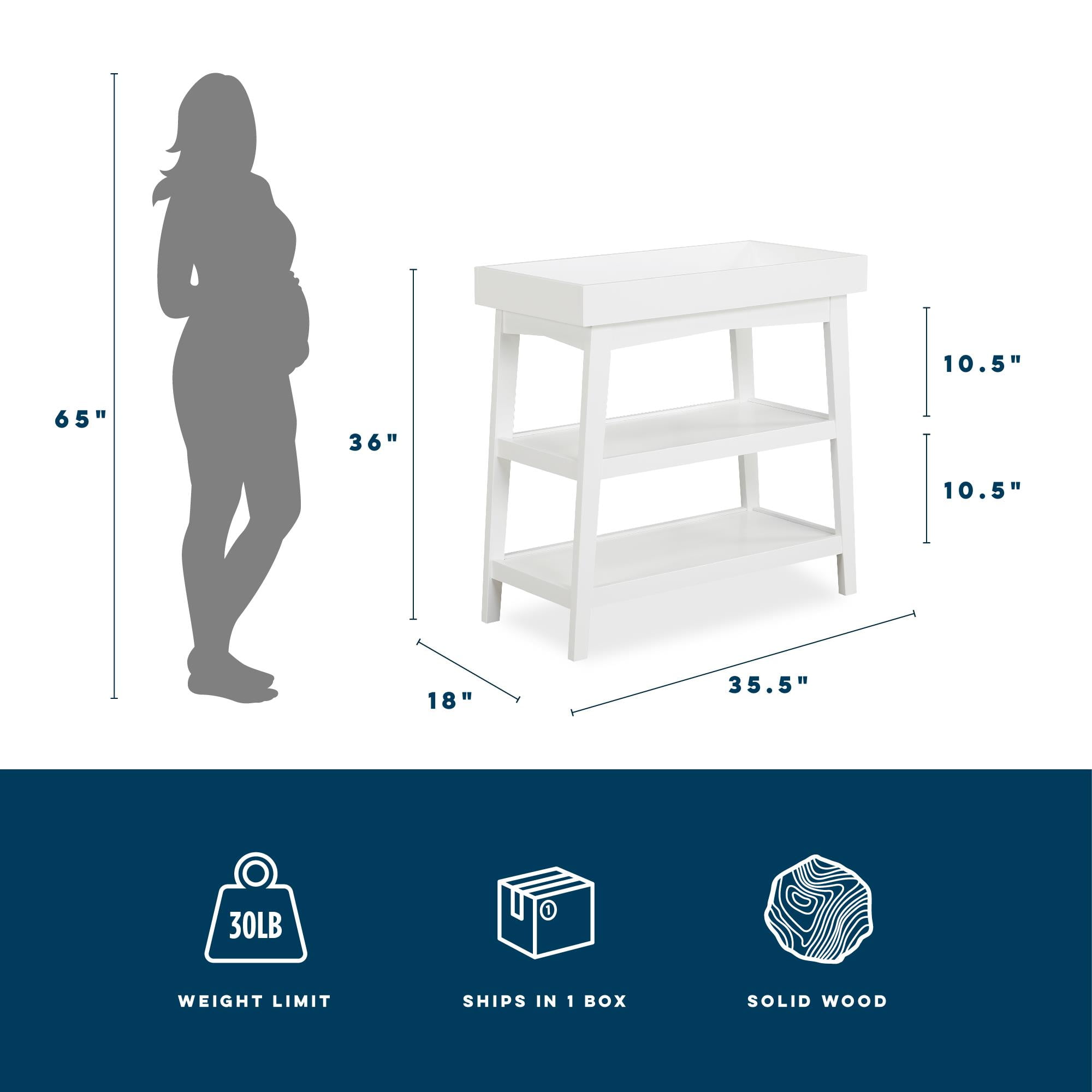 Mid-century Modern design open changer table with a non-toxic finish. Three-tier open frame made with solid pine wood construction. Top tier accommodates a standard-size changing pad (sold separately). Lower tiers can be used to store diapers and other baby supplies. Perfect addition to your nursery. Get the full look by combining this piece with the rest of the Novogratz Harper Collection (3-drawer dresser and convertible baby crib). Ships in 1 box. Quick and easy assembly required, hardware included. 1-year limited warranty. Open changer dimensions: 35.5″W x 18.25″D x 36″H. Weight limit top tier: 30 lb. Weight limit per shelf: 10 lb. Shipping dimensions: 38.75″W x 21.25″D x 9.5″H. Net weight: 40.70 lb. Gross weight: 47.30 lb.