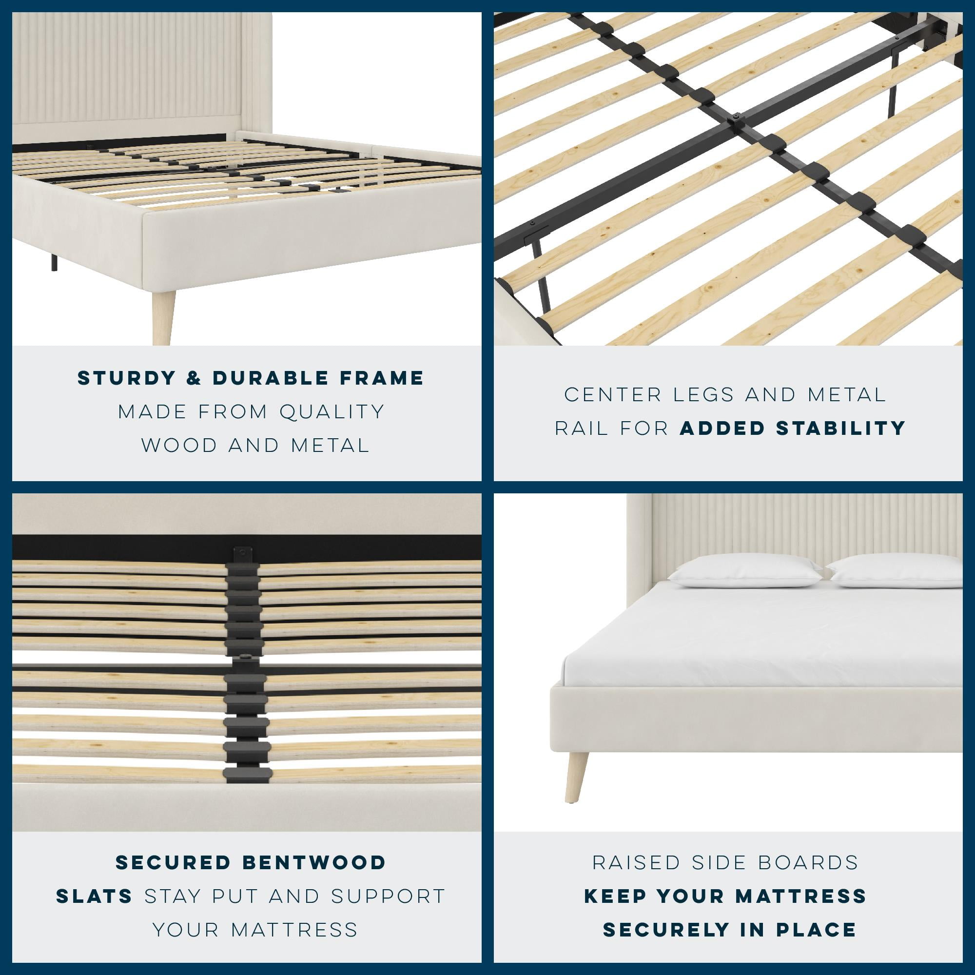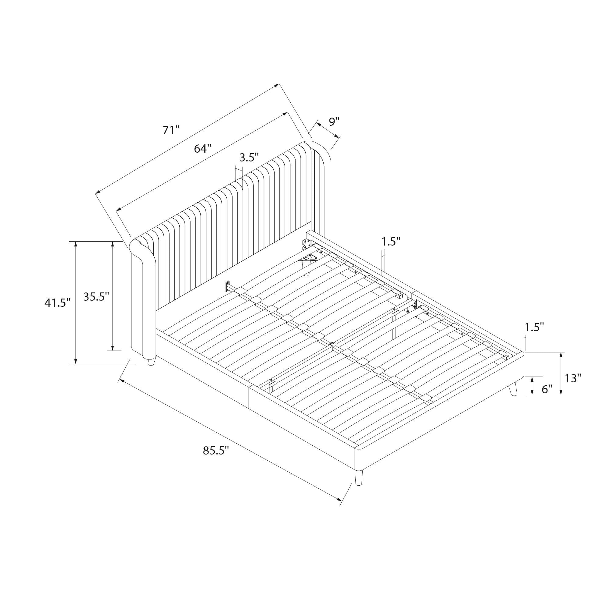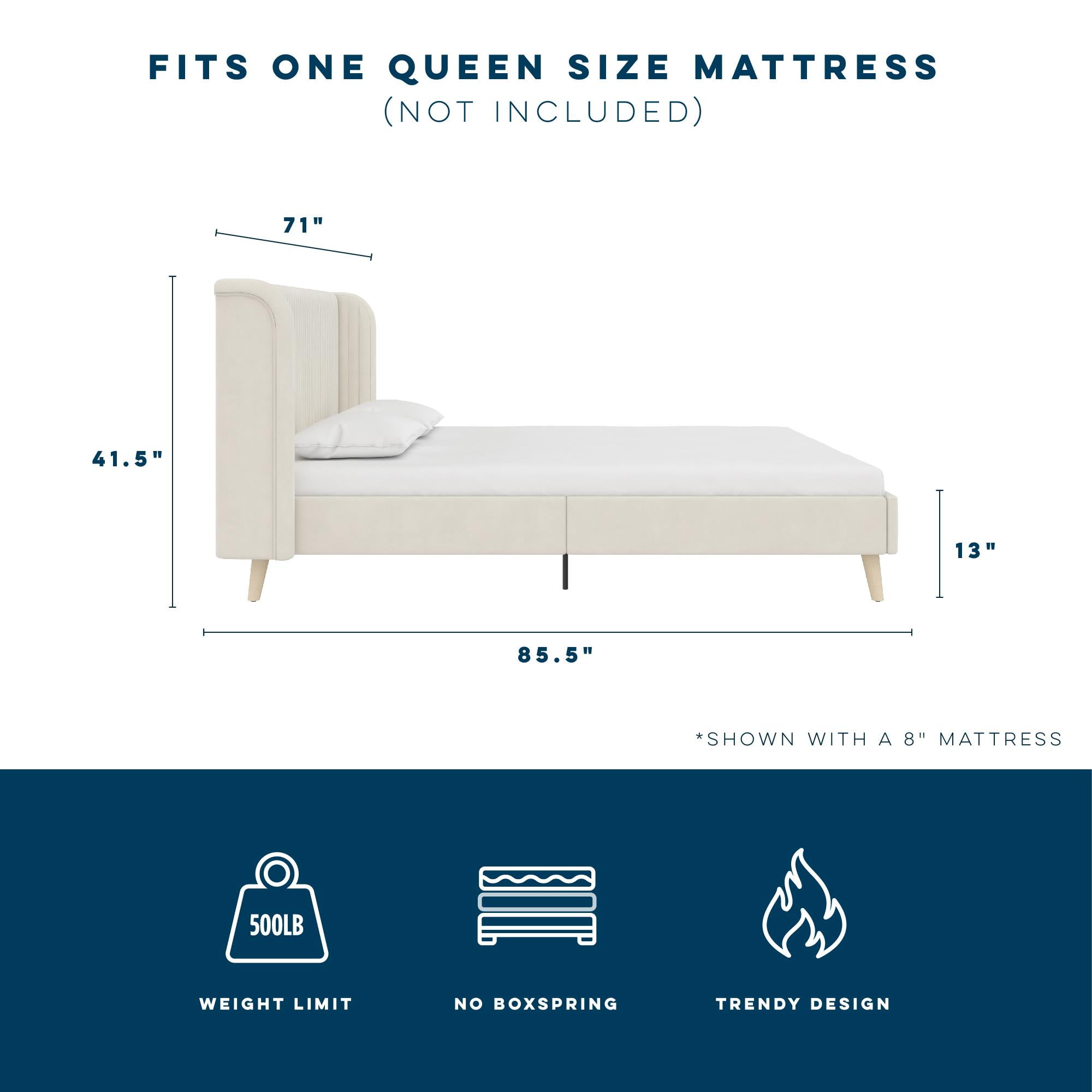 Bohemian upholstered platform bed comes glammed up with a retro-curved tufted wingback headboard that flashes cosmopolitan vertical ribbed tufting and Scandinavian inspired slanted solid wood natural grain finish legs along its lean corners Fashioned from a strong wood frame, it includes perfectly spaced bentwood slats for mattress reinforcement, metal center rails and legs for stability, and space conscious contours worthy of any sized modern master bedroom Offered in fresh Ivory and Light Gray shades, this feather soft velvet fabric bed is available in Queen and King size. And you can forget about shelling out extra cash for a box spring or foundation thanks to its built-in mattress support base Ships with all parts, tools, and instructions included in an easy-to-handle box for worry-free and quick assembly Queen size bed dimensions: 85.5″L x 71″W x 41.5″H. Net weight: 84 lbs. Weight limit: 500 lbs. Shipping dimensions: 66″L x 37″W x 6″H. Gross weight: 95 lbs. 1-year limited warranty Offered in fresh Ivory and Light Gray shades This feather soft velvet fabric bed is available in Queen and King size Queen size bed dimensions: 85.5″L x 71″W x 41.5″H. Net weight: 84 lbs. Weight limit: 500 lbs. Shipping dimensions: 66″L x 37″W x 6″H. Gross weight: 95 lbs. 1-year limited warranty