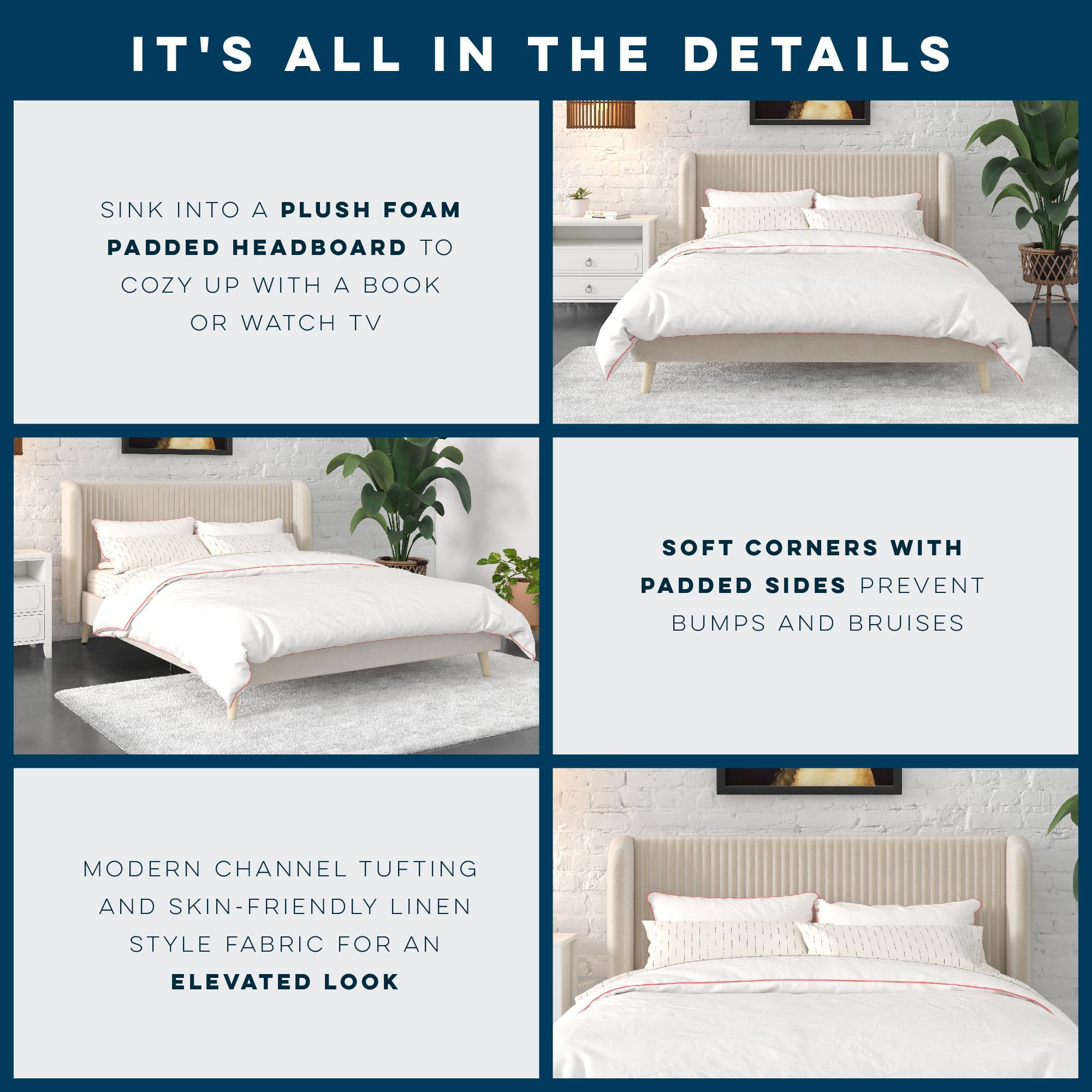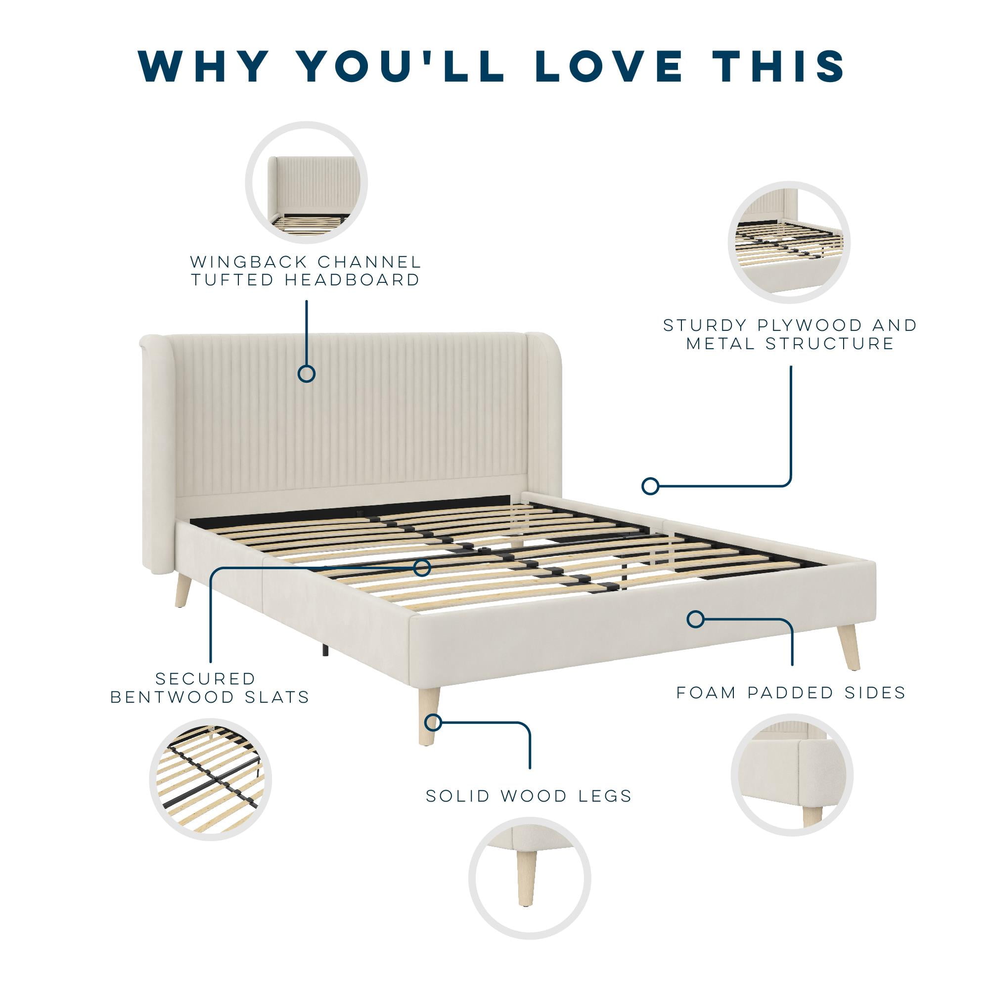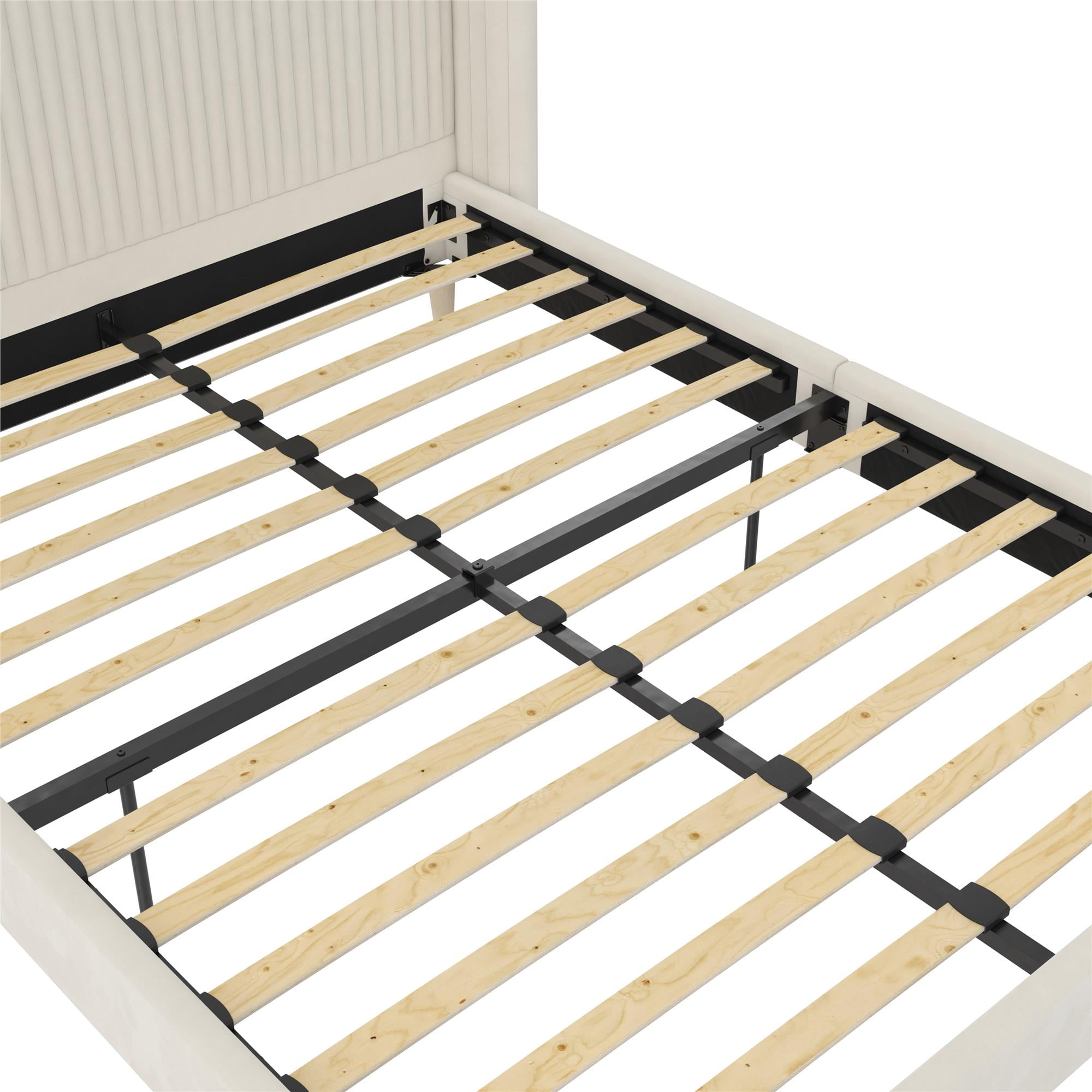Bohemian upholstered platform bed comes glammed up with a retro-curved tufted wingback headboard that flashes cosmopolitan vertical ribbed tufting and Scandinavian inspired slanted solid wood natural grain finish legs along its lean corners Fashioned from a strong wood frame, it includes perfectly spaced bentwood slats for mattress reinforcement, metal center rails and legs for stability, and space conscious contours worthy of any sized modern master bedroom Offered in fresh Ivory and Light Gray shades, this feather soft velvet fabric bed is available in Queen and King size. And you can forget about shelling out extra cash for a box spring or foundation thanks to its built-in mattress support base Ships with all parts, tools, and instructions included in an easy-to-handle box for worry-free and quick assembly Queen size bed dimensions: 85.5″L x 71″W x 41.5″H. Net weight: 84 lbs. Weight limit: 500 lbs. Shipping dimensions: 66″L x 37″W x 6″H. Gross weight: 95 lbs. 1-year limited warranty Offered in fresh Ivory and Light Gray shades This feather soft velvet fabric bed is available in Queen and King size Queen size bed dimensions: 85.5″L x 71″W x 41.5″H. Net weight: 84 lbs. Weight limit: 500 lbs. Shipping dimensions: 66″L x 37″W x 6″H. Gross weight: 95 lbs. 1-year limited warranty
