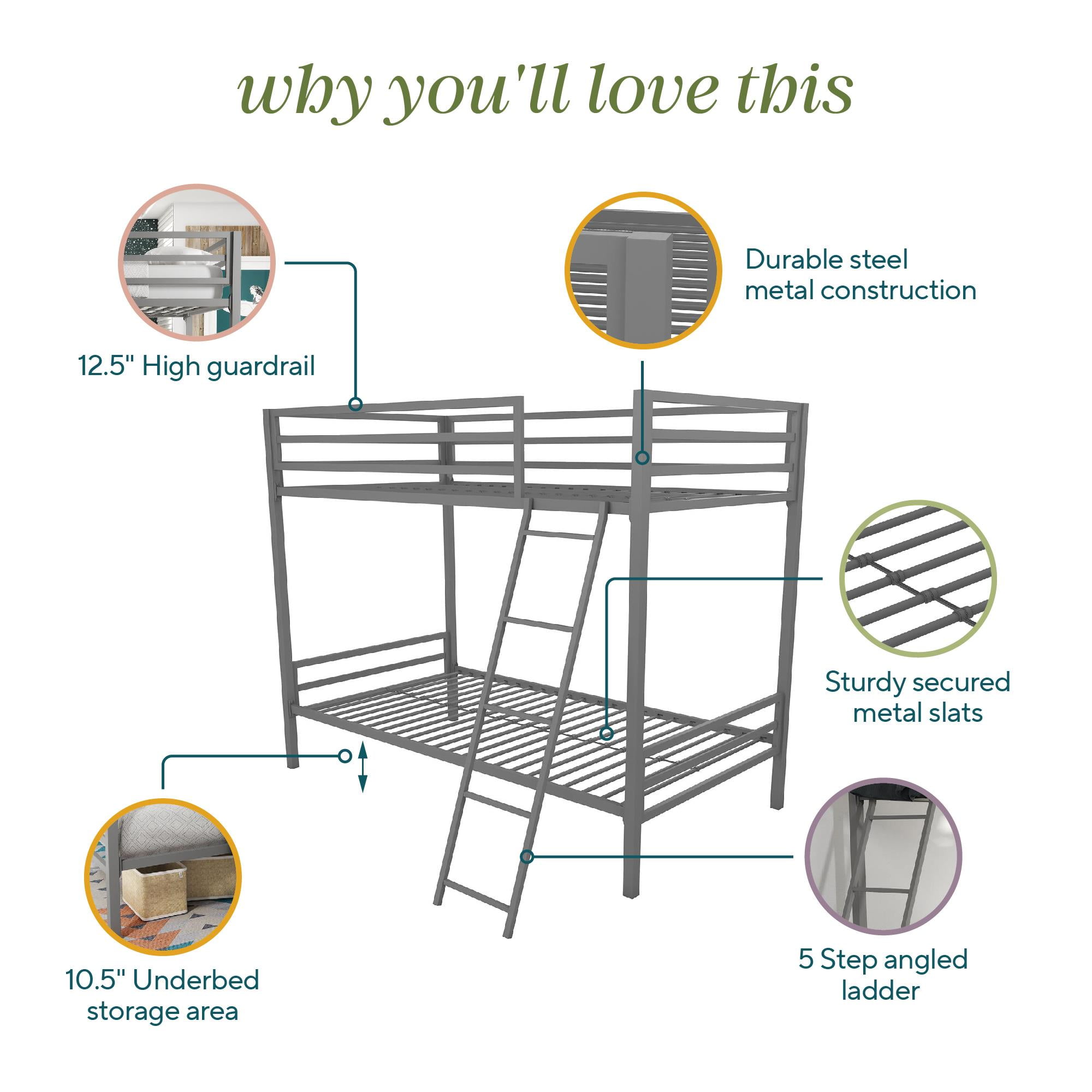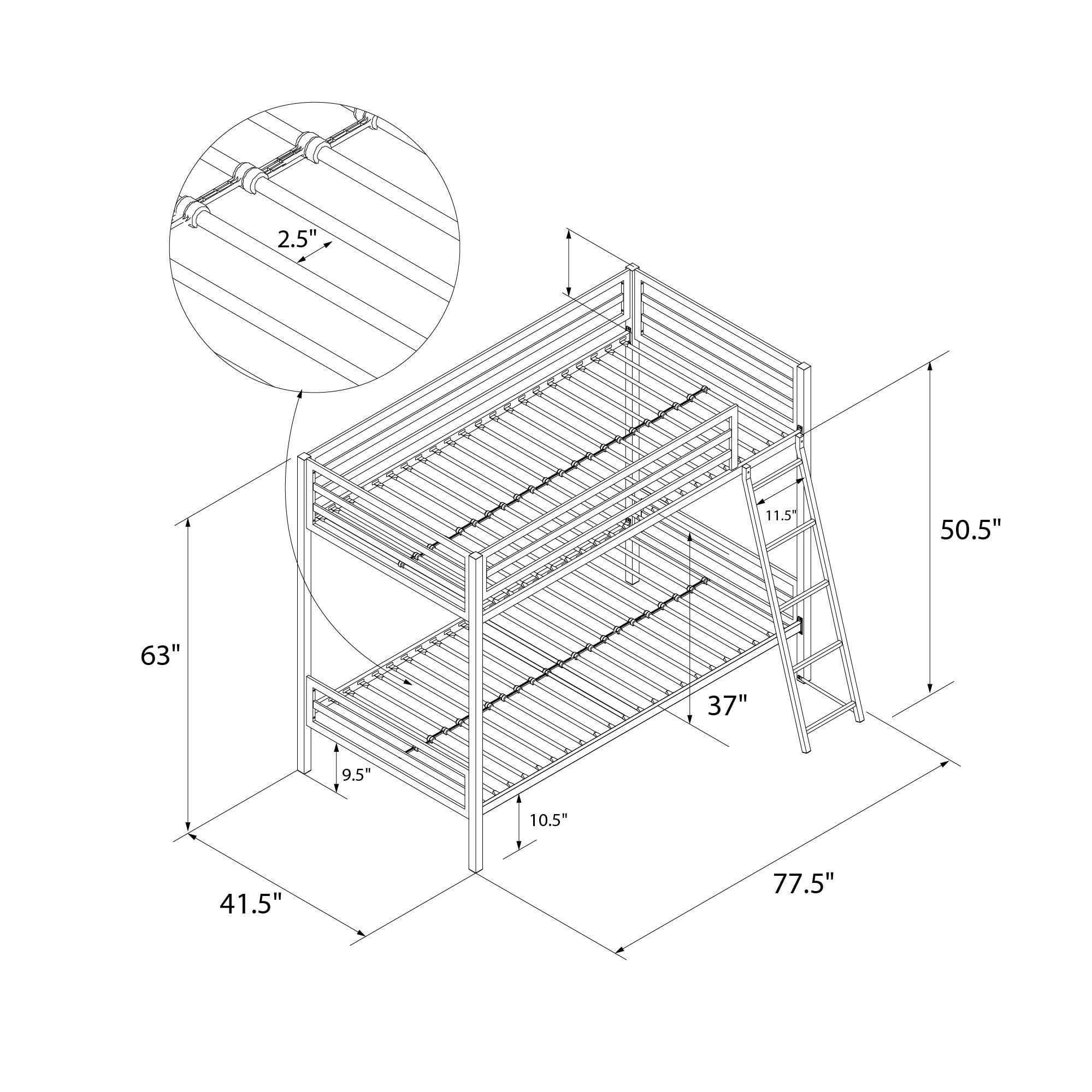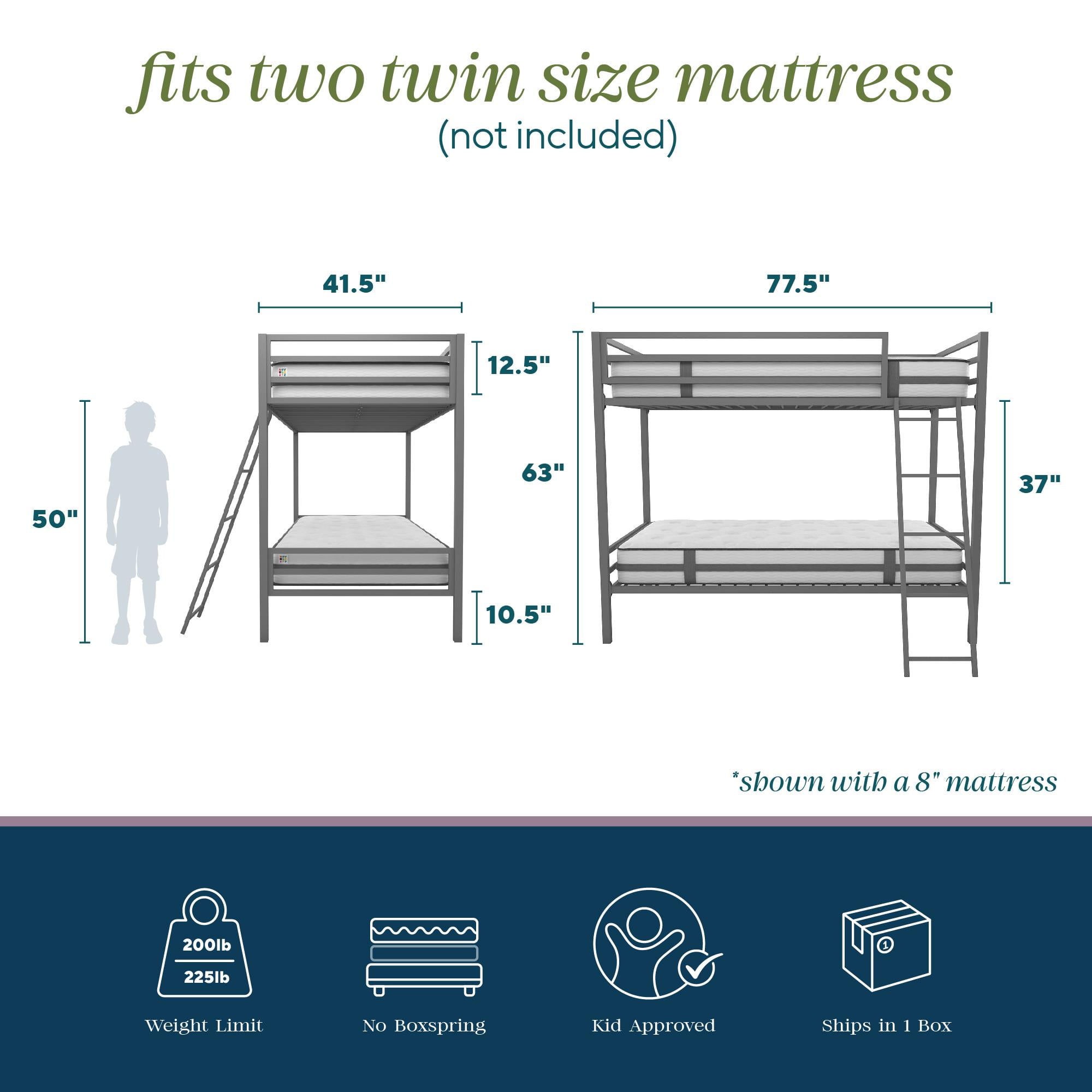 Sleek, industrial modern design ideal for space saving Sturdy metal frame construction that includes metal slats and side rails for guaranteed stability and durability. It does not require additional foundation Secured side ladder with connected bar to ensure safety Metal bunk bed includes safety rails on top bunk Accommodates two twin-size mattresses (not included) Available in Grey, Navy Blue and Pink Ships in 1 box and it’s easy assembly Bunk bed dimensions: 77.5″L x 41.5″W x 63″H Carton dimensions: 82.5″L x 14.5″W x 6″H Net weight: 90.5 lb. Gross weight: 100 lb. Weight limit for the upper bunk is 200 lb. Weight limit for the lower bunk is 225 lb.