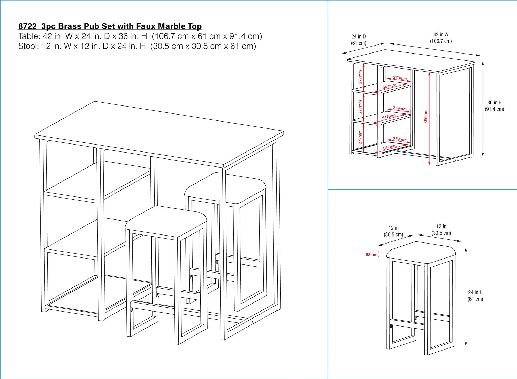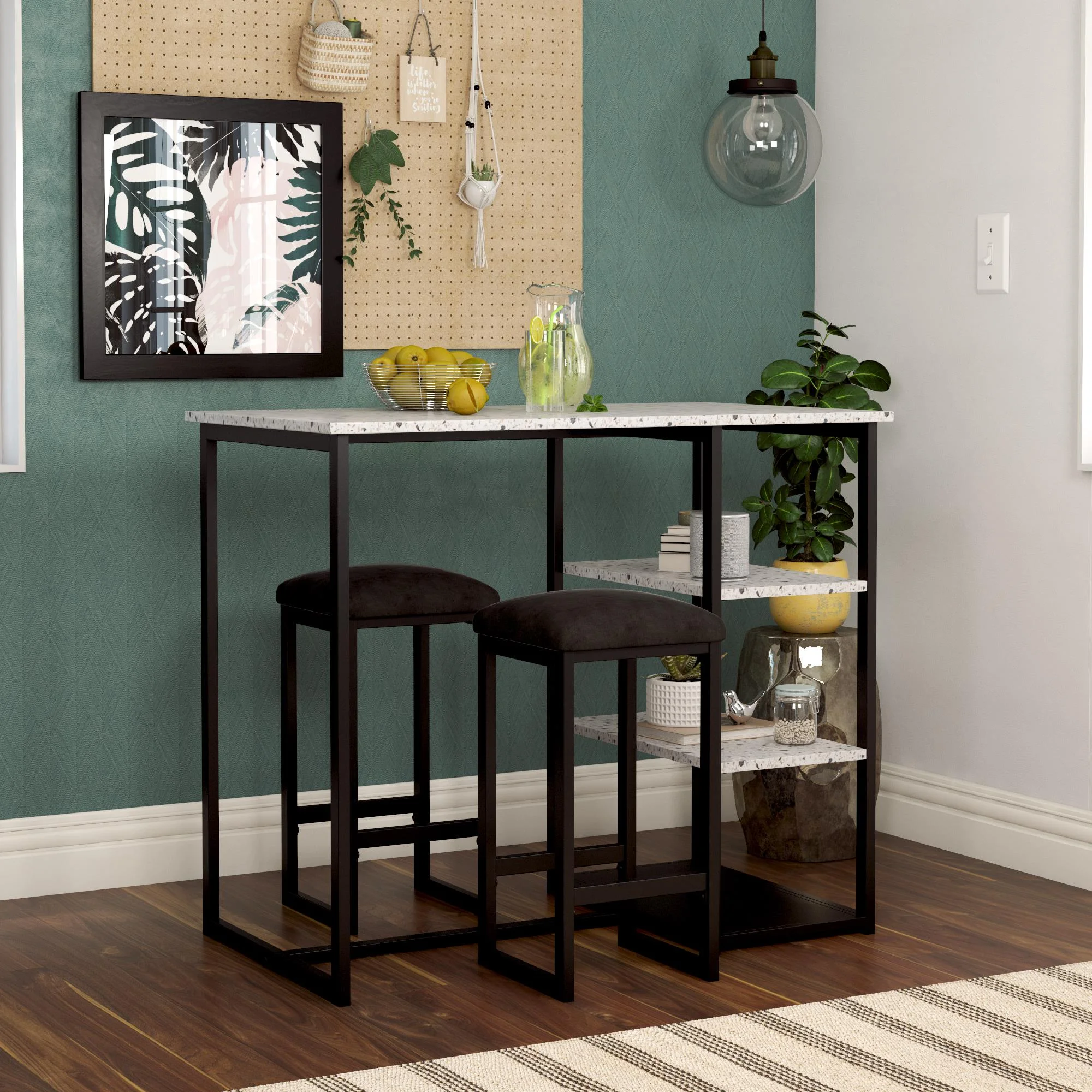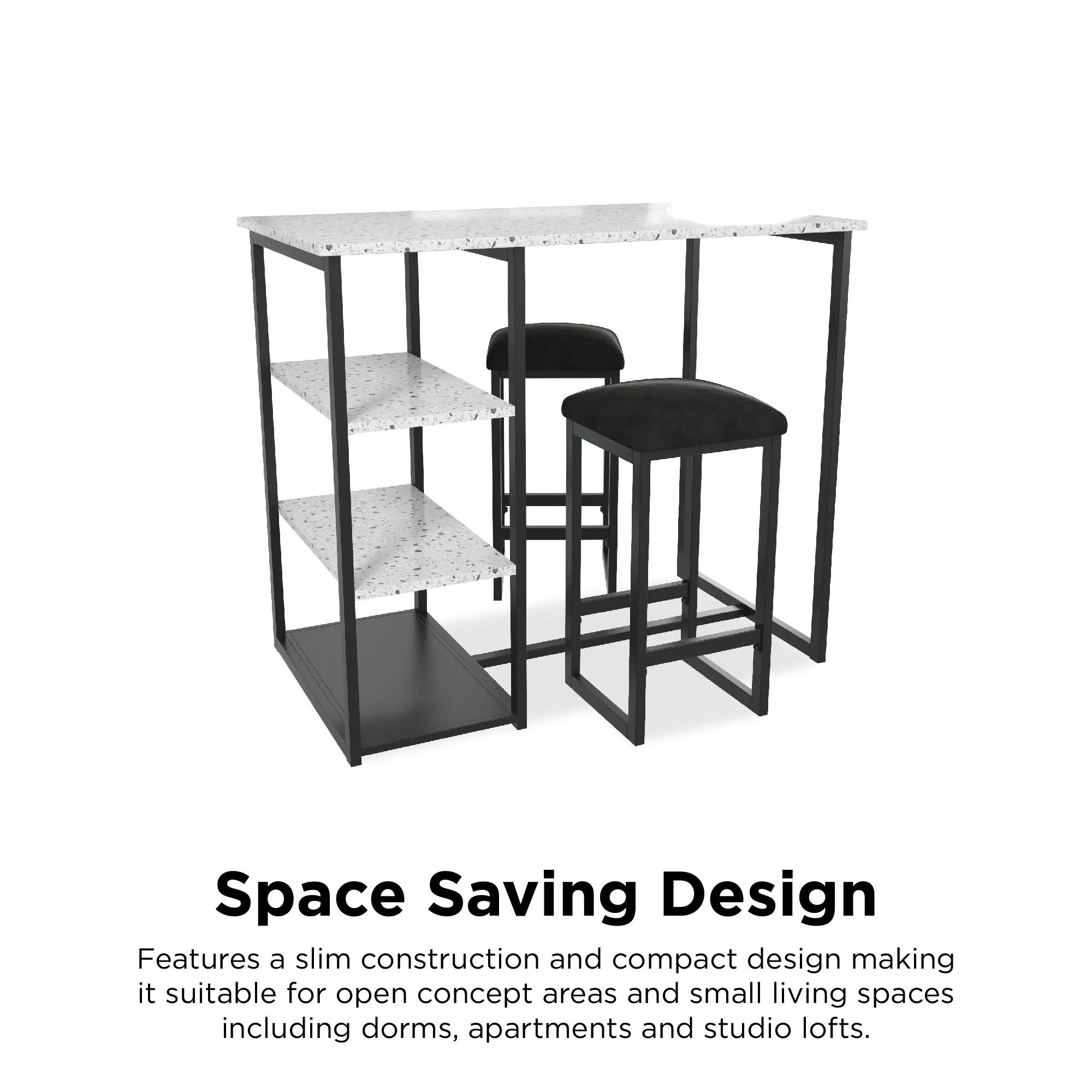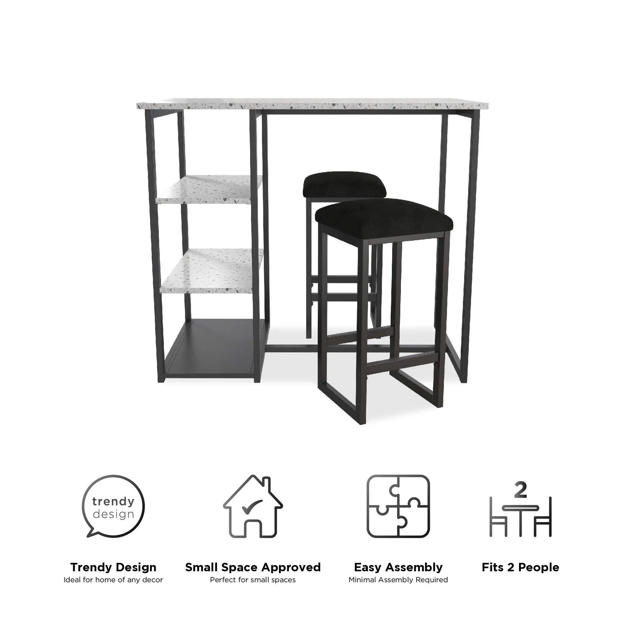Novogratz Nora 3-Piece Pub Set with Faux Terrazzo Top, Black Metal/Black Seat Edgy contemporary pub set that features a faux terrazzo tabletop, a steel metal frame and two backless counter height stools with microfiber upholstered padded cushions. Set includes 1 table and 2 stools. Includes 3 convenient side shelves that meet all of your storage needs. Features a slim construction and compact design making it suitable for open concept spaces and small living spaces including dorms, apartments and studios. Assembly required. 1-year limited warranty. Offered in multiple color options to complement your style. Table Dimensions: 42″W x 24″D x 36″H. Stool Dimensions: 12″W x 12″D x 24″H. Shipping Dimensions: 28.5”W x 46.5”L x 6.25”H. Tabletop weight limit: 70 lbs. Shelf weight limit: 50 lbs. Stool weight limit: 250 lbs.