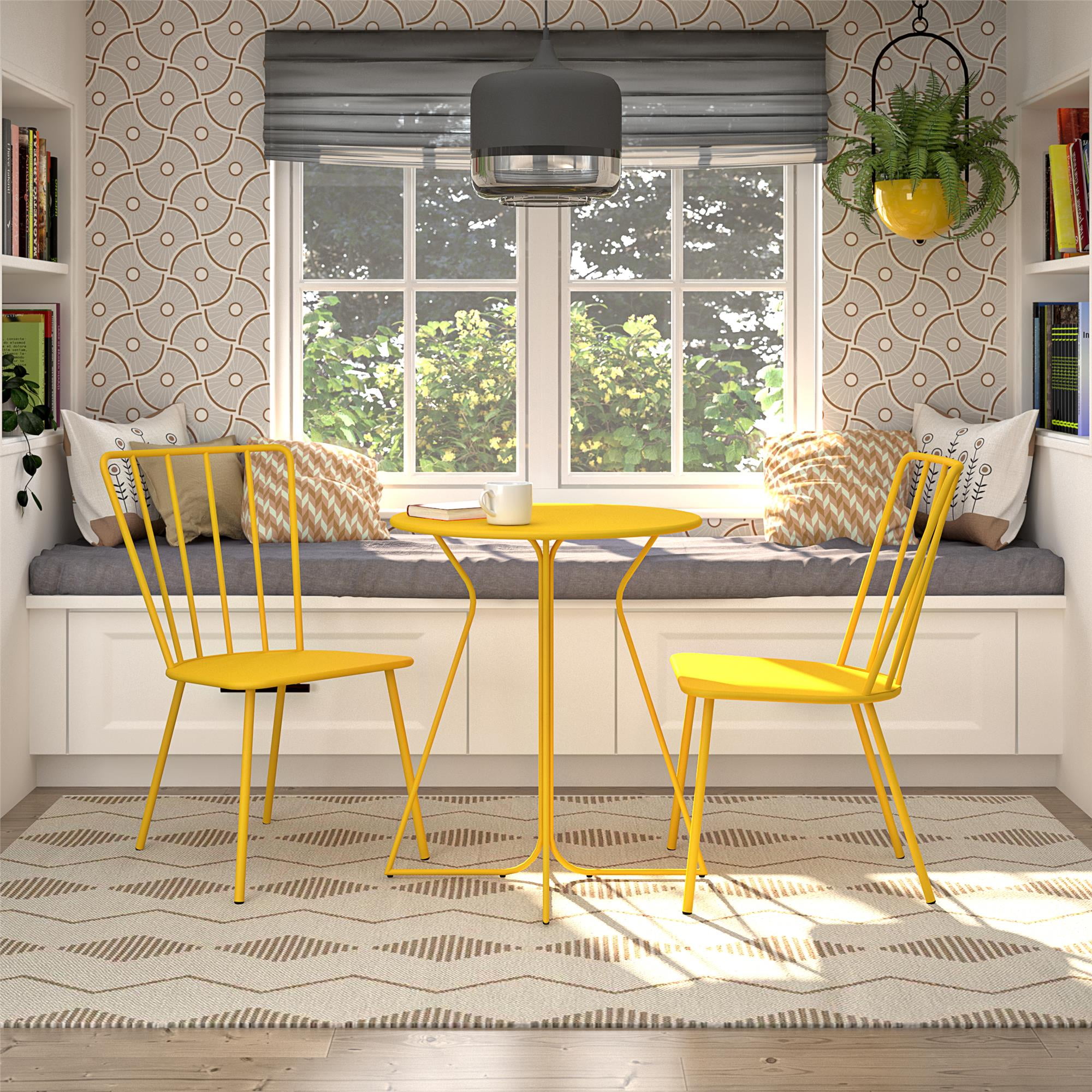 Use this Heidi Bistro Set featured in the Poolside Gossip Collection by Novogratz for all your entertaining needs. Heidi loves drinking daiquiri’s poolside and is known for starting conga lines. This bistro set is light on its mid-century feet and fits perfectly into smaller outdoor spaces with its slender legs. Ideal for both indoor and outdoor use, this bistro set is great for sipping on a cold beverage with friends or dining al fresco in the warm sunshine and fresh air. This bistro set is the perfect seating solution for any restaurant or cafe. No matter the occasion, Heidi is here to serve your hosting and seating needs! This trendy set is available in a colorful yellow to breathe new life into all backyard or home decor aesthetic. Constructed using durable powder coated steel and weather resistant materials, helping to make this bistro set withstand all outdoor elements while allowing for a 250lbs. weight capacity rating (chairs) and a 100lbs. weight capacity rating (table). With some assembly required and tools provided, Heidi is seamless to put together and virtually ready to use right out of the box. Create your dream dining arrangement for entertaining and everyday use.
