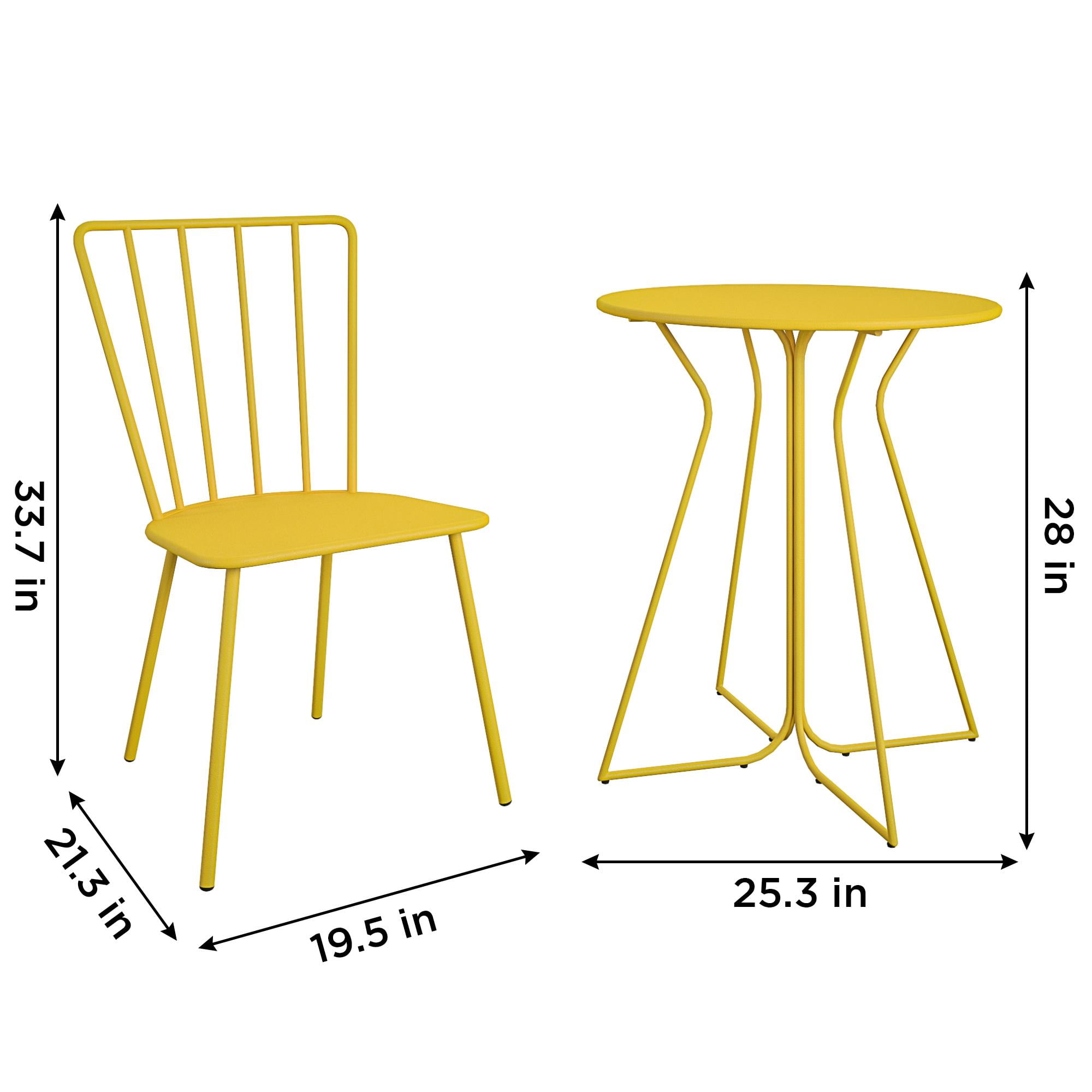 Great for indoor and outdoor use making it ideal for casual seating while entertaining friends and family. Available in a trendy yellow to update any backyard or home decor aesthetic. Perfect seating solution for restaurants or cafes. Built using durable and weather resistant materials to withstand the outdoor elements. Some assembly required with tools provided and comes with a 250lbs. weight capacity rating (chairs) and a 100lbs. weight capacity rating (table).