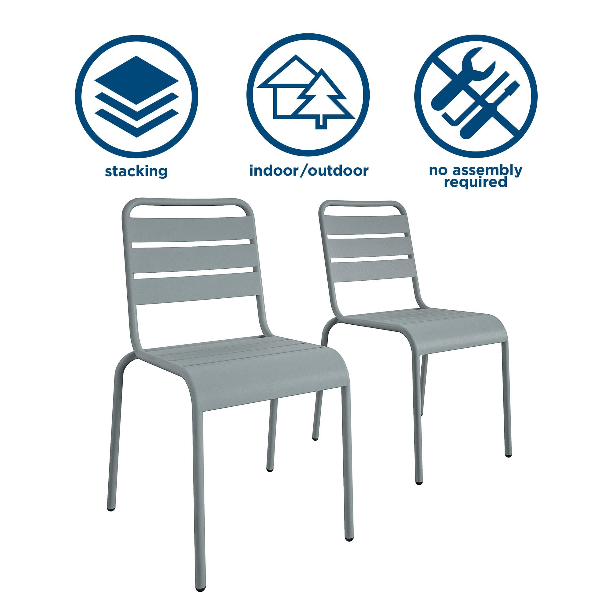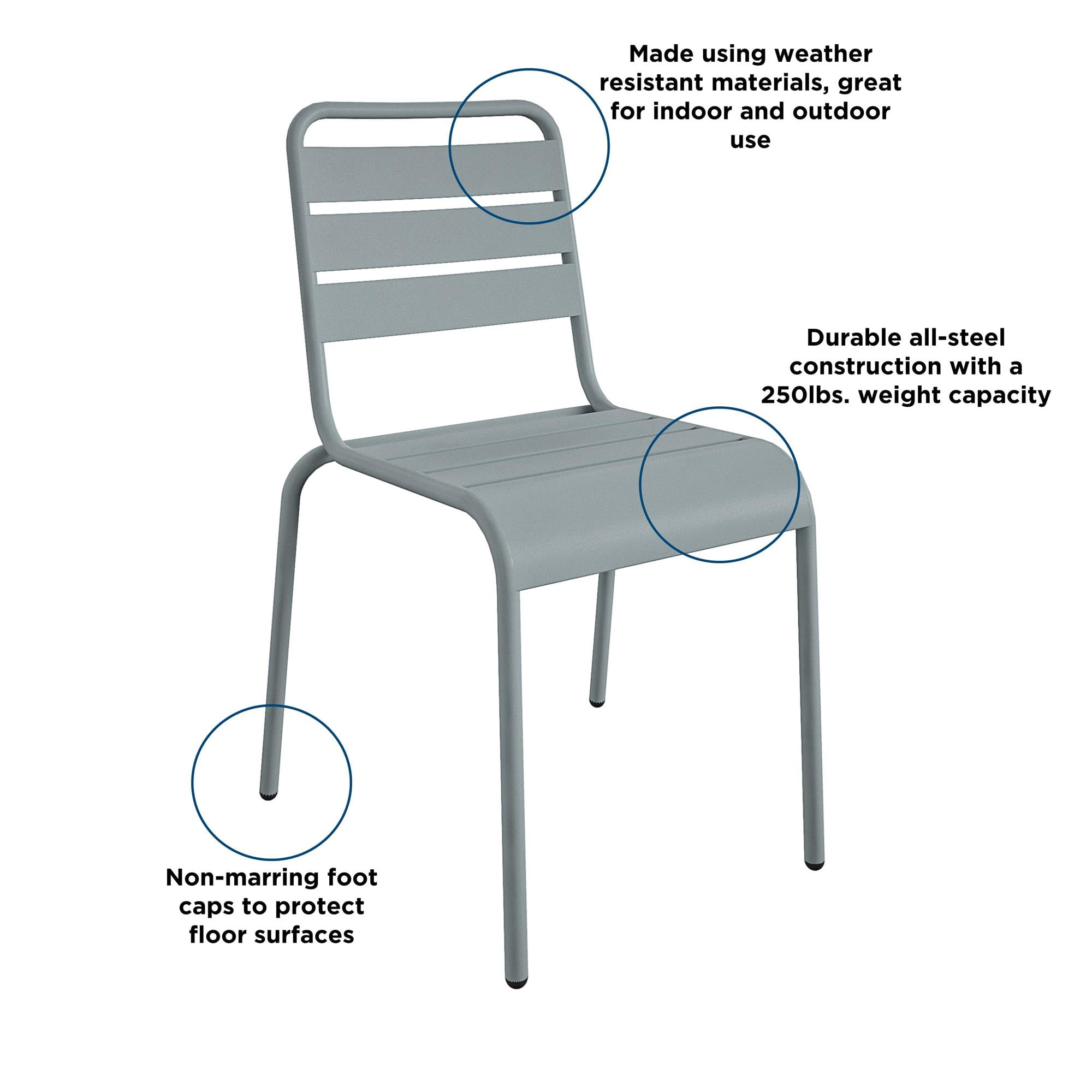Ideal for both indoor and outdoor use, making it great for dinner parties or barbecues. Available in a trendy light gray color to update your dining aesthetic. With no assembly required, these chairs easily stack and store. Constructed using durable and weather resistant steel to withstand the outdoor elements. Features a 250lbs. weight capacity rating.