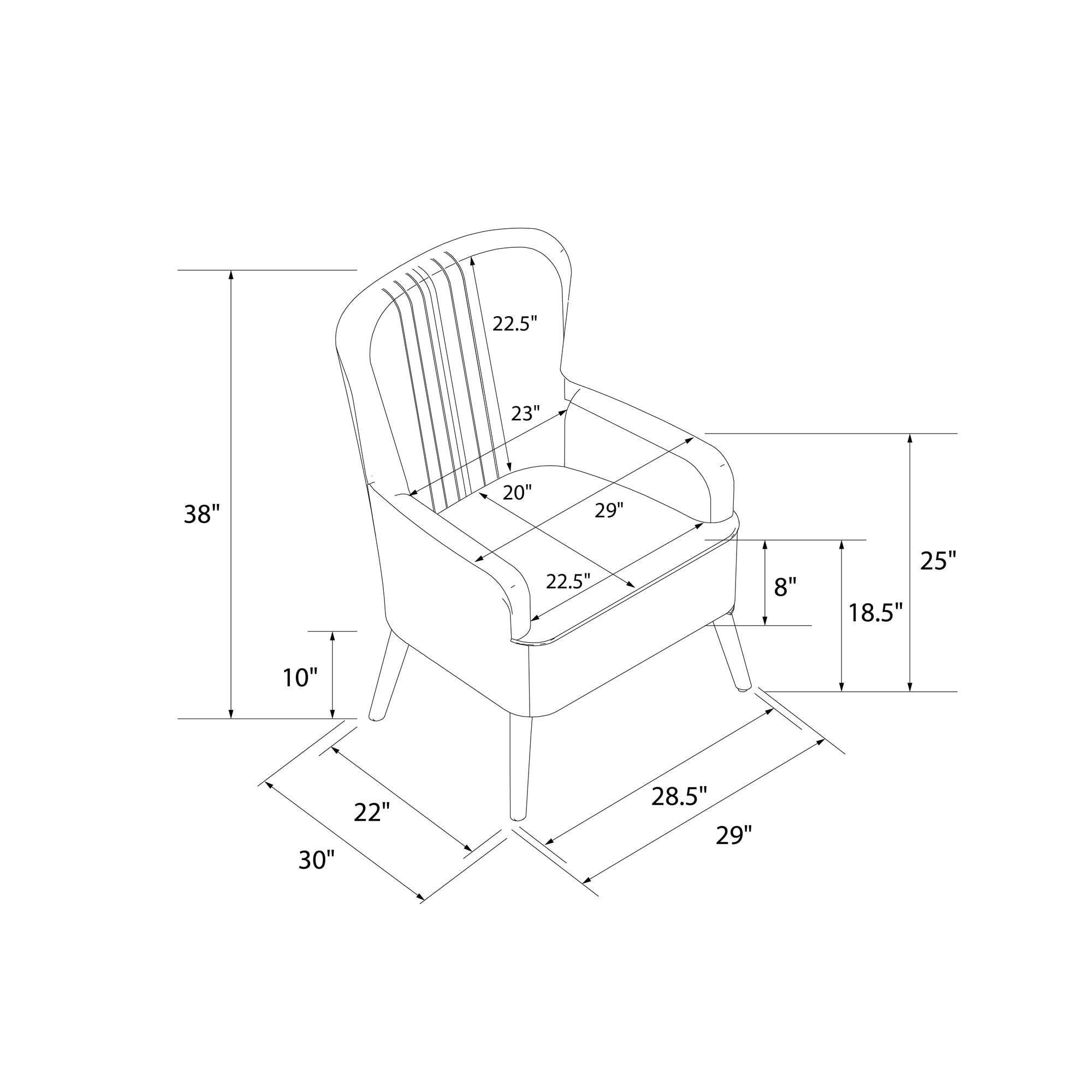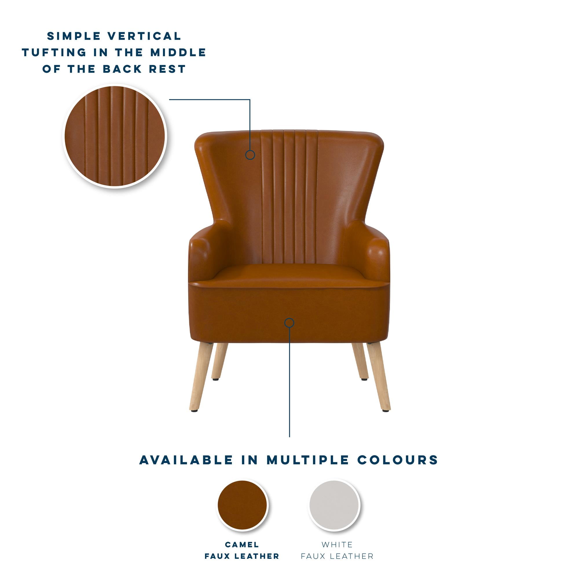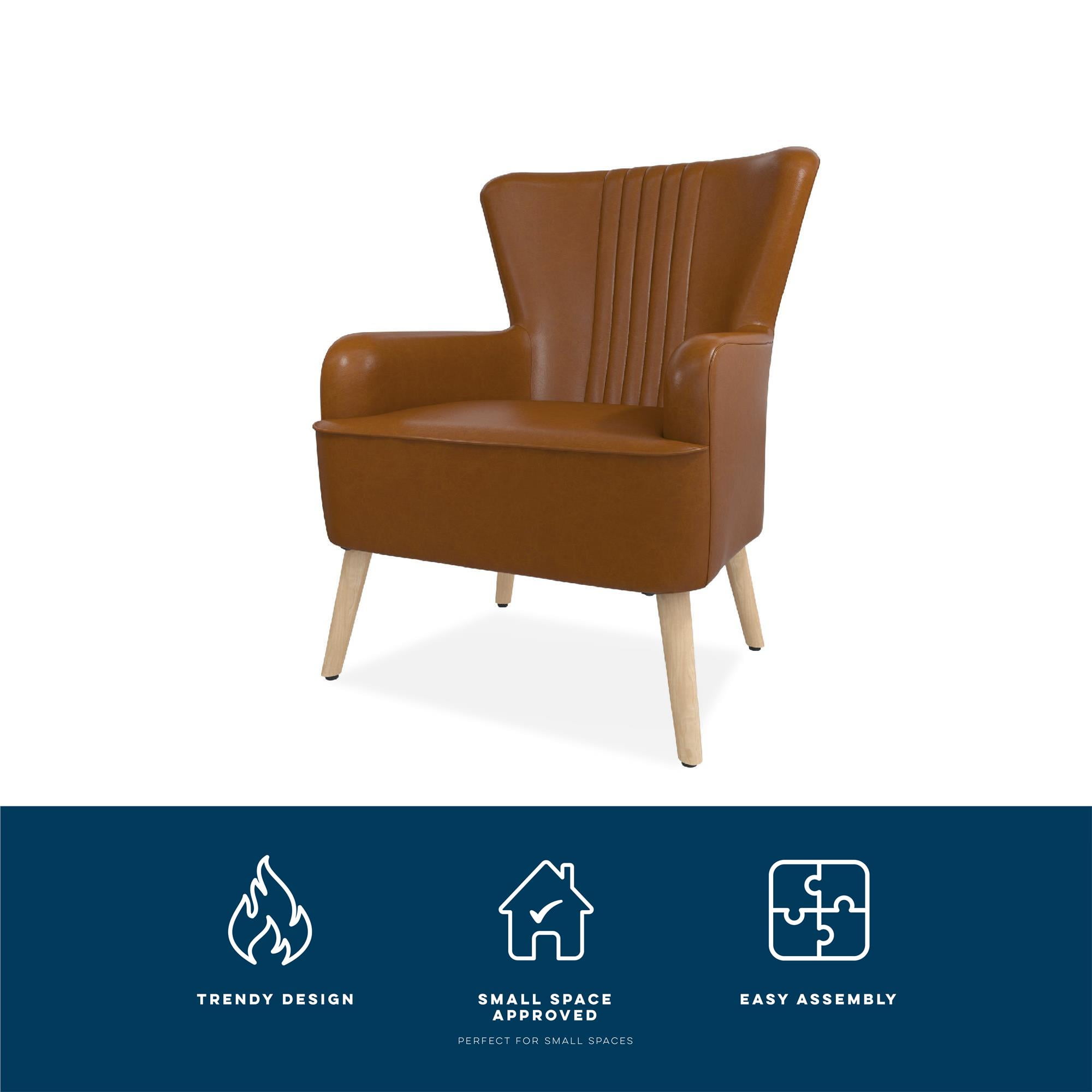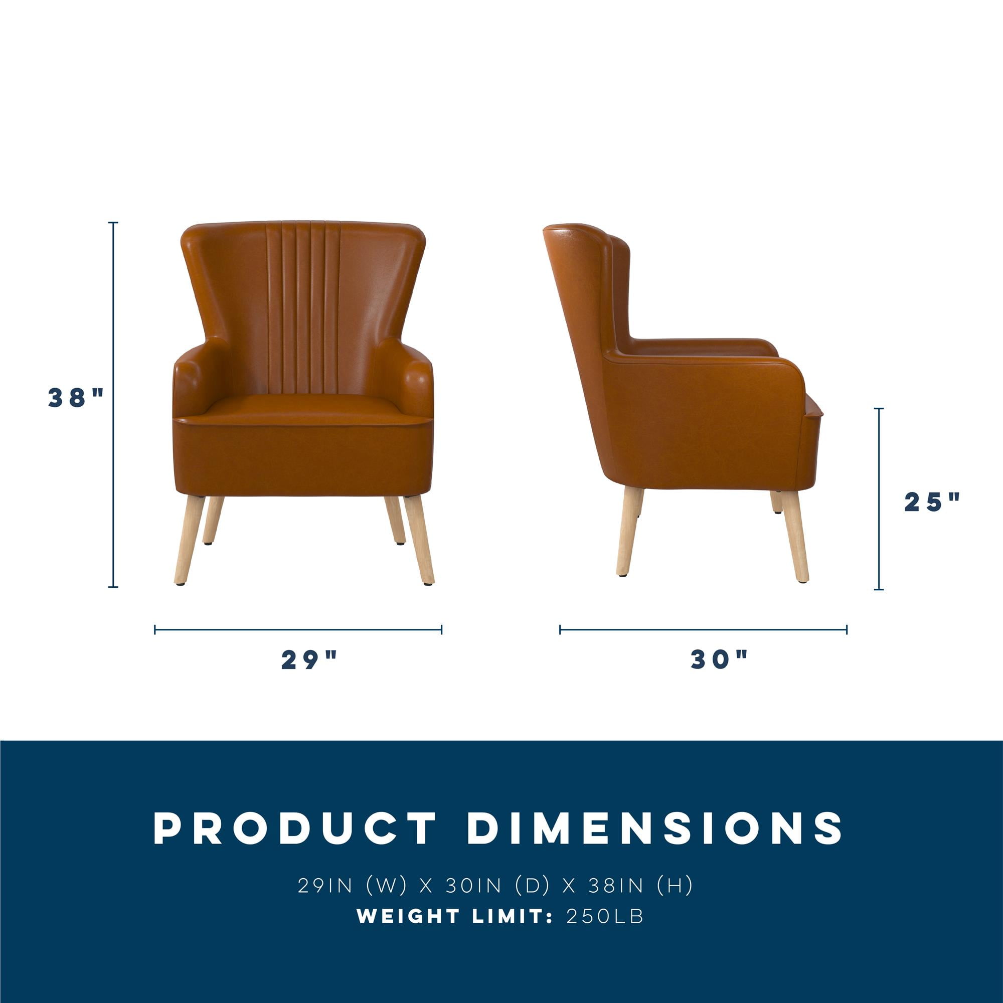 Armchair Admiration: For anyone seeking a posh living room lounge chair or home office desk chair that screams retro sophistication, our soft faux leather upholstered accent chair with mid-century modern design is the perfect mix of comfort and style Welcoming Wing Chair: Sporting an hourglass shape with natural stain solid wood slanted legs and center vertical channel tufting on the curved backrest, our reading chair looks beautiful in a master bedroom or in the entryway as an occasional chair Strong Style: Whether sitting for minutes or for hours, the accent chair is not only steady but soothing thanks to its hardy wooden frame construction, sag-preventing pocketed coil high-density foam seat, cozy padded armrests, and soft cushioned back Easy-to-Assemble: All parts, tools, and simple-to-follow instructions are included in box, and you will only need to spare 15 minutes maximum to put your piece of seating furniture together, letting you spend more time on the activities that you love Versatile Look: Chair size: 30″L x 29″W 38″H. Seat dimensions: 21″L x 20″W x 18″H. Weight limit: 250 lbs. Net weight: 33 lbs. Enjoy a 1-year limited warranty against manufacturer defects. Height adjustable glider capped legs prevent floor scratches