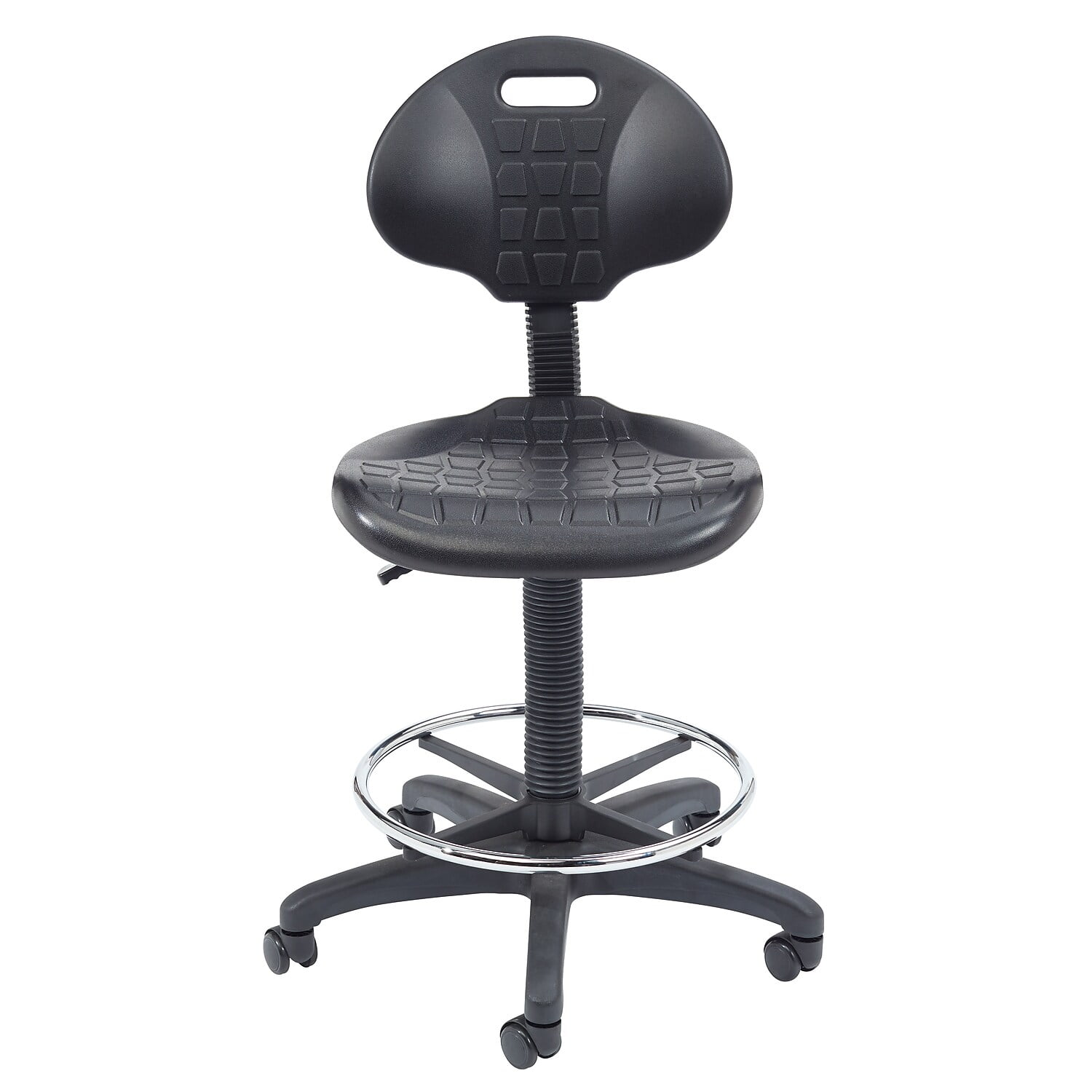 Heavy Duty 1-1/4 Inch Thick Polyurethane Seat With Waterfall Edge Polyurethane Material Is Resistant To Chemicals & Punctures, & Cleans Easily Features Pneumatic Height Adjustment From 22″-32″ Swivels 360 Degrees For Unlimited Functionality Integrated Under Seat Spring System Allows For Control Of Backrest Tilt Degree With A Turn Of A Knob Footrest Adjusts 12 Inches Up Or Down For Comfort Built On Five 2 Inch Industrial Grade Caster Wheels For Portability Or Install Included Mushroom Glides For Use In A Stable Environment Promotes Natural Sitting Posture With Lumbar Support Convenient Backrest Handhold For Maneuverability