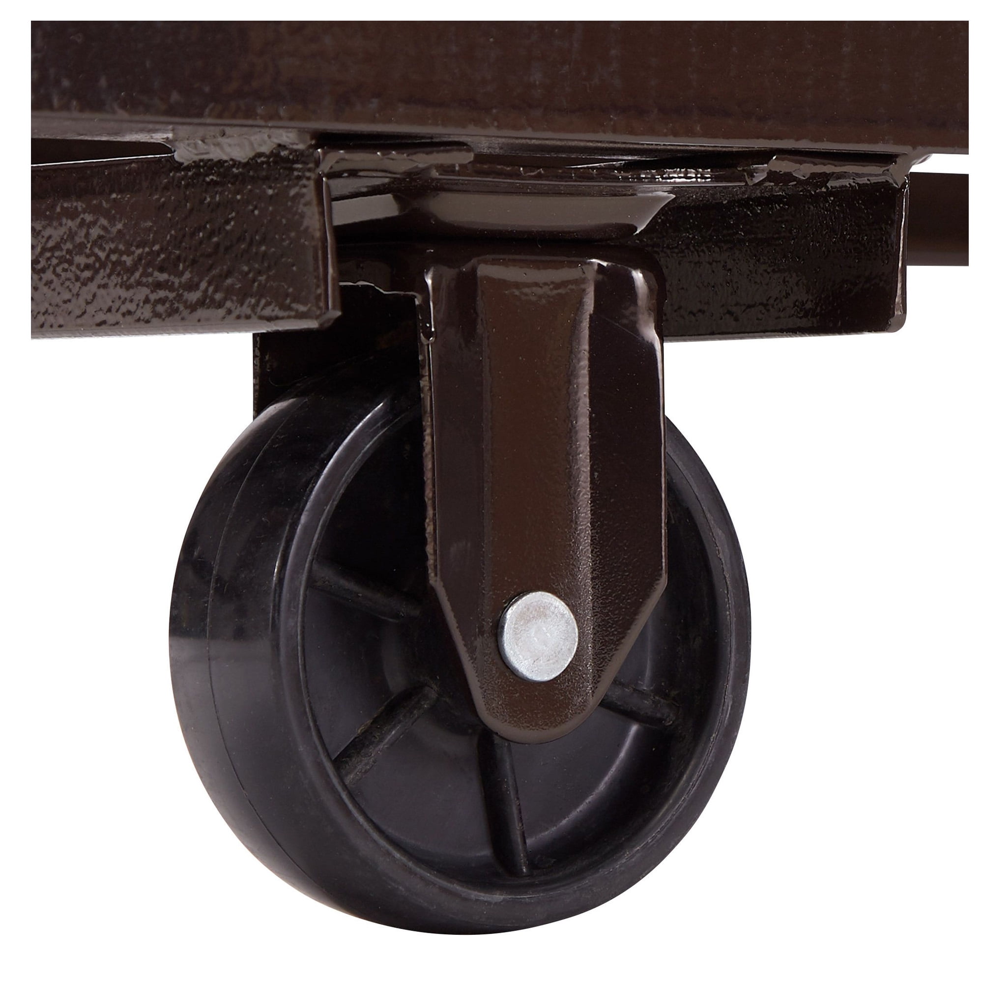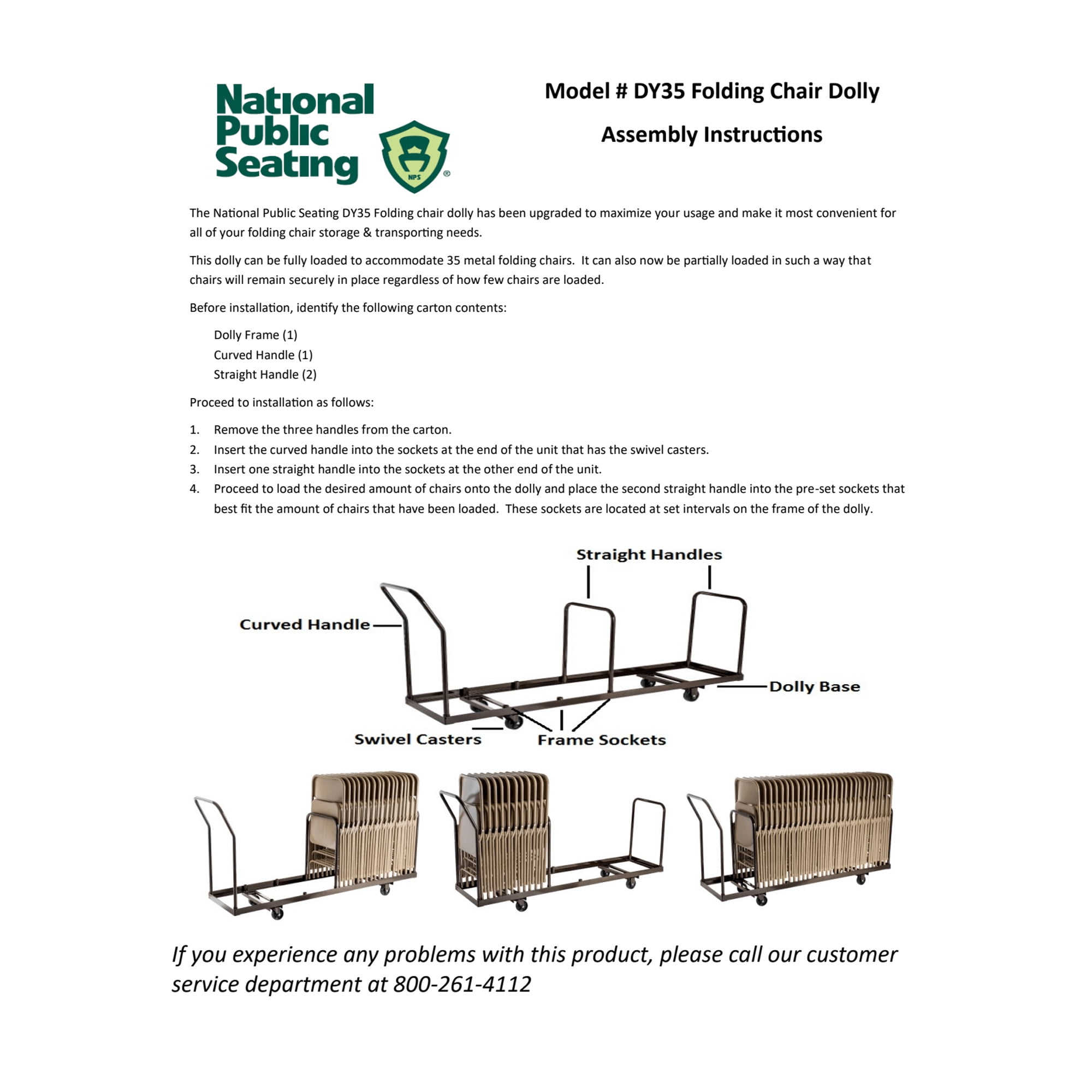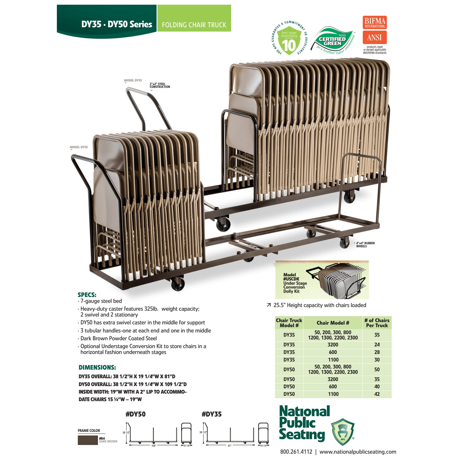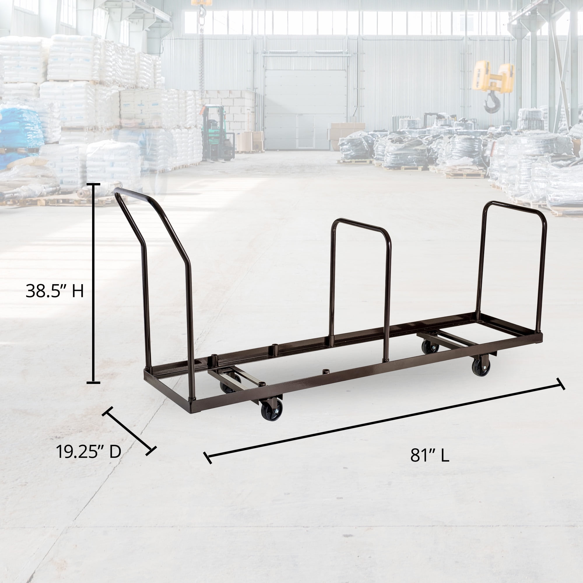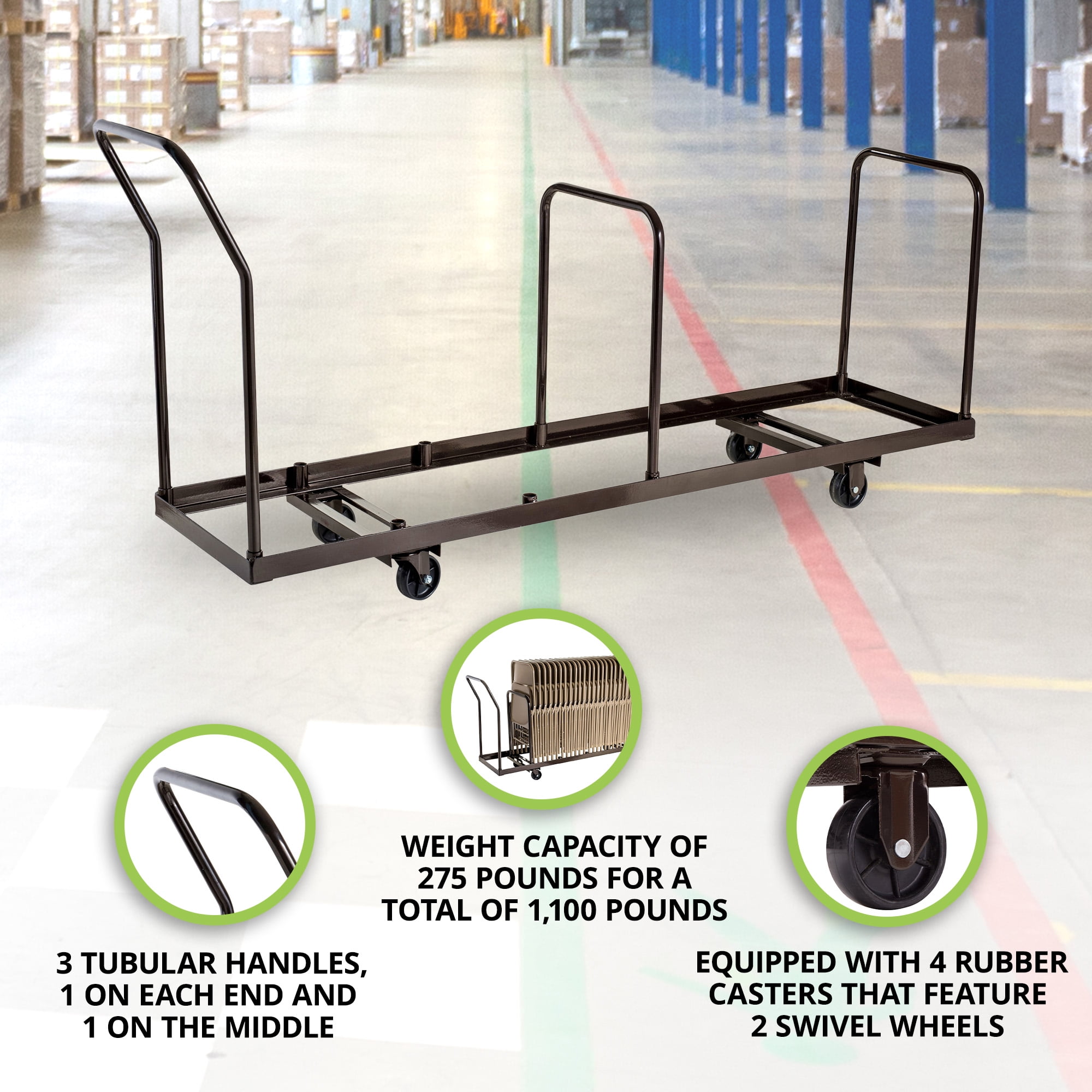 Chair dolly is made to hold up to (35) folding chairs vertically for quick and easy setup Solid steel frame construction provides increased durability with a black finish that will not chip for lasting use Equipped with 4 rubber casters that feature 2 swivel wheels for easy maneuvering over most surfaces Each caster has a weight capacity of 275 pounds for a total of 1,100 pounds overall Comes with 3 tubular handles, 1 on each end and 1 on the middle, giving you the ability to choose how to transport Comes in 4 pieces with assembly instructions and can be easily constructed in as little as 4 steps, and no tools will be needed Color: Brown Dimensions (L x W x H): 81 x 19.25 x 38.5 inches Weight: 58 pounds Manufacturer warranty: 7 Years