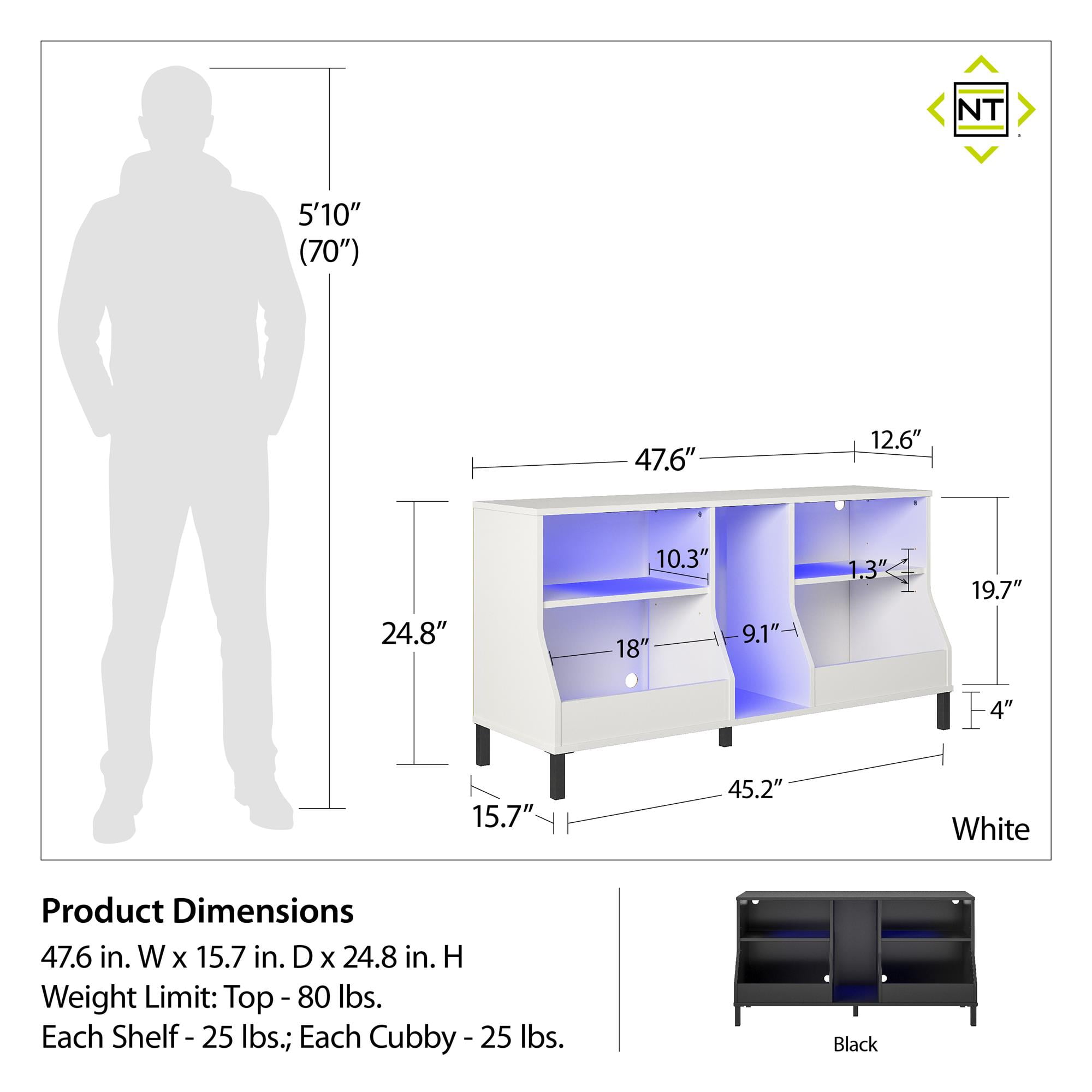 If gaming is your teen’s favorite pastime but tripping over all their games is not your idea of a good time, we’ve got you covered. The Falcon Youth Gaming TV Stand from NTense not only looks great with its open concept design and ARGB color changing light strip, but it also delivers an optimal gaming organization solution to fit gaming systems, games, controllers, and gadgets all in one convenient TV console. The Falcon is rated to fit up to 50″ TV and features two adjustable shelves, a center section to fit your teen’s Xbox or PlayStation, and two open cubbies to keep controllers, games, and headsets off the floor and out of harm’s way. The ARGB lights allow you to customize your LED display to multi-color or single-color settings using the included remote control. The TV Stand ships flat to your door in one box and requires assembly. Two adults are recommended to assemble. Assembled overall measurements: 24.84″ H x 47.64″ W x 15.75″ D.