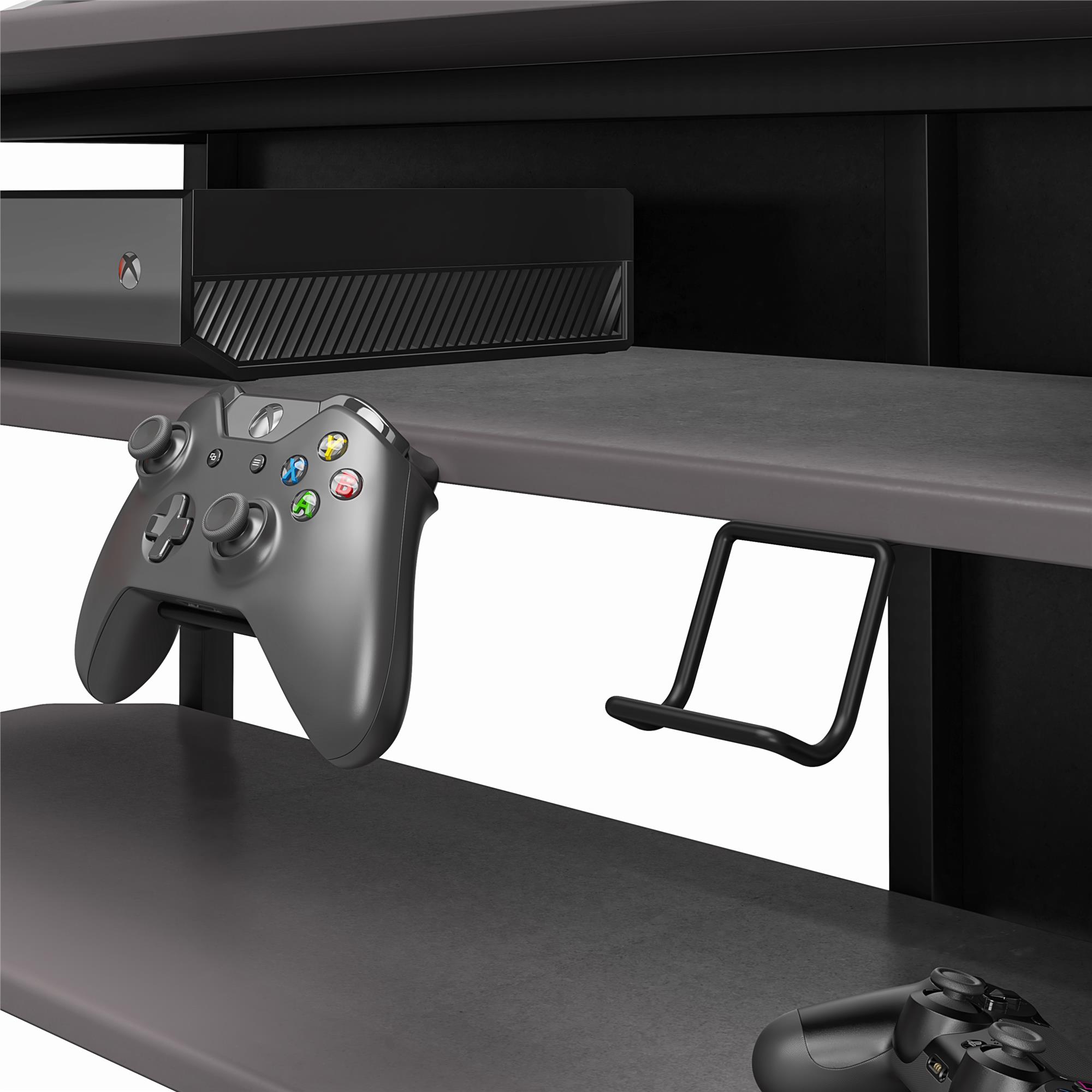 NTense Gamers unite! The NTense Quest Gaming TV Stand for TVs up to 65″ brings the party to you with room for all your gaming gadgets. You’ve got a PS4, Nintendo Switch, Xbox, old school games and handheld systems that need a designated spot? We’ve got you covered. This two-tier stand can hold it all, while keeping two controllers, and two headsets neatly hung and protected from the front and sides of this bad boy. No more searching between the couch cushions for controllers when it’s go time or cringing with fear when your buddy accidentally steps on your headset. We thought you’d like that. Saving friendships, we do that too. Made of painted MDF with a sturdy powder coated metal frame, this gaming control center has enough HP to go the distance. The graphite on matte black metal stand will look slick against all your gaming components. Store your systems, games, controllers, headsets, and big screen TV on the stand that does it all. Once that’s all out of the way, the only thing left to do is slay. Game on. The stand ships in 1 flat carton directly to your door and requires assembly upon opening. Two adults are recommended to assemble. Top of stand holds flat screen TV’s up to 65″ and up to 120 lbs. Middle and bottom shelf hold up to 40 lbs. each. Once assembled, the stand measures to be 20.6″H x 59.5″ W x 19.6″ D. Assembled approximate weight, 72 lbs.