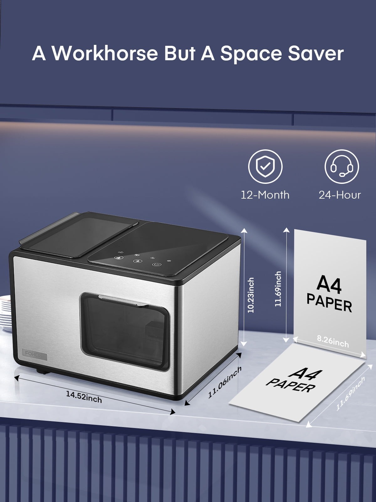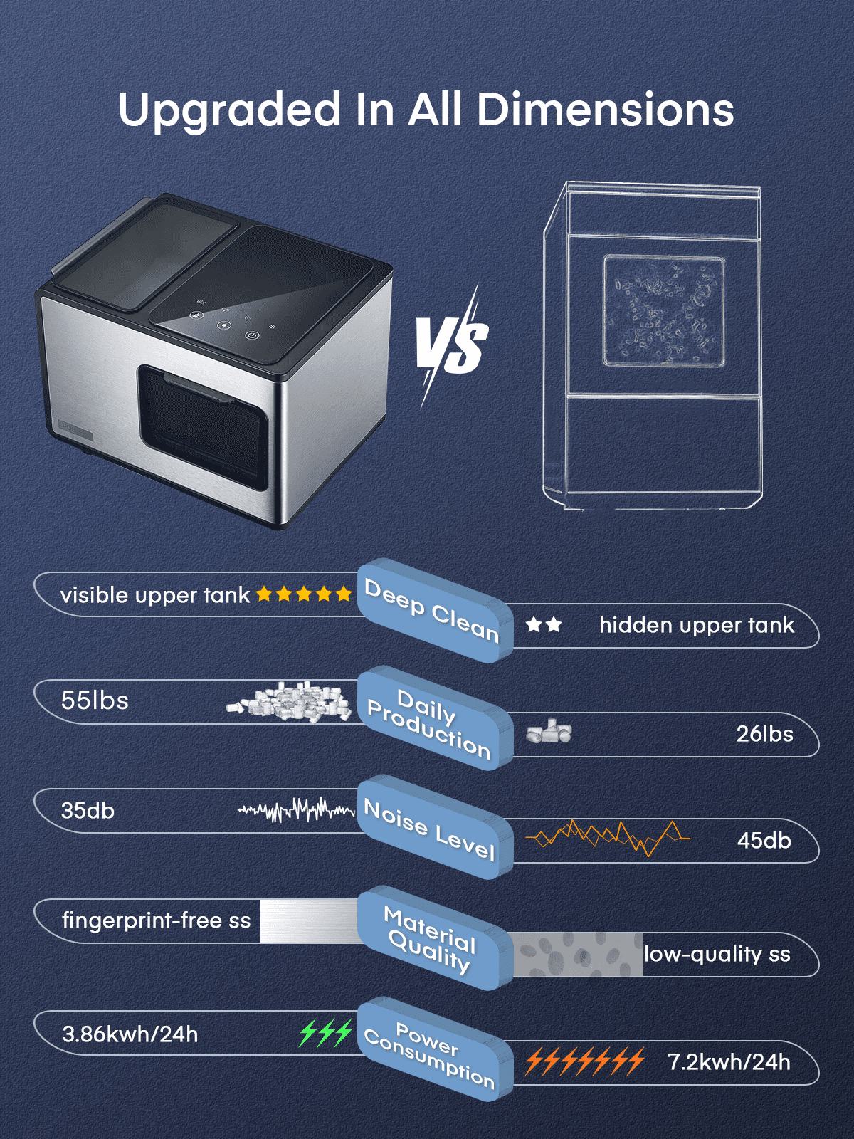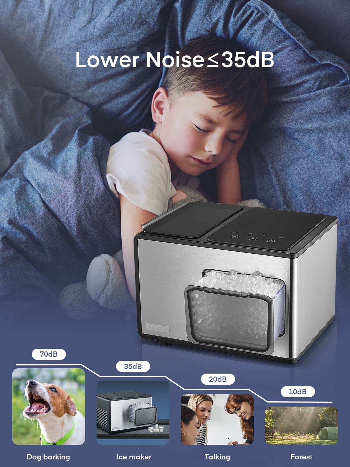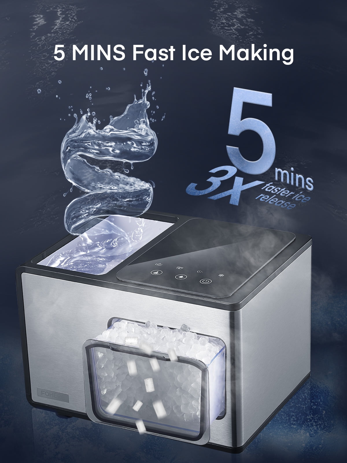 【55lbs of Ice per Day】 A powerful compressor plus a 3Qt water tank allows the FOHERE nugget ice maker to produce up to 55 lbs of ice per day. Plus an ice basket that holds up to 5.3 lbs, you are never going to run out of ice. 【Get It in 5 Minutes】 Churning out ice within ONLY 5 minutes, keep cool drinks flowing with ice on demand from the FOHERE V4.0 countertop nugget ice maker. 【Self-Clean】 Use the self-cleaning function to keep your ice cube maker’s interior hygienic and running efficiently for years to come. The convenient drainage valve lets you easily empty after use as well. 【Deeper Clean】 Visible reachable cleanable upper tank is the most important upgraded feature for deeper cleaning, compared to others that have hidden upper tanks which end up being filled with specks of dirt. 【Fingerprint-free Stainless Steel】 Crafted with a high-quality durable stainless steel finish and food-grade materials, this sleek-looking ice maker countertop will keep up with the demands of frequent use. 【Compact & Portable】 With a size of 11.06*14.52*10.23 inches, portable anywhere you need it, simply plug it in and fill it with water, no plumbing is required. 【Keep Ice Longer】 The 3-layer ultra-insulated construction and double-layer heat-insulated window keep your ice colder for longer in the ice basket. The ice retention rate for 3h is 80% at 80℉ ambient temperature. Note: Please note the ice maker is not a freezer. Better use the ice ASAP or transfer it to your refrigerator. 【Auto Features】 Using infrared sensing technology, the energy-saving ice maker machine will stop automatically when it senses the ice basket is full, or when water is low. For maximum water efficiency, unused ice will slowly melt into the reservoir, and ice production will restart automatically so fresh ice is always on hand. 【FOHERE Promise】 Favored by bartenders and restaurants for flavor-absorbing ability, the crunchy nugget-shaped ice will keep you chilled and refreshed. 7*24-hour customer service and 24 months of after-sale service; Please feel free to contact us if you have any questions. 【Emergency Alerts】 Please be aware that only the YANYANG and FOHERE Official Stores are authorized retailers of the “FOHERE ice maker”. Any other WMT store is not officially affiliated with us. Do not fall victim to scams. We urge you to report illegal sellers, especially the O*g* seller, who conducted a scam since Dec, 2024 and tricked many customers into it. This seller deliberately lists our products at unrealistically low prices on our product page to lure customers, only to fail in fulfilling orders. This dishonest practice not only leads to customer frustration but also results in negative reviews for our product pages. We have already filed a complaint with the platform. We kindly ask for your support in reporting these illegal sellers and not tolerating such behavior.