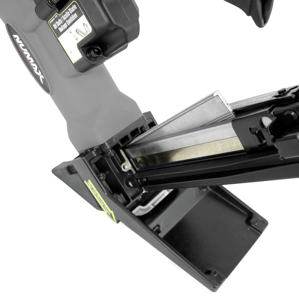 The NuMax S50LSDH Pneumatic 2-in-1 15.5-Gauge and 16-Gauge 2″ Dual Handle Flooring Nailer and Stapler is an excellent choice when installing most 1/2″ to 3/4″ solid or engineered tongue and groove flooring including cherry, oak, maple, and walnut along with bamboo or exotic flooring. This air powered flooring nailer and stapler combo tool comes with three interchangeable base plates, and is compatible with 16 gauge L-cleats from 1-1/2″ to 2″, and 15.5 gauge 1/2″ crown staples from 1-1/2″ to 2″. The dual handle design allows you to use either the short handle or extended handle, depending on whether you prefer to kneel or stand during installation. This convenient option combined with a light strike bumper will really save your back and reduce fatigue when working for long shifts. The semi-quick release nose allows for easy jam removal in the event of a jammed fastener and increases productivity. Professional results are ensured with a no mar foot to protect finished working surfaces. Boasting a lightweight and durable aluminum body, aluminum cylinder, and high quality rubber O-rings, this nailer is designed to last. This combo flooring nailer and stapler is perfect for DIYers tackling home improvement and repair projects, as well as professional contractors at the job site. The Pneumatic 2-in-1 15.5-Gauge and 16-Gauge 2″ Dual Handle Flooring Nailer and Stapler includes a long reach fiberglass mallet with a padded grip and three interchangeable base plates, and is covered by NuMax’s 1 Year Limited Tool Warranty and 30 Day Wearable Parts Warranty.
