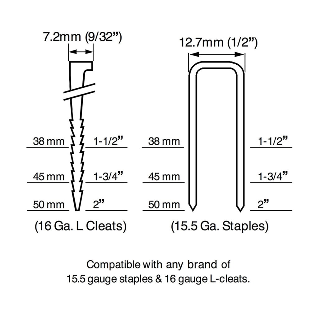 Ideal for installing most 1/2″ to 3/4″ solid or engineered tongue and groove flooring including cherry, oak, maple, and walnut along with bamboo or exotic flooring Compatible with 16 gauge L-cleats from 1-1/2″ to 2″, and 15.5 gauge 1/2″ crown staples from 1-1/2″ to 2″ Dual handle design for kneeling or standing during installation Light strike bumper Semi-quick release nose allows for easy jam removal in the event of a jammed fastener No mar foot prevents damage to finished working surfaces Lightweight and durable aluminum body, aluminum magazine, and high quality rubber O-rings Interchangeable base plates (3) allow you to work on 1/2″ to 3/4″ flooring Includes long reach fiberglass mallet with padded grip