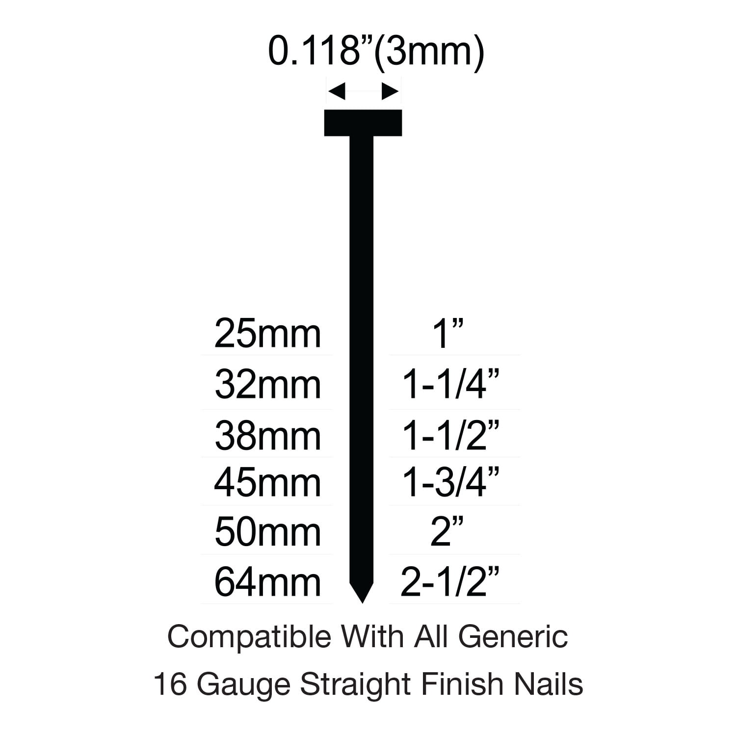 Construction Applications: Designed for trim, furniture trim, rail moulding, crown moulding, window casing, door installation, base boards, chair rails, picture frame assembly, and hobbies and crafts Compatible Nails: 16 gauge glue collated straight finish nails from 1″ – 2-1/2″ Built to Last: One piece hardened steel drive blade results in a durable pneumatic tool resistant to damage Ergonomic Body: Rugged but also lightweight and comfortable for extended use Tool-Free Depth Adjust: Simply turn the depth adjustment wheel by hand to change the driving depth of nails for various projects and materials Quick Jam Release: Allows for easy access clearing in the event of a jammed fastener so you can get right back to work No Mar Safety Tip: Prevents damage to work surface and ensures professional results at home or at the jobsite Comfort Grip Handle: Reduces fatigue during long shifts and increases accuracy of fastener placement 360 Degree Adjustable Exhaust: Conveniently allows user to direct air away from face