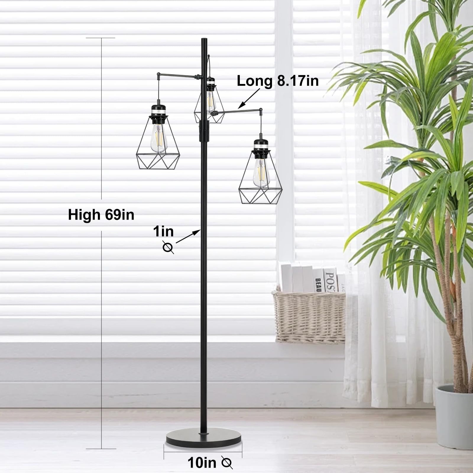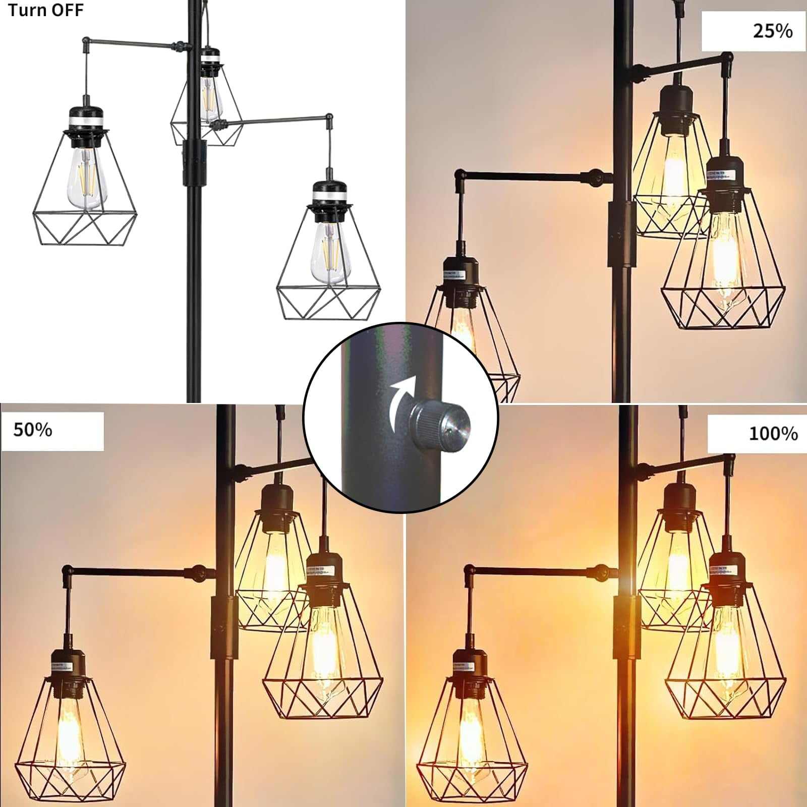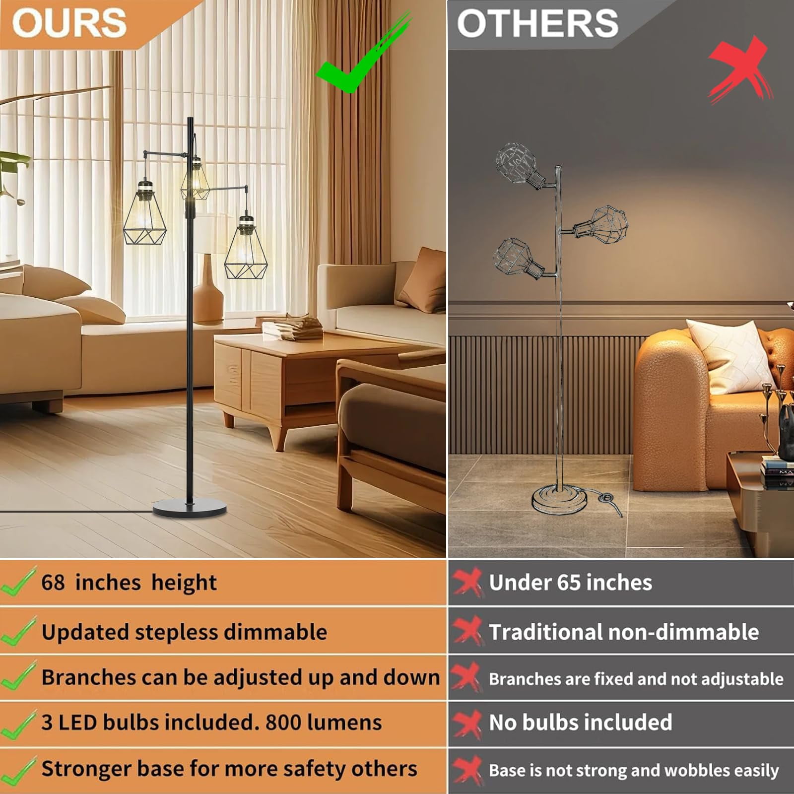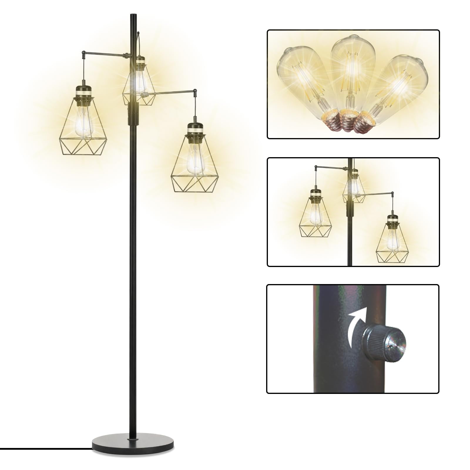 Trihead Tree Floor Lamp W. Stepless Dimming, Vintage Dimmable Standing Light for Living Room/Office, 3x Edison Bulbs Incl.