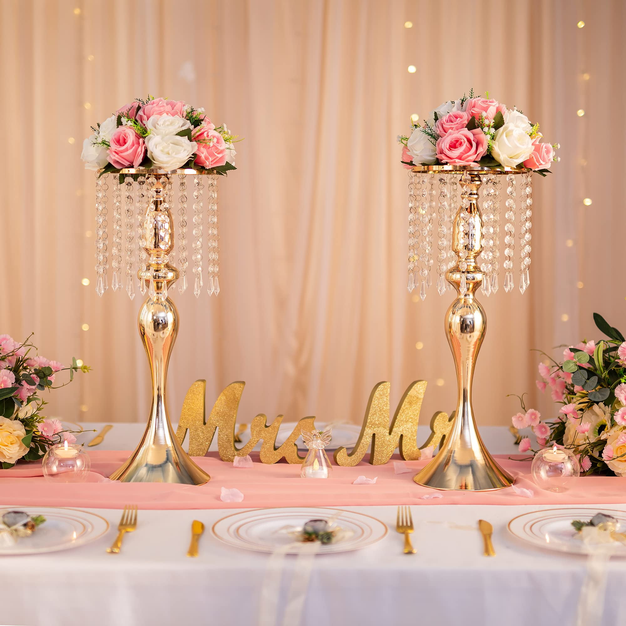 2 HEIGHTS 2 COLORS available for your choices: Size L:7.87×7.87xH21.3″,M:7.87×7.87xH13.8″, this 2 different tall flower arrangement stand for wedding will meet your various creative decorative centerpiece ideas. Easy to Assemble: No tools required. Nuptio gold vases for centerpieces can be quickly installed. We provide a Detailed Instruction Manual and an Installation Video that can help you install the wedding centerpieces for tables without any difficulty. ELEGANT DESIGN: twist-design, this crystal centerpiece riser looks beautiful and elegant for head table decor or sweet table or reception decoration for weddings, events, parties. VERSATILE USE: this tall wedding centerpiece holder helps dress up your head table or sweet table or reception tablescapes, also fit for daily home decoration or home dinning tablescapes, festival decoration. SLEEK AND SHINY: sophisticated surface finish, gives this center piece riser more charming look; flowers, crystal touch, beautiful tone from this flower arrangement holder, really an eye-catcher in a wedding, baptism, quinceanera, birthday, anniversary graduation events.