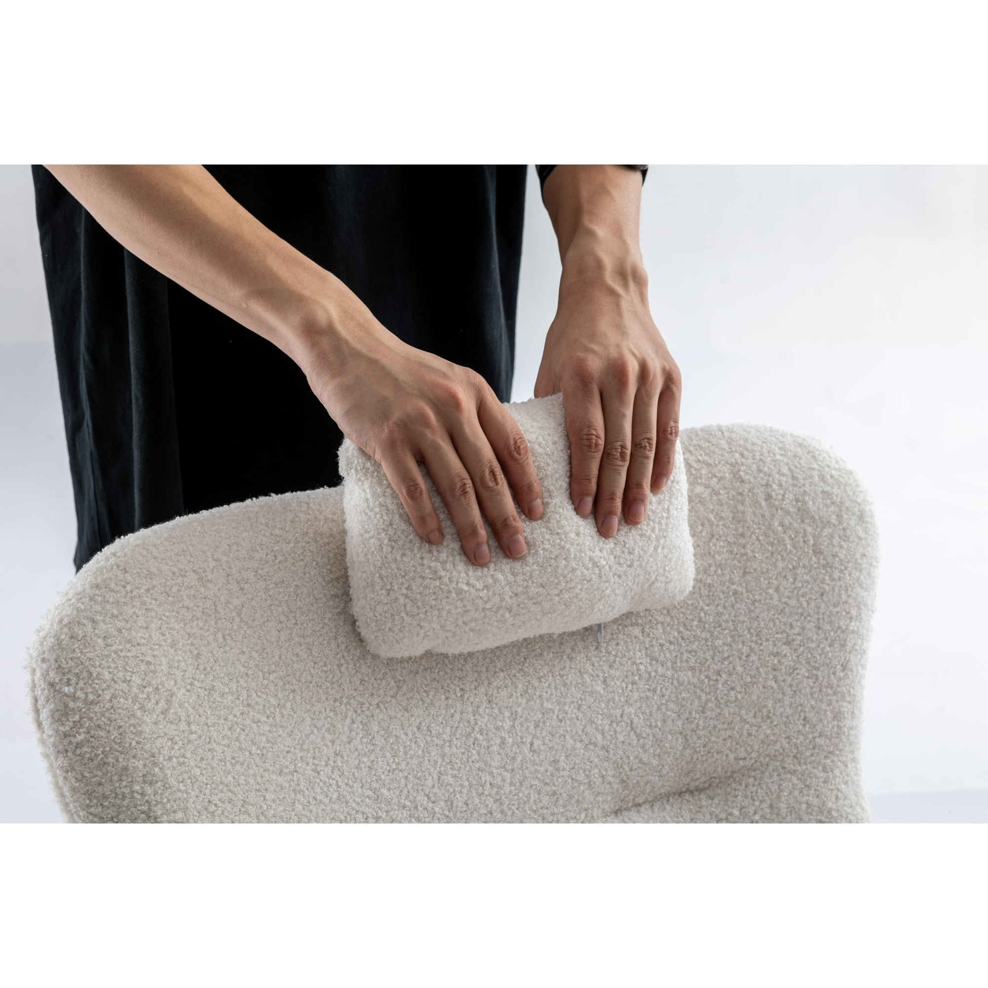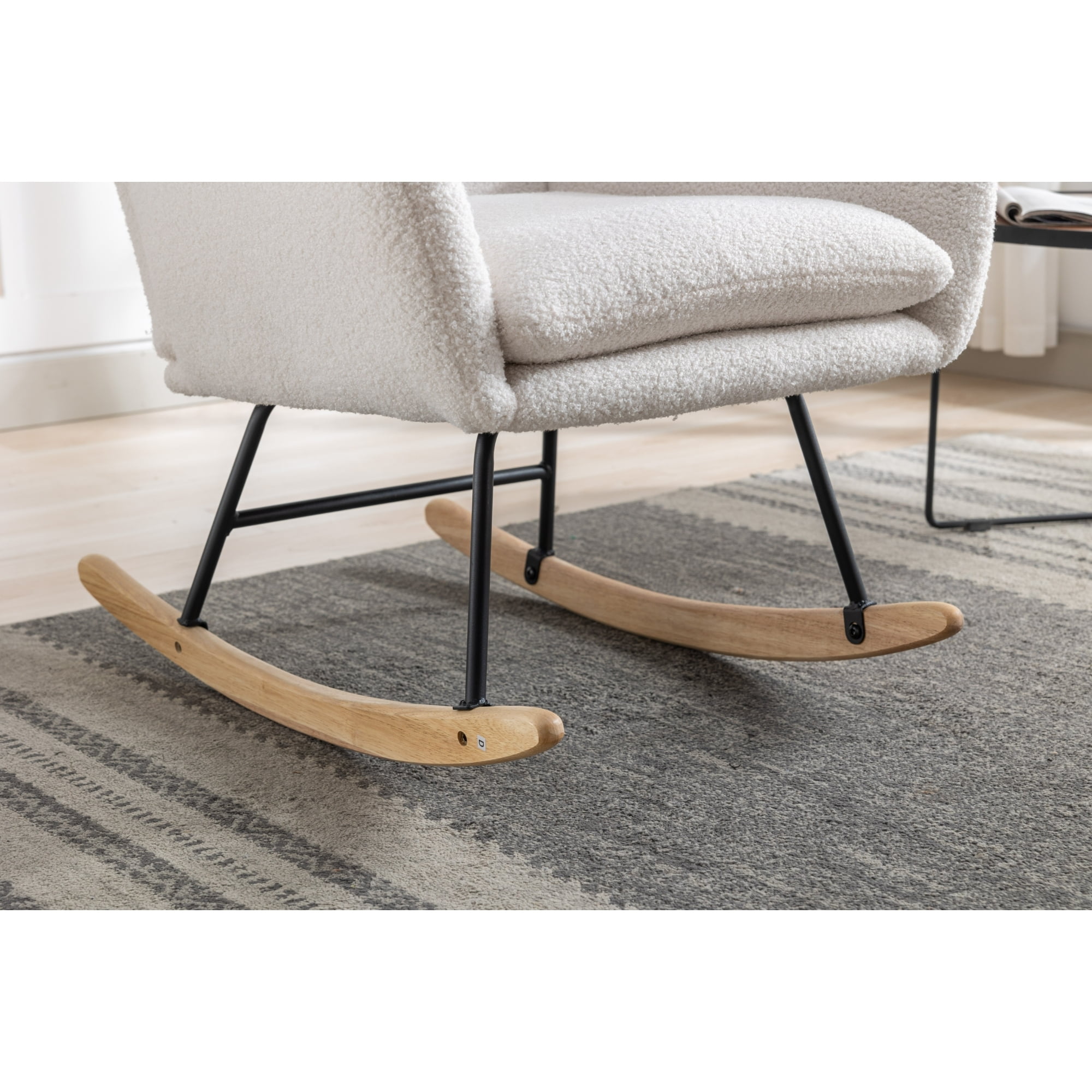 [Super Comfort]Covered with soft teddy fabric and filled with a high-density soft sponge, our modern rocking chair can bring you a gentle touch and ultimate seating comfort. The well-cushioned generous seat depth and width provide ample seating space and give you a comfortable experience [Ergonomics Design]Designed with ergonomically curved wing back and armrests, the rocking chair can support your body well without causing back pain and provide soft sitting for a long time. The waterfall-shaped seat edge can effectively release the pressure on the thighs and bring a comfortable sitting experience [Gentle Rocking]Made of a safe metal frame, the nursery rocking chair provide stable support and has excellent curved legs, making it rock gently and smoothly. Such a sweet design is the perfect centerpiece for the nursery. Additionally, the right armrest has a large pocket on the side for magazines and TV controls [Sturdy & Durable Construction]The rocker relax chair is made of steel and solid wood, which ensure great stability and a high load capacity of 250 lbs. Enough long curved legs are made of solid wood to protect your floor [Compact Structure & Easy Assemble]The rocking chair is compact and won’t take up much space, it will be a perfect addition to all places, no matter bedroom, living room, porch or office. This rocker chair can be easily assembled within 20 minutes, what you should do is just tighten all the screws. Overall dimension: 35.5”H × 25.2”W × 30.3”D. Load capacity: 250 lbs