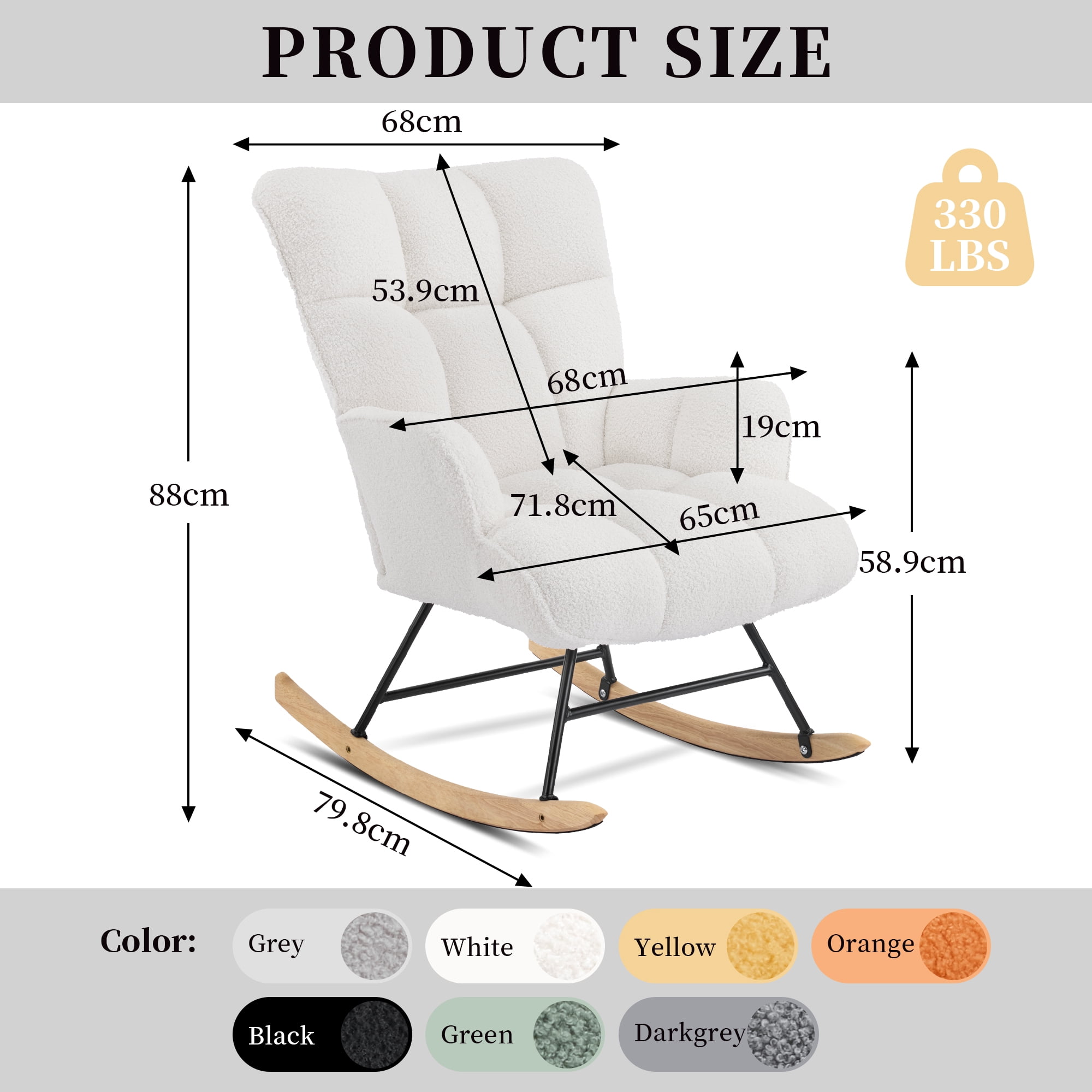 ERGONOMIC ENOUGH: SAETSFEG rocking chair incorporates ergonomic design principles, aiming to alleviate fatigue and provide a comfortable environment to some extent. The armrests are positioned optimally, and the overall swinging motion offers the best experience while ensuring stability. HIGH QUALITY: Nursery glider chair is crafted with a high-quality iron frame to guarantee overall structural stability and withstand a weight of up to 250-301 pounds. The wooden legs are designed for lon g-lasting use. The luxurious teddy fabric ensures a pleasant touch, and it is gentle on the skin. The seat cushion and backrest are generously filled with sponge to ensure optimal comfort when seated. The silent strips not only provide slip resistance but also allow for noiseless rocking. GREAT NURSERY: Upholstered accent rocker is a comfortable place to sit, feed your little one, and soothe them is essential, and it sometimes the coziest options for the job and rest. It’s a piece of furniture that is great for reading books during toddlerhood and beyond. EASY TO INSTALL: Our rocking chair is incredibly easy to assemble. Typically, it takes only ten to fifteen minutes to assemble, and it can be easily done by one person. The product comes with tools that can aid you in the assembly process. OUR COMMITMENT: Our product comes with a warranty period of up to one year. During this time, if you require any assistance or have any other questions, feel free to contact us. We are committed to maintaining long-term communication with you. Our goal is to ensure customer satisfaction
