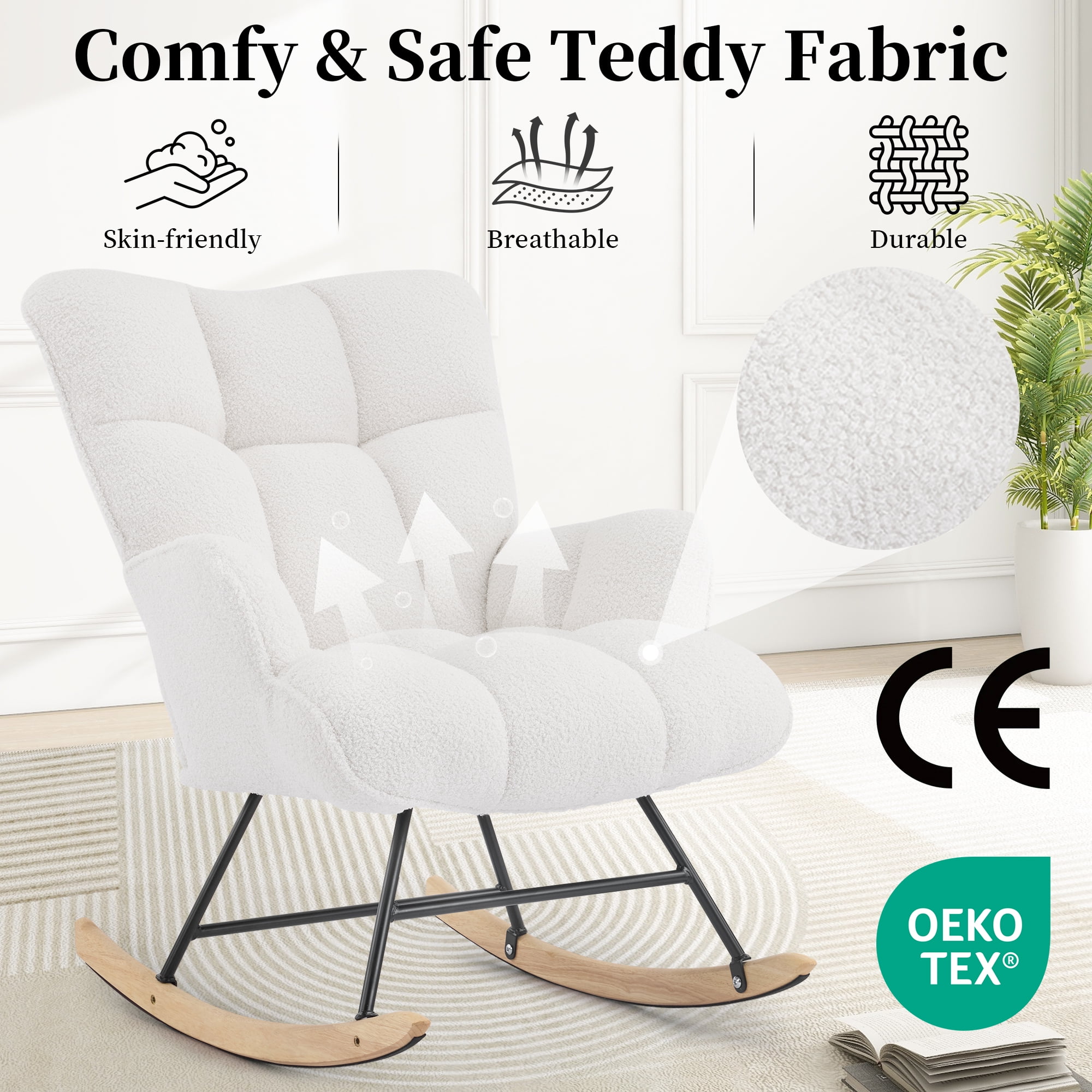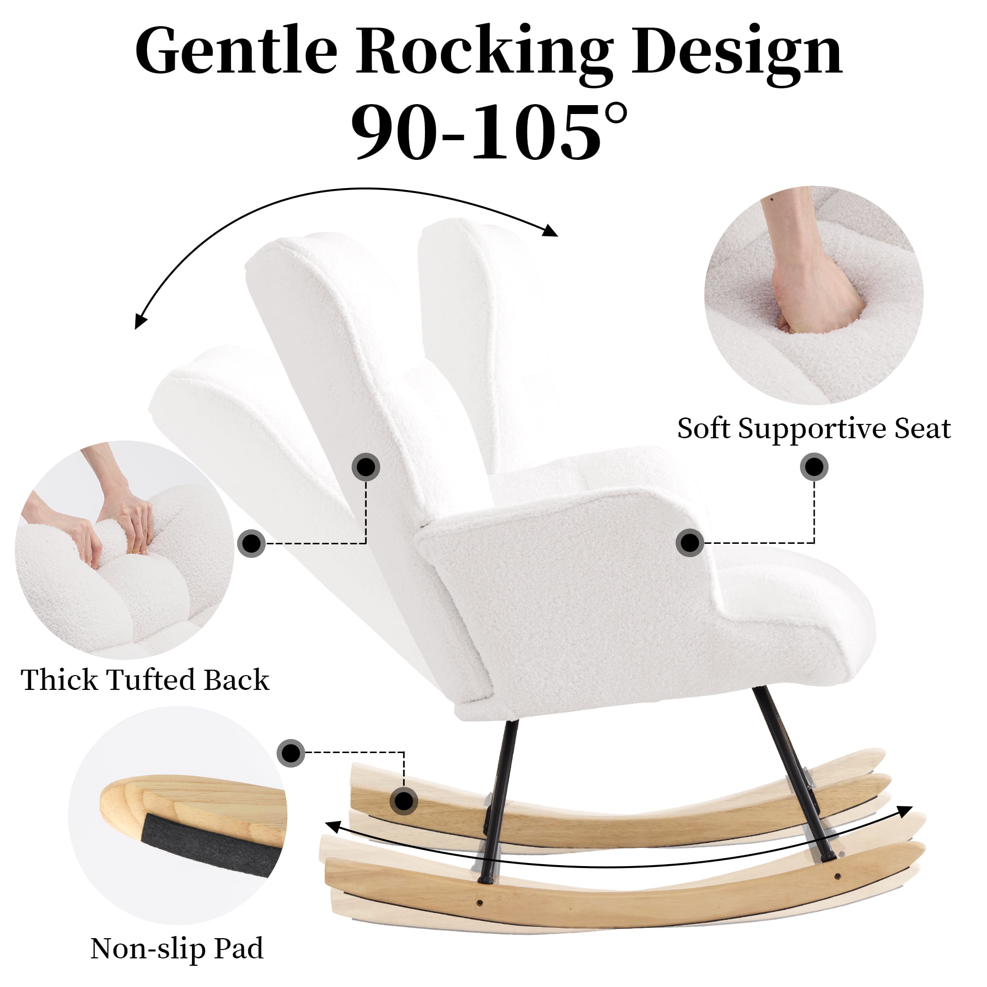 The teddy velvet rocking chair features comfortable fabric. The rocking chair comes with a high backrest and soft cushion, providing a more comfortable sitting experience Comfortable stylish accent armchair,relaxing your arms. Brand:SAETSFEG Color:White Product Dimensions:34.65″D x 25.6″W x 34.37″H Back Style:Tufted Back Special Feature:Rocking Chair, Ergonomic, Glider Chair, Rolling, Head Support Material:Wood, Iron Item Weight:26.53 Pounds Frame Material:Alloy Steel & Wood Seat Material Type:Wood Brand:SAETSFEG Color:White Product Dimensions:34.65″D x 25.6″W x 34.37″H Back Style:Tufted Back Special Feature:Rocking Chair, Ergonomic, Glider Chair, Rolling, Head Support Material:Wood, Iron Item Weight:26.53 Pounds Frame Material:Alloy Steel & Wood Seat Material Type:Wood