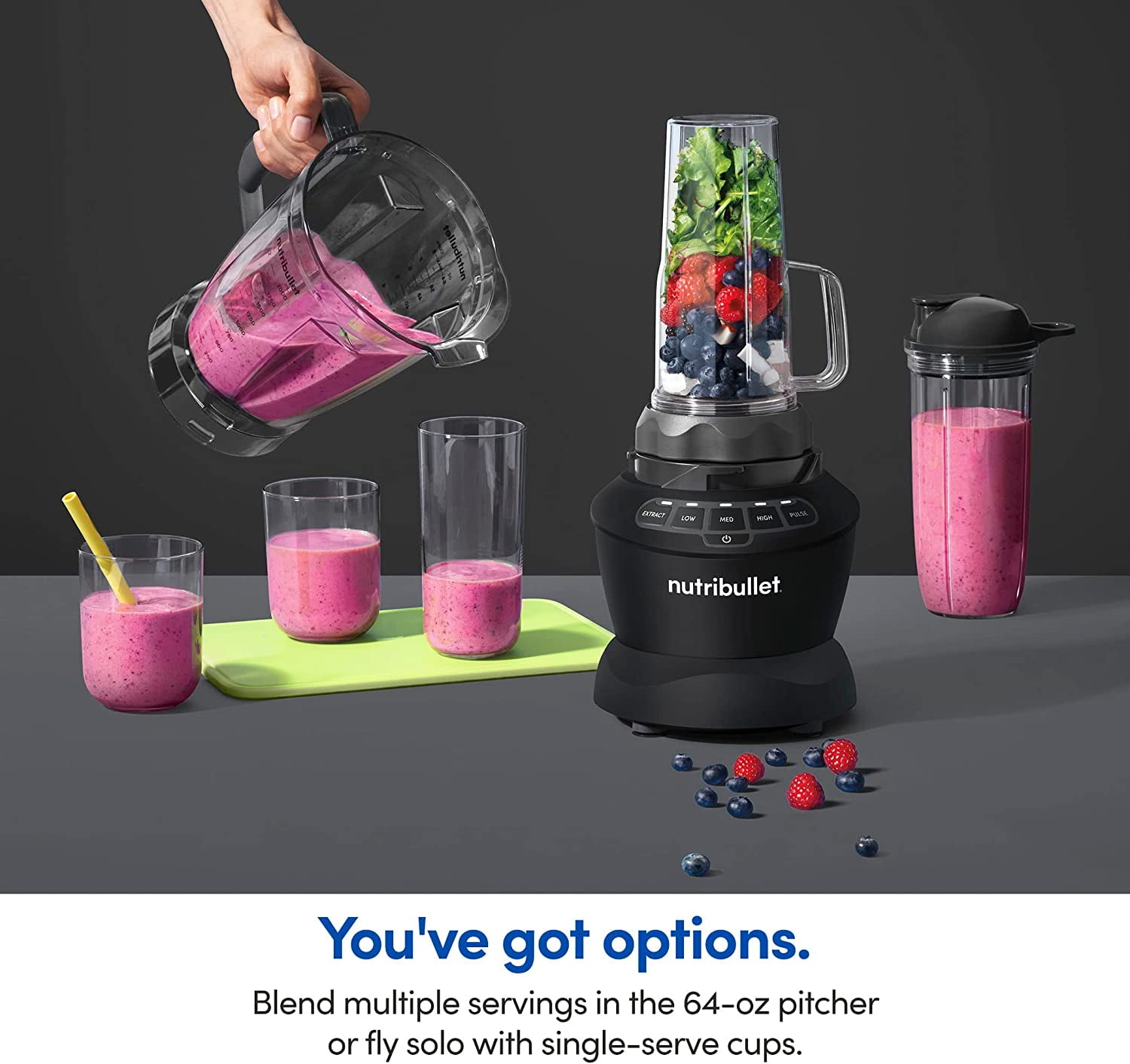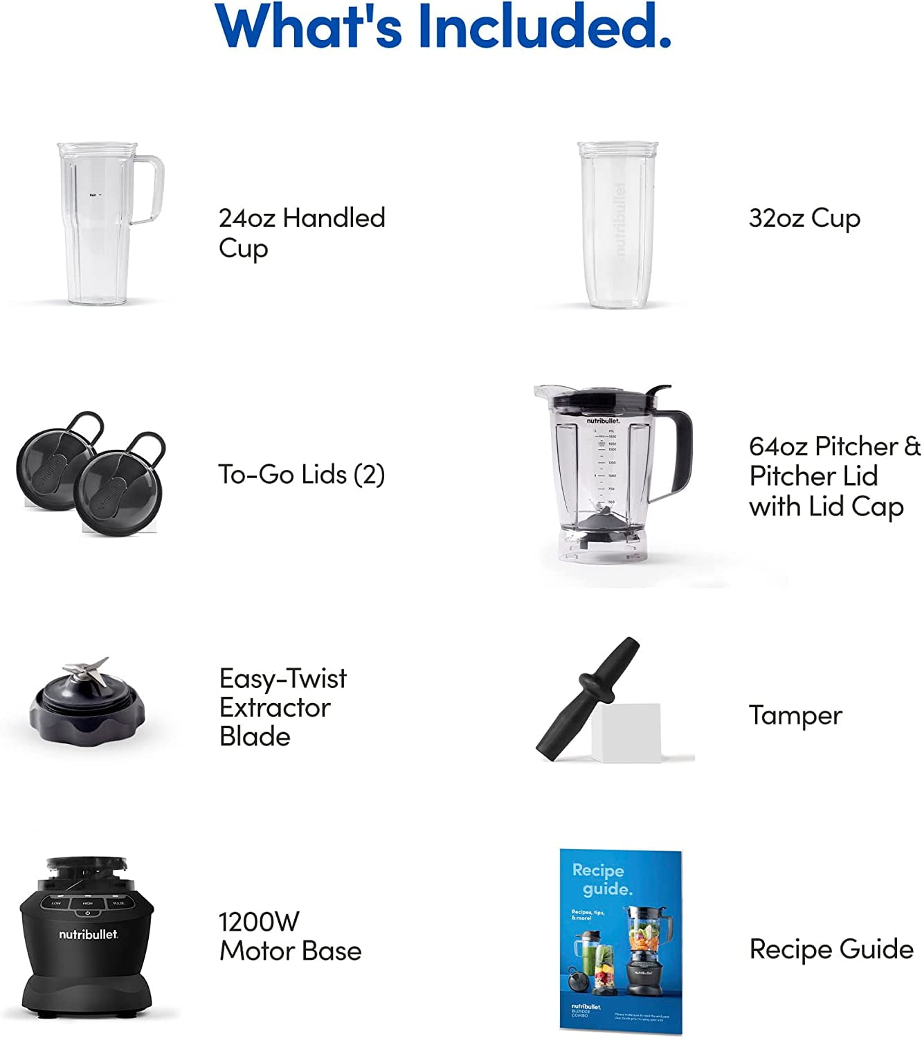 nutribullet Blender Combo will take your nutrition extraction to the next level with the versatility of both a multi-serving pitcher and a single serve cup. Three precision speeds, a pulse function and the Extract program offer full control at the press of a button. 1200 Watts of power let you make an endless array of smoothies, soups, sauces, nut butters and beyond. Includes: (1) 1200 Watt Motor Base, (1) 64 oz (1.9L) Blender Pitcher with Lid and Vented Lid Cap, (1) Tamper, (1) 32 oz (900ml) Cup, (1) 24 oz (700ml) Handled Cup, (2) To-Go Lids, (1) Easy-Twist Extractor Blade, and Recipe Book The Easy-Twist Extractor Blade is made of powerful stainless steel and designed with cyclonic action. Our super-durable BPA-Free pitcher and cups are made of high-performance plastic Unit Dimensions: 7.75 Lx 8.07 W x 16.97 H Hassle-free cleaning – simply place pitcher and cups in the dishwasher and rinse the easy twist extractor blades with soap and water. This item includes a 1 year limited warranty.