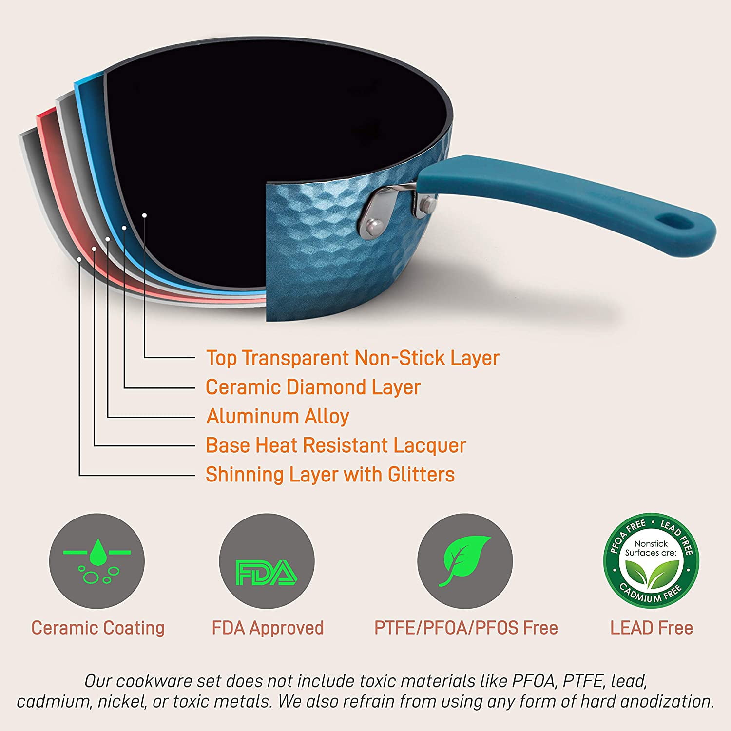 11-piece non-stick kitchenware set features stylish modern cookware design elegant diamond pattern to elevate any kitchen Includes 1.7-quart saucepan pot with lid, 3.6-quart Dutch oven pot with lid, 2.1-quart cooking pot with lid, 11-inch large fry pan, 8-inch small fry pan, soup ladle, pasta fork, and spatula Pots set features cool-touch and form-fitting handle grips for comfortable use Effectively distributes and retains heat for even cooking all-around See-through tempered glass lids with vent holes allow steam to escape Safe for use with gas, electric, ceramic, and induction counter cooktops Made of reinforced forged aluminum with a coating thickness of 25-35um, 3.5mm multi-layered Color: Silver Cook Pot Size (L x W x H): 12.2 x 7.9 x 3.7 inches Saucepan Pot Size (L x W x H): 14.3 x 7.1 x 3.6 inches Dutch Oven Pot Size (L x W x H): 13.7 x 9.5 x 4.1inches Small Fry Pan Size (L x W x H): 15.1 x 7.9 x 1.6 inches (with handle) Large Fry Pan Size (L x W x H): 19 x 11 x 2 inches (with handle) Weight: 16.14 pounds