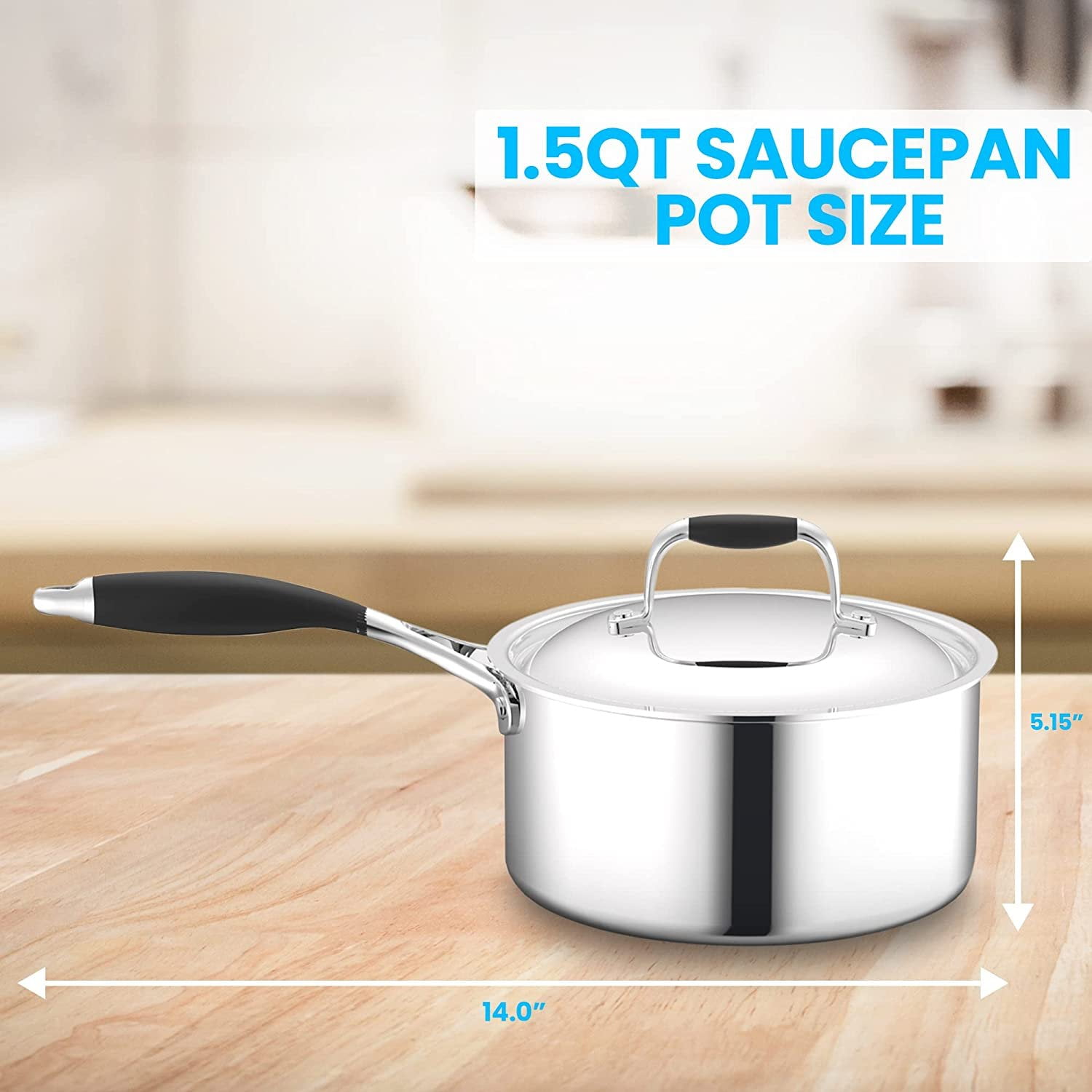 WORKS WITH MODEL NCSSS12: This 3-quart Nutrichef Saucepan with Stainless Steel Lid works with NutriChef NCSSS12 Cookware Set that comes in 12-piece pots and pans including saute pan, saucepan, stockpot, steamer insert, frying pans, lids STAINLESS STEEL SATIN INTERIOR: This stylish kitchenware features a stainless steel satin interior that won’t react with acidic foods for superior performance. Just add a thin layer of oil to prevent the food from sticking SUPERIOR QUALITY: Made with 2.5mm clad stainless steel, this saucepan will surely prove its longevity in the long run. It can handle a max heat temperature of 450° Fahrenheit. It is also stain-resistant and dishwasher safe so easy cleaning is guaranteed ERGONOMIC HANDLES: Features ergonomic silicone wrap handles for comfortable handling & cooking. Offers a stylish & modern design w/ satin interior and polished exterior adding an elegant touch that complements your existing cookwares COOKTOP COMPATIBILITY: Cook anywhere and however you would like as this saucepan is safe for use in gas, electric & ceramic cooktops (1.5qt saucepan pot may not be suitable for induction). Also effectively distributes & retains heat for even cooking