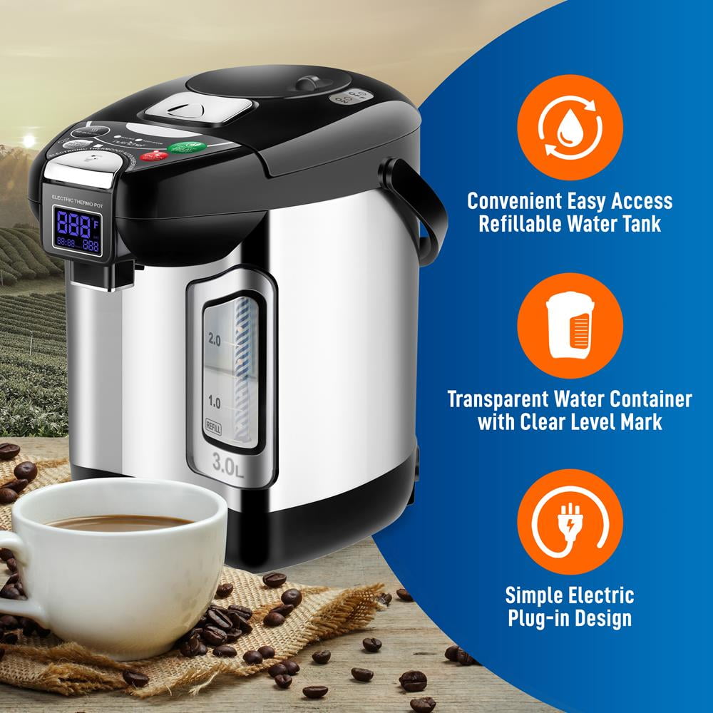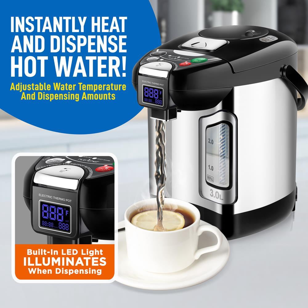 3L CAPACITY: The NutriChef Hot Water Dispenser features a large capacity of 3L boiling water to 212°F in minutes. Features 3 dispensing methods – automatic, manual dispense & cup switch which works by holding cup up to touch the switch behind the spout. BUILT-IN LED LIGHT: Equipped w/ built-in LED light that illuminates when dispensing. Thanks to the visible water w/ clear level mark, it’s convenient to control water capacity & add water in time. Used for drinks including instant coffee, tea & soups. AUTO SHUT-OFF: The 750W insulated pot keeps water warm throughout the day, makes hot water readily available anytime. For added safety, it shuts itself off once the pot is empty, as well as a dispense button safety lock to prevent accidental pouring. ADJUSTABLE TEMPERATURE: Allows you to heat the water directly to the selected Keep Warm temperature (149°F, 185°F & 208°F only) without reaching a boil. The water will reach the selected Keep Warm temperature quicker than regular mode. 360° ROTATING BASE: Features a 360° rotating platform at the bottom making it easy to access hot water from any angle & to make dispensing easier when the tank is full (heavy). This water boiler is safe for placement on any table or countertop.