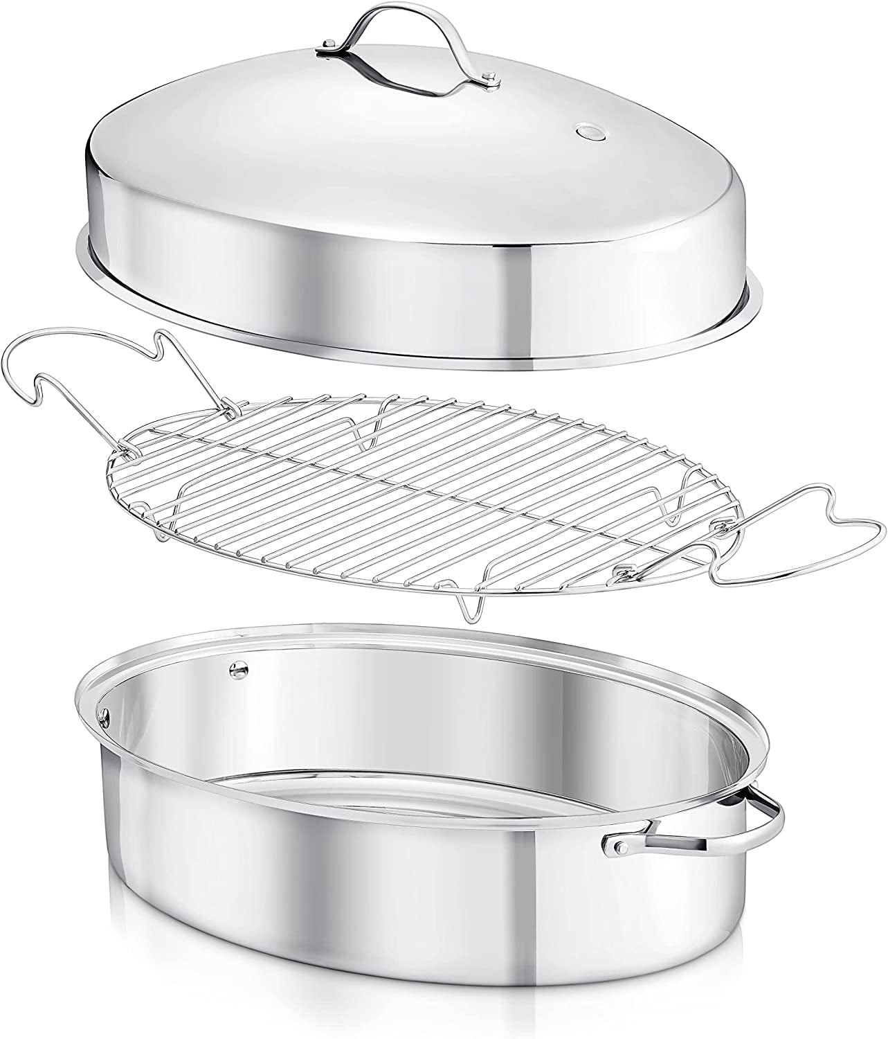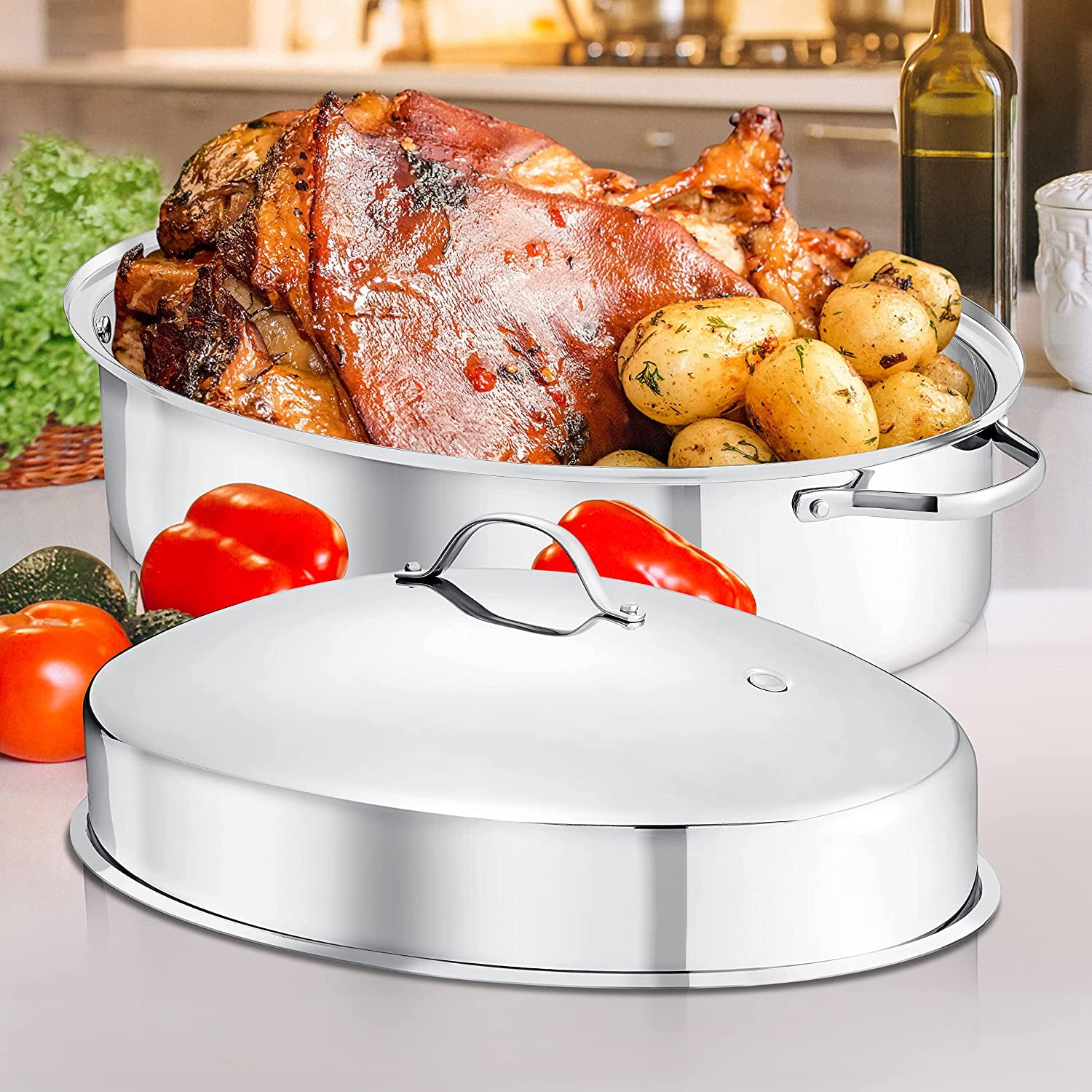 Nutrichef Oval Roasting Pan, Roaster with Polished Rack, Wide Handle and Stainless Steel Lid