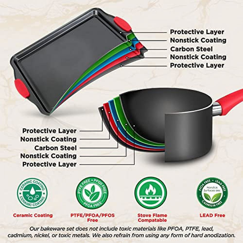 21PC SET: Includes 1.5 & 2.5qt sauce pots w/ lids, 4.5qt dutch oven pot w/ lid, small/medium fry pans w/ handle, ladle, spoon, small & regular spatula, silicone brusher, muffin pan, loaf pan, 2 round pan, square pan, roast pan, pizza pan & baking tin NON-STICK COATING: The NutriChef multi-sized non stick pot set cooking ware features a long lasting nonstick coating for easy food release or tossing, cleaning & healthy cooking w/ heat resistant lacquer exterior making it resistant to high heat COMFORTABLE HANDLE GRIPS: Features cool-touch form-fitting handle grips that are ergonomic & heat-resistant ensuring comfortable & safe cooking. Offers sleek design w/ stain-resistant edges adding an elegant touch to the pots & pans SEE-THROUGH LIDS: The non stick cookware is equipped with see-through tempered glass lids w/ vent holes that allow steam to escape. The kitchen cookware set effectively distributes & retains heat for even cooking w/ 392° F max temperature UNIVERSAL COOKING: These pots and skillet fry pans and utensils set are safe for use in gas, electric & ceramic counter cooktops. Made of pressed aluminum metal with a coating thickness of 20-25um, 2.2mm multi-layered cookware
