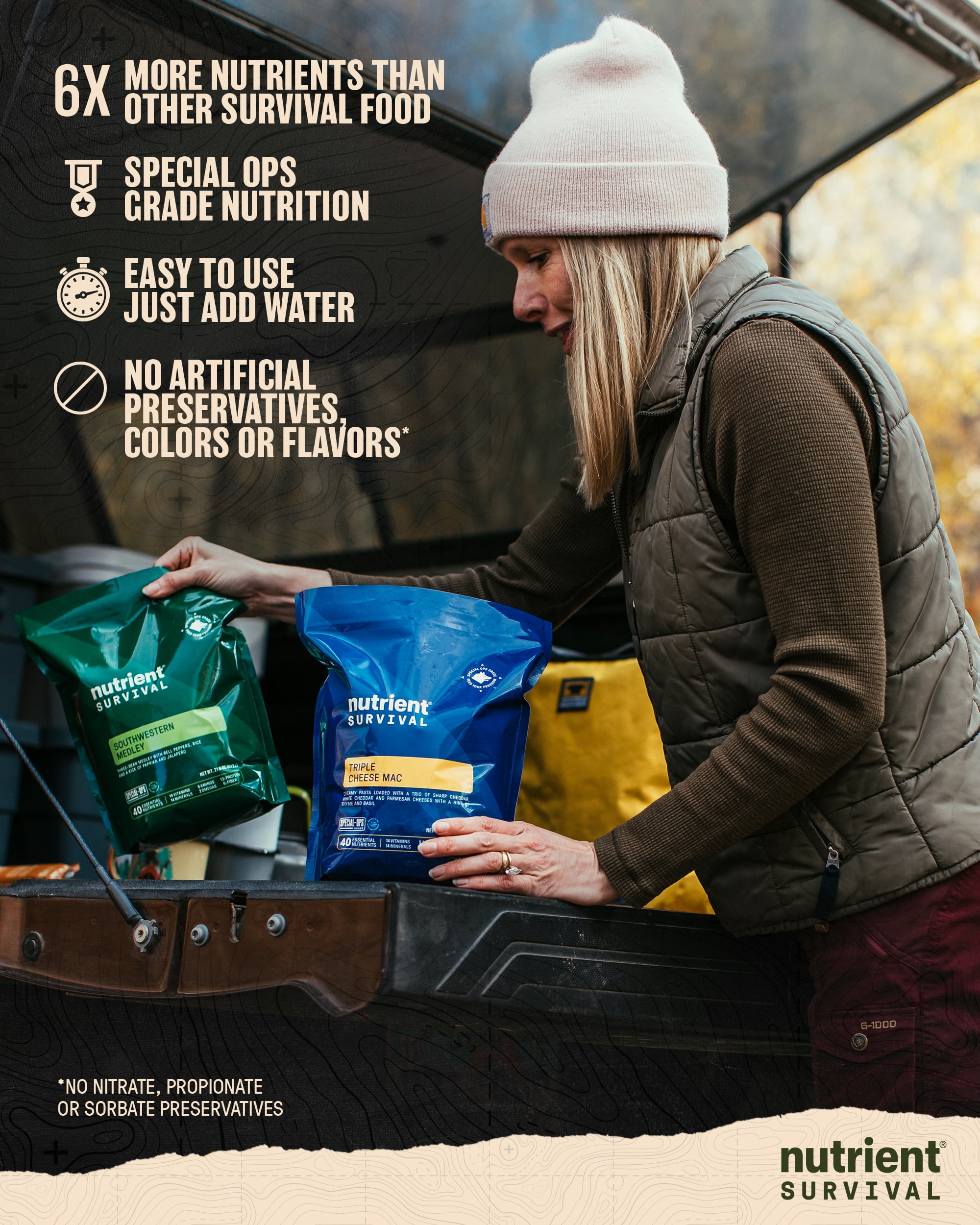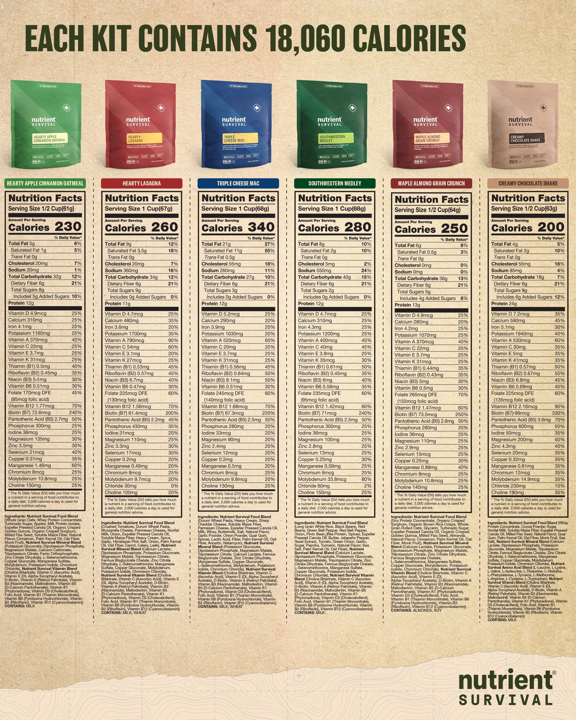 Contains 72 servings for 18,060 calories and 1,047 grams of protein (1,290 calories and 75 grams of protein a day). Every prepper knows to have enough food on hand in case of an unexpected emergency. But the smartest preppers know that just having food isn’t enough. In fact, you can eat all the food you want and still be malnourished, if that food doesn’t have the nutrition you need. Other survival food companies like to talk about CHEAP calories – but we like to talk about QUALITY calories. That’s why Nutrient Survival has 6 times the nutrients per calorie than other survival food. That makes us Special Ops grade nutrition. No other brand comes close. Feed Your Freedom with this collection of six best-selling favorites – Triple Cheese Mac, Hearty Lasagna, Southwestern Medley, Hearty Apple Cinnamon Oatmeal, Creamy Chocolate Shake, and Maple Almond Grain Crunch. Each variety comes sealed tight in a large resealable pack with 15-year shelf life. Each kit contains 18,060 calories and 1,047 grams of protein (1,290 calories and 75 grams of protein a day) not to mention an Excellent Source of essential vitamins, minerals, amino acids, omegas and fiber.