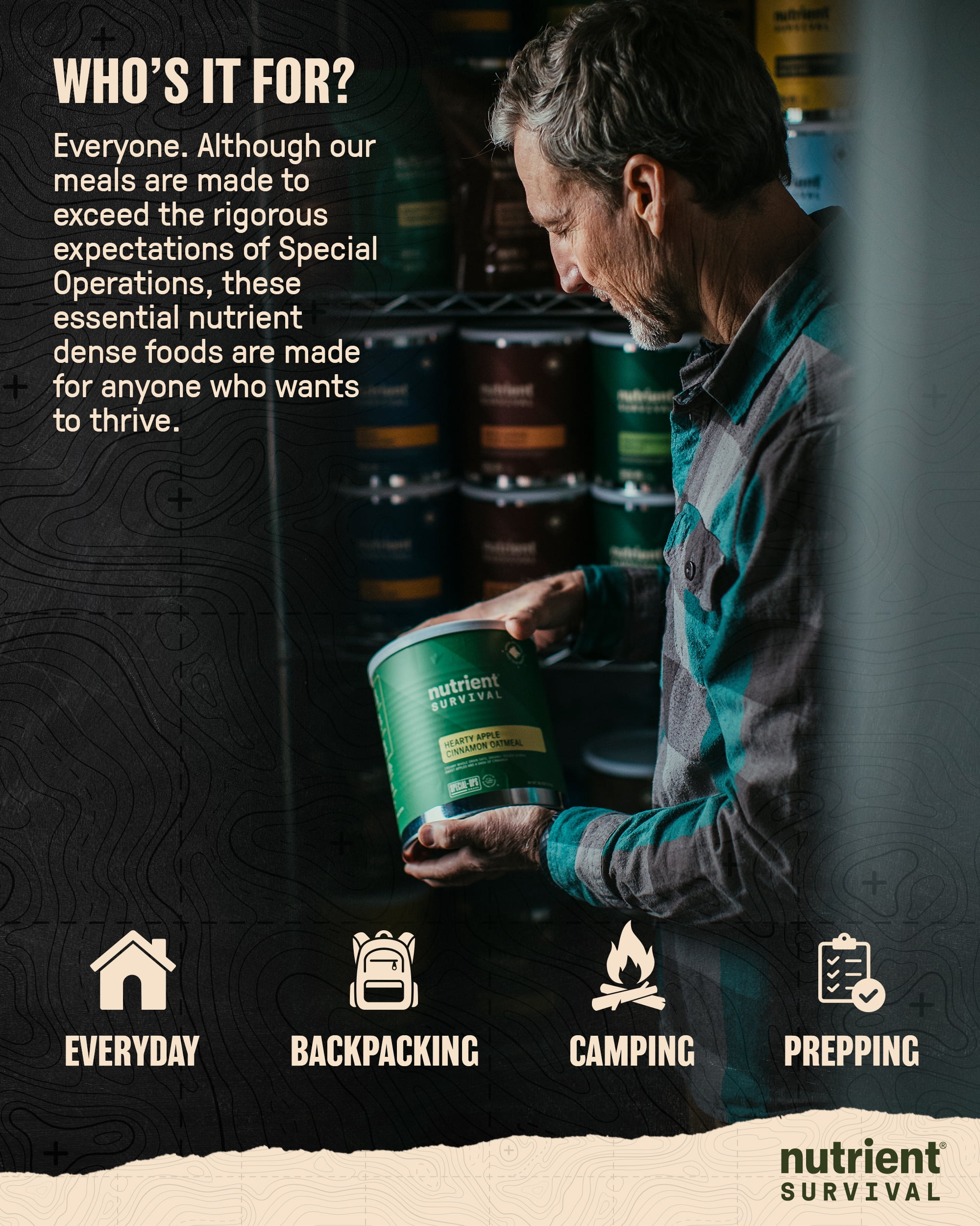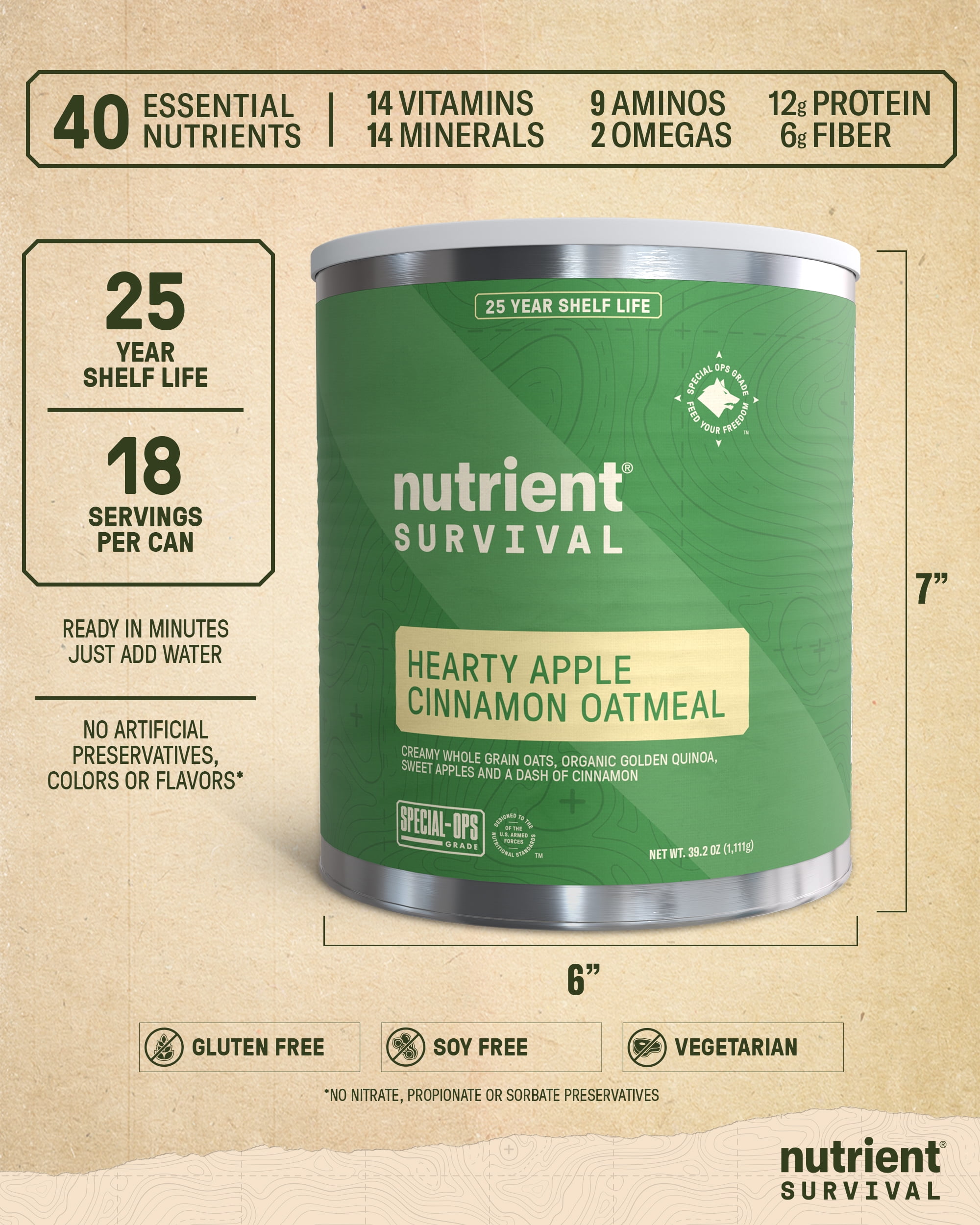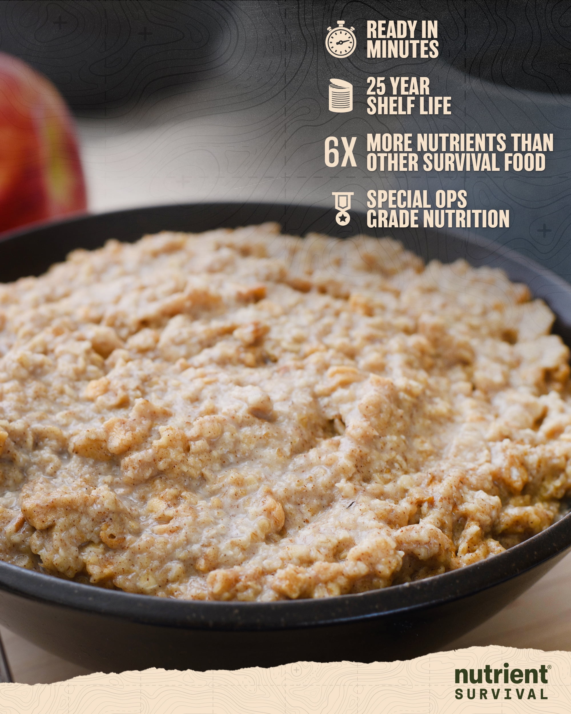 Nutrient Survival Hearty Apple Cinnamon Oatmeal, Freeze Dried Prepper Supplies & Emergency Food What is Survival Food? Survival Foods are ready to eat food items or MREs (Meal, Ready-to-Eat) which have been processed and freeze-dried to have a much longer shelf life. These products are used during times of crisis or while adventuring and exploring outdoors. Nutrient Survival freeze dried food is made with a patented process that has achieved two of the most important elements of nutrition – how to pack in flavor and nutrients. Prep with Pride, Survive & Thrive Nothing prepares you for what’s to come like proper nutrition. Nutrient Survival chef-made ready to eat meals and snacks take you from just surviving to thriving. Our plant-based meals and snacks have no added flavors, colors or preservatives and have a long, stable shelf life. We provide you with special ops-grade nutrition so you can operate at your best. What’s special about Nutrient Survival Hearty Apple Cinnamon Oatmeal? Our soy and gluten free oatmeal is an ideal nutritious breakfast food for anyone looking for an energy-packed meal. This creamy oatmeal provides a delicious and satisfying meal that is full of vitamins and minerals. Made with whole grain oats, organic golden quinoa, sweet apples and a dash of cinnamon. Our Hearty Oatmeal is natural and healthy. Just 1 serving provides your body with the nutrients that help you thrive. Strong enough for U.S. Special Operations Forces, but made to power everyone who wants to feed their freedom with the most nutrient dense meals on the market. At home, in the office, or on the road, Nutrient Survival makes eating nutritiously easy in every situation. There’s no more room for excuses and dead calories. Just a healthier, stronger you.