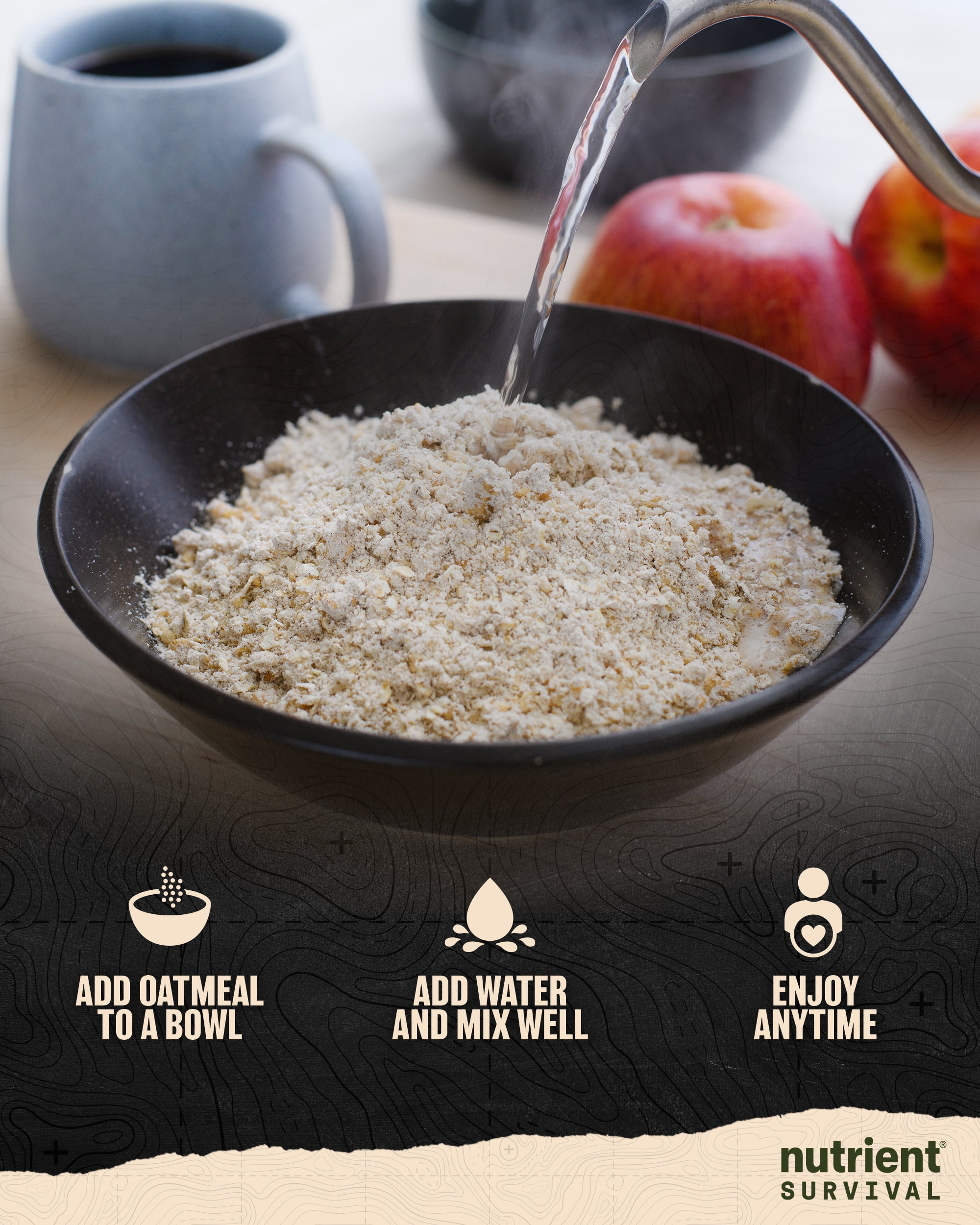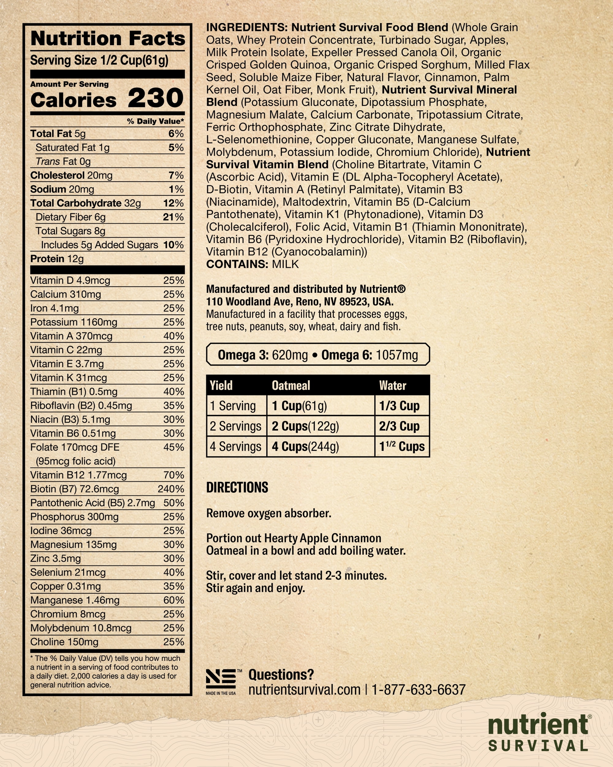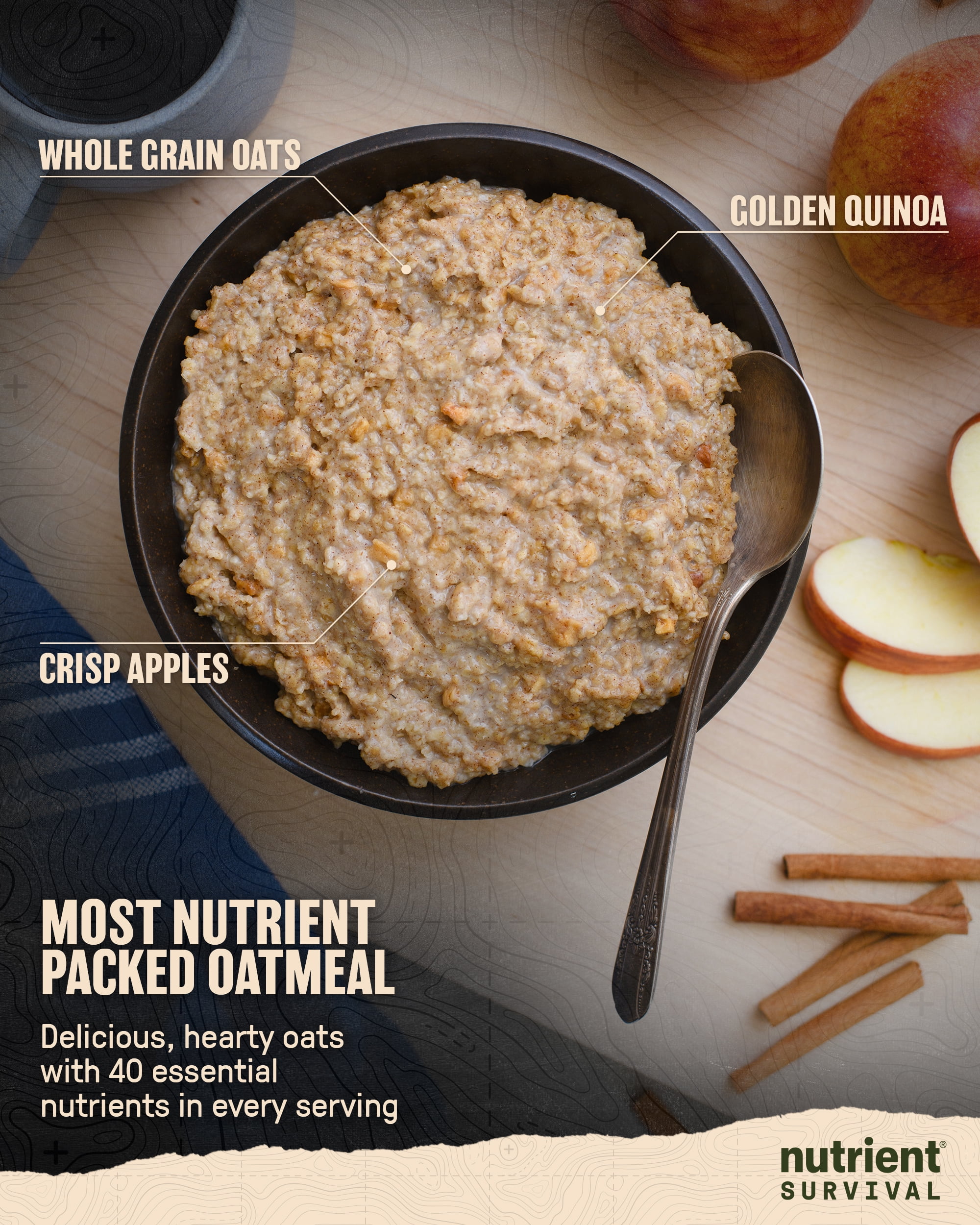 Nutrient Survival Hearty Apple Cinnamon Oatmeal, Freeze Dried Prepper Supplies & Emergency Food What is Survival Food? Survival Foods are ready to eat food items or MREs (Meal, Ready-to-Eat) which have been processed and freeze-dried to have a much longer shelf life. These products are used during times of crisis or while adventuring and exploring outdoors. Nutrient Survival freeze dried food is made with a patented process that has achieved two of the most important elements of nutrition – how to pack in flavor and nutrients. Prep with Pride, Survive & Thrive Nothing prepares you for what’s to come like proper nutrition. Nutrient Survival chef-made ready to eat meals and snacks take you from just surviving to thriving. Our plant-based meals and snacks have no added flavors, colors or preservatives and have a long, stable shelf life. We provide you with special ops-grade nutrition so you can operate at your best. What’s special about Nutrient Survival Hearty Apple Cinnamon Oatmeal? Our soy and gluten free oatmeal is an ideal nutritious breakfast food for anyone looking for an energy-packed meal. This creamy oatmeal provides a delicious and satisfying meal that is full of vitamins and minerals. Made with whole grain oats, organic golden quinoa, sweet apples and a dash of cinnamon. Our Hearty Oatmeal is natural and healthy. Just 1 serving provides your body with the nutrients that help you thrive. Strong enough for U.S. Special Operations Forces, but made to power everyone who wants to feed their freedom with the most nutrient dense meals on the market. At home, in the office, or on the road, Nutrient Survival makes eating nutritiously easy in every situation. There’s no more room for excuses and dead calories. Just a healthier, stronger you.