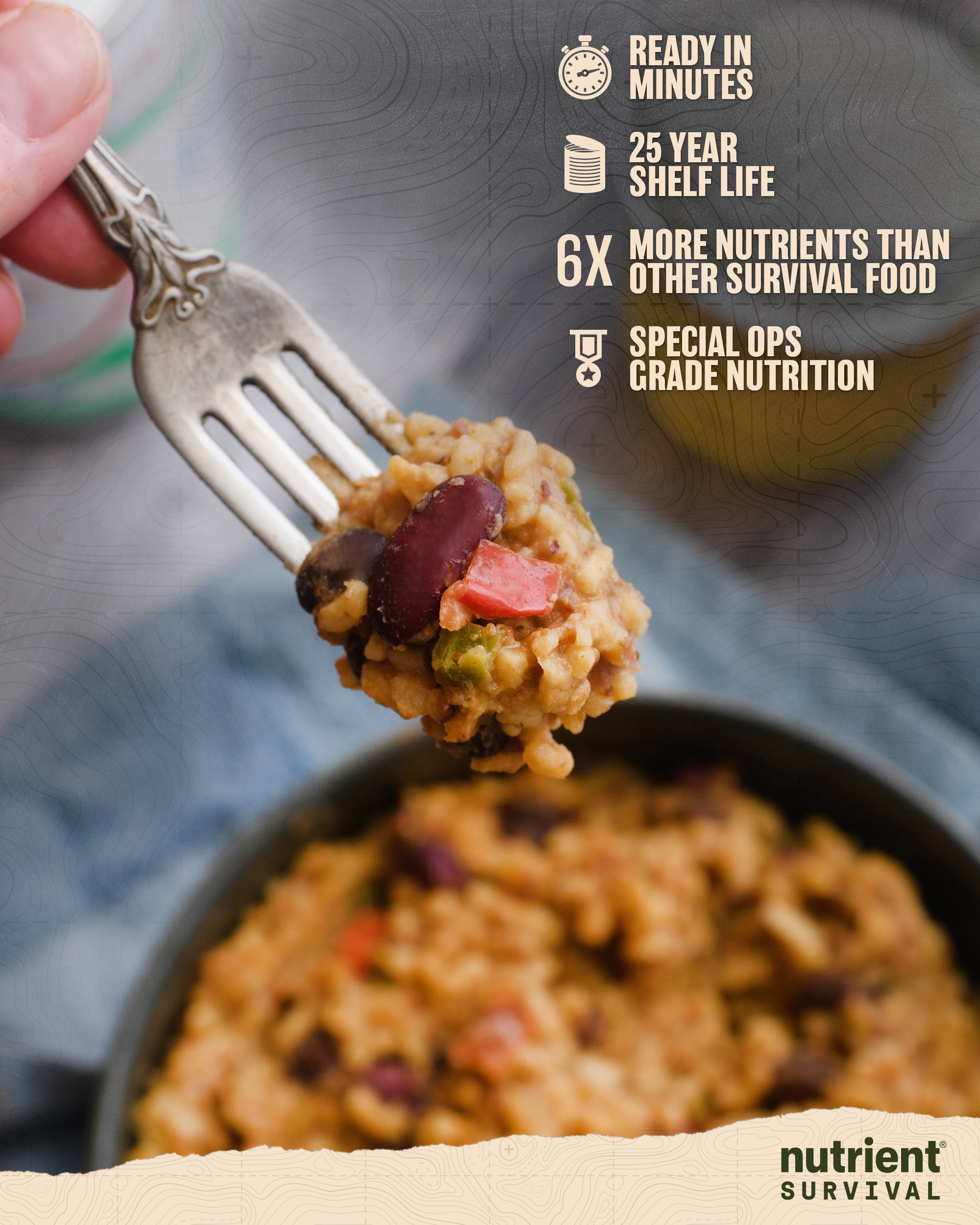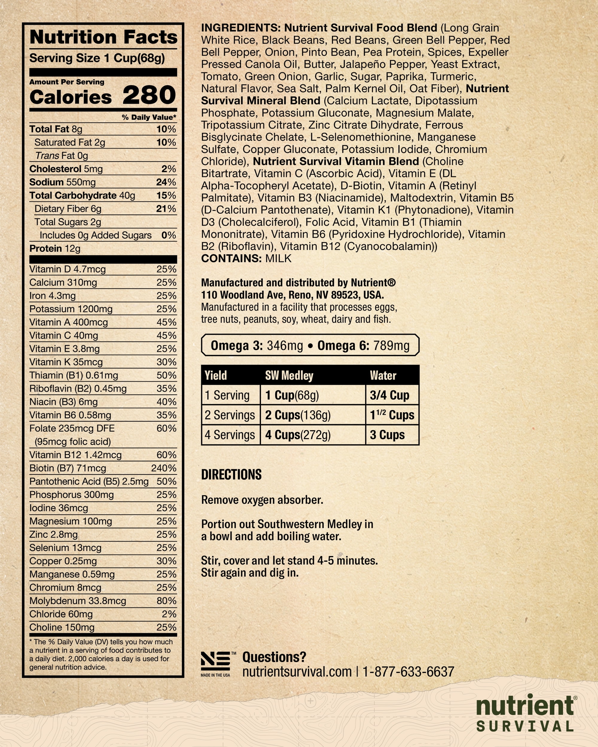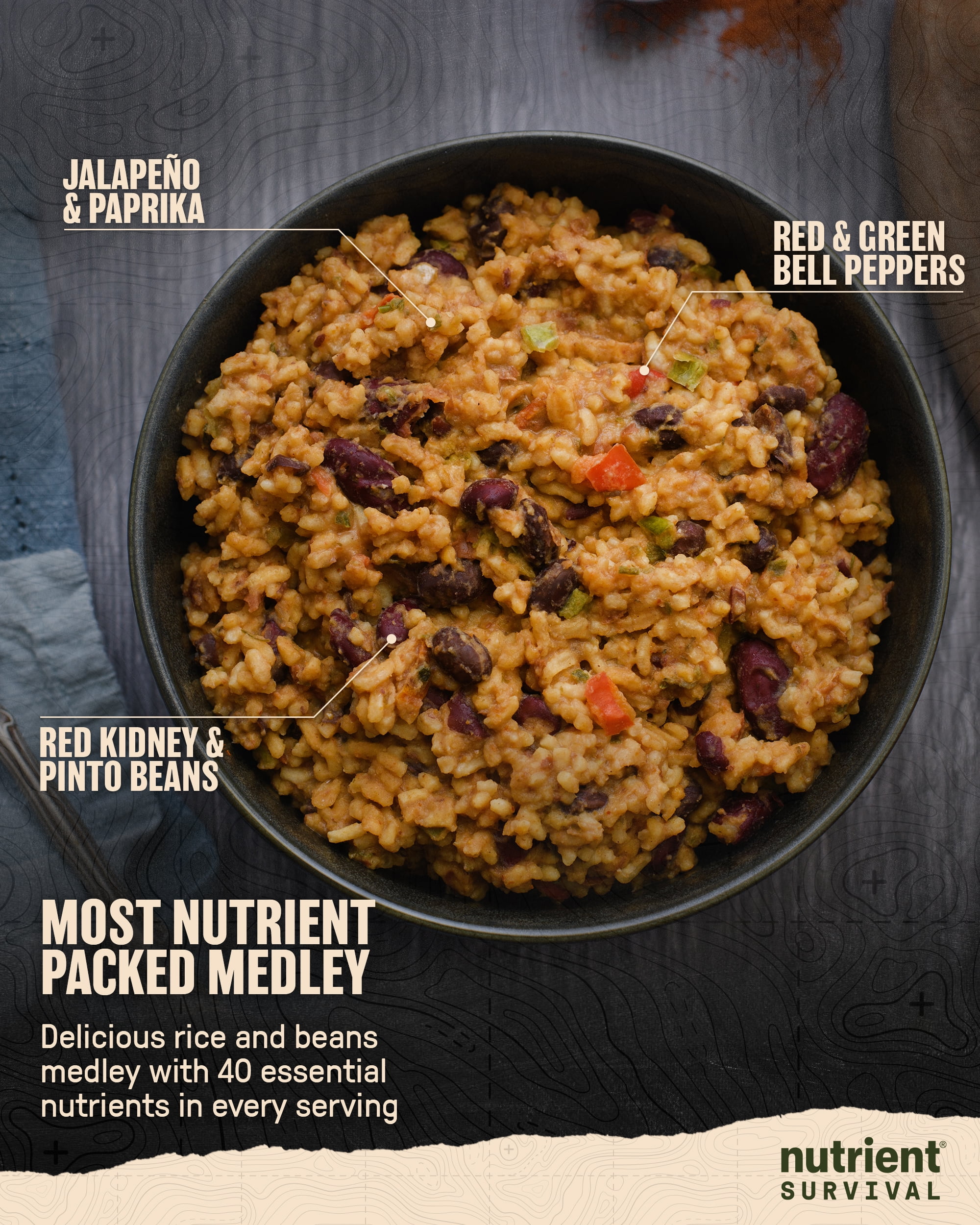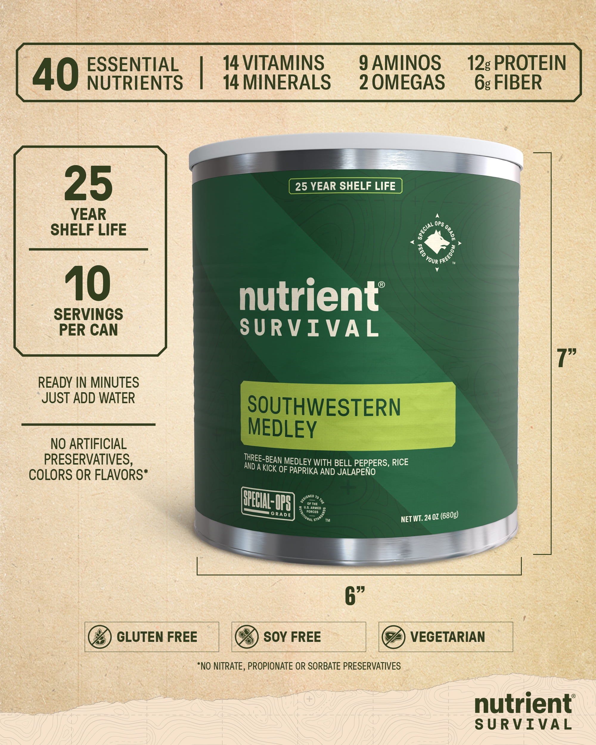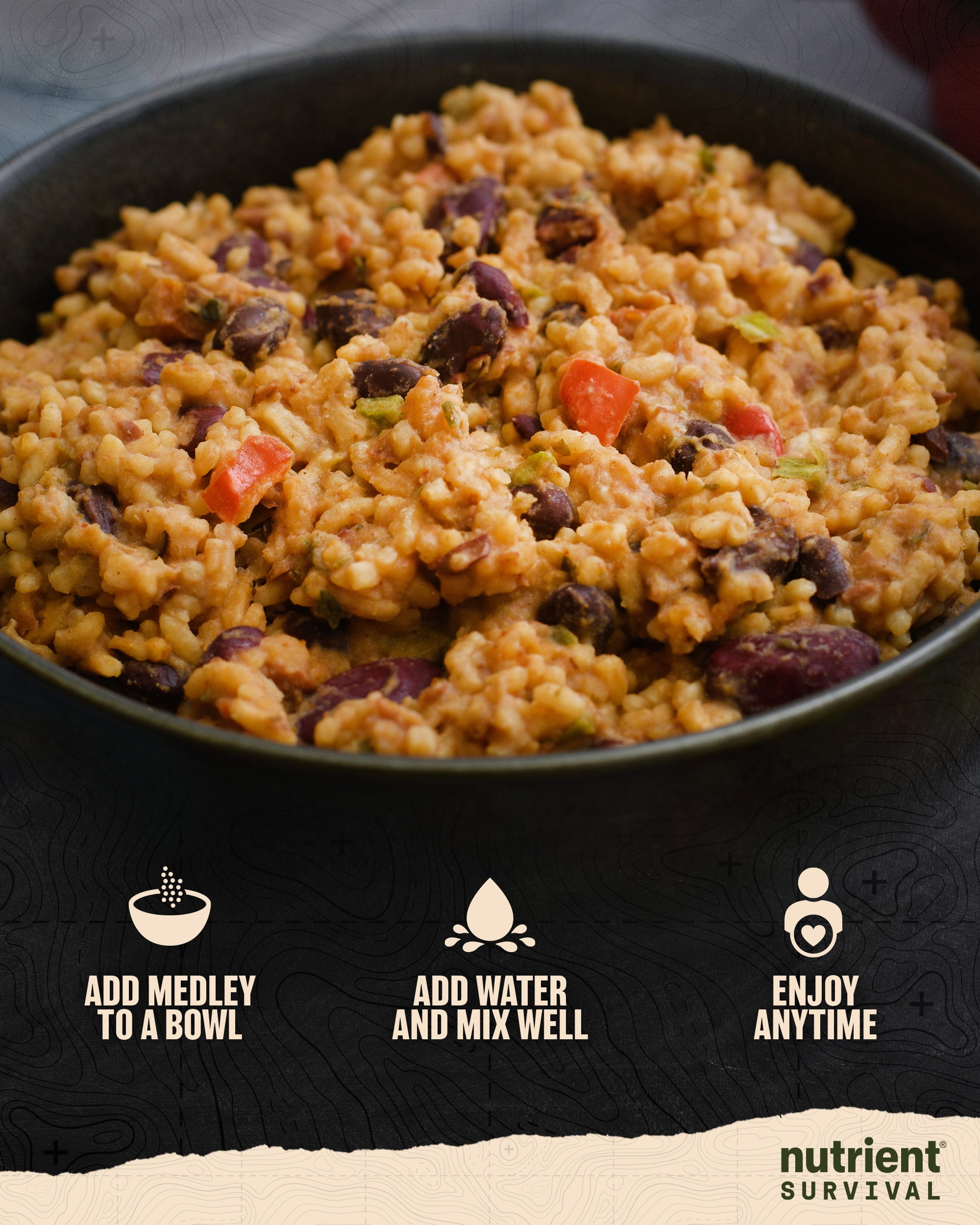 FEED YOUR FREEDOM: Enjoy our Southwestern Medley MRE without slaving in the kitchen. A delicious three-bean medley with bell peppers, rice, a kick of paprika & jalapeno. Just add hot water, stir and cover. Made with real ingredients, a nutrient-complete meal SPECIAL OPS GRADE NUTRITION: This mouthwatering survival food is packed with 40 nutrients and 12 grams of protein in each serving. Includes 14 essential vitamins and 14 essential minerals including biotin, folate, riboflavin, calcium and omega 3 & 7 UP TO 25 YEAR SHELF LIFE: Nutrient Survival makes snacks and ready to eat meals that last for years without losing their taste. The freeze-drying process locks in nutrients, preserving the natural taste. No artificial colors, flavors or preservatives PRIME YOUR PREP: Our ready to eat meals make great prepper food and emergency food supplies. For natural disasters and earthquakes, camping supplies, hiking or any challenging situation, we ensure optimal nutrition during times of crisis GO-TO NUTRITION WHEN NEEDED: Nutrient Survival foods are American born and made, ensuring the best, healthiest and supremely delicious nutrition. Perfect for times of stress, a quick snack, elevating performance, travel, prepper supplies or living off-the-grid