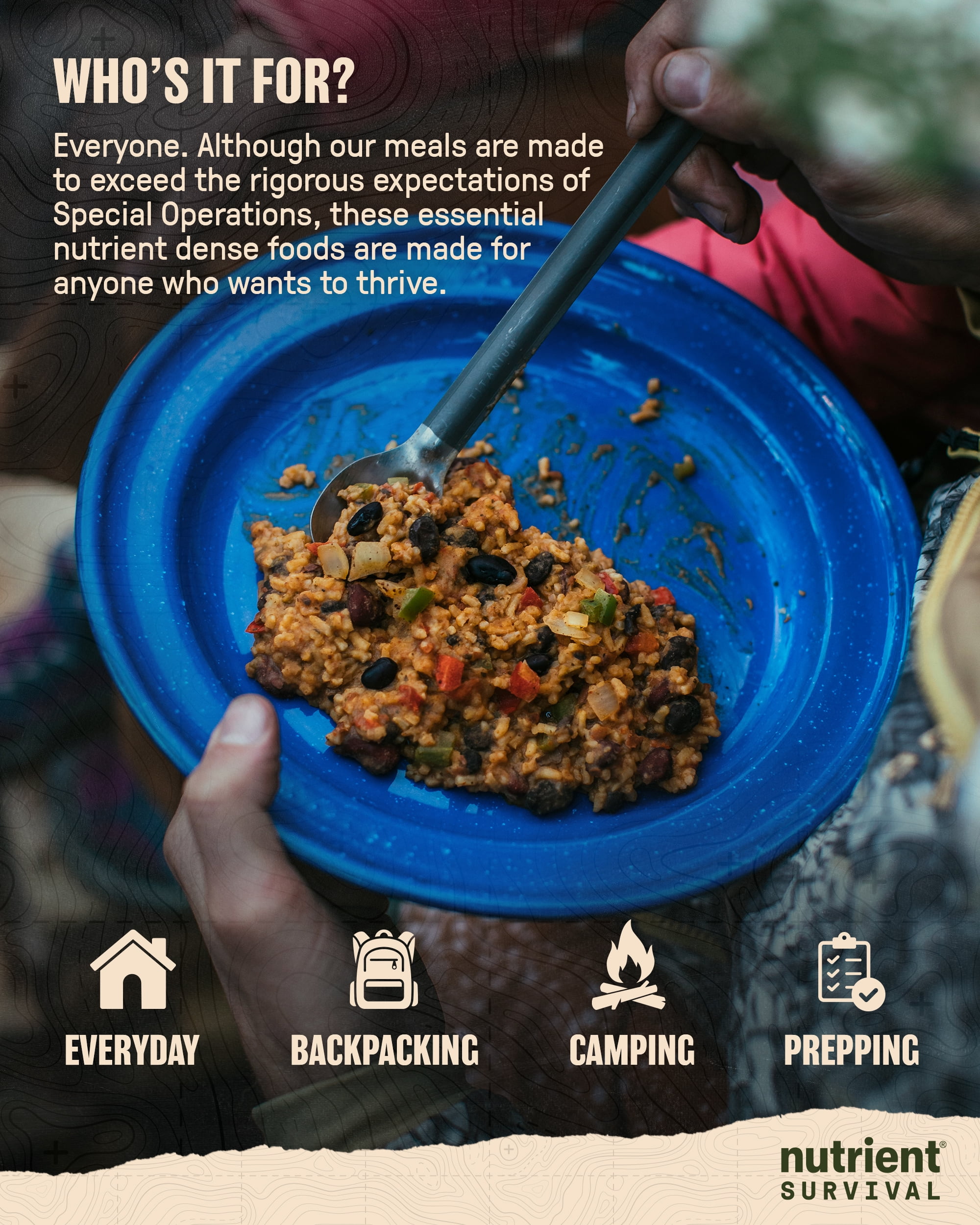 Nutrient Survival Southwestern Medley, Ready to Eat Freeze Dried Prepper Supplies What is Survival Food? Survival Foods are ready to eat food items or MREs (Meal, Ready-to-Eat) which have been processed and freeze-dried to have a much longer shelf life. These products are used during times of crisis or while adventuring and exploring outdoors. Nutrient Survival survival food is made with a patented process that has achieved two of the most important elements of nutrition – how to pack in flavor and nutrients. Prep with Pride, Survive & Thrive Nothing prepares you for what’s to come like proper nutrition. Nutrient Survival chef-made ready to eat meals and snacks take you from just surviving to thriving.Our plant-based meals and snacks have no added flavors, colors or preservatives and have a long, stable shelf life. We provide you with special ops-grade nutrition so you can operate at your best. What’s special about Nutrient Survival Southwestern Medley? Our Nutrient Survival Southwestern Medley is a nutritiously dense meal that is loaded with vitamins and minerals. Six times more healthy ingredients than other survival meals. It includes 14 essential vitamins and 14 essential minerals including biotin, folate and riboflavin, calcium, phosphorus, 6g fiber and selenium. It also has 346mg Omega 3 and 789mg Omega 6. Our protein-packed freeze dried food is natural and healthy. Just 1 serving provides your body with the nutrients that help you thrive. Strong enough for U.S. Special Operations Forces, but made to power everyone who wants to feed their freedom with the most nutrient dense meals on the market. At home, in the office, or on the road, Nutrient Survival makes eating nutritiously easy in every situation. There’s no more room for excuses and dead calories. Just a healthier, stronger you.
