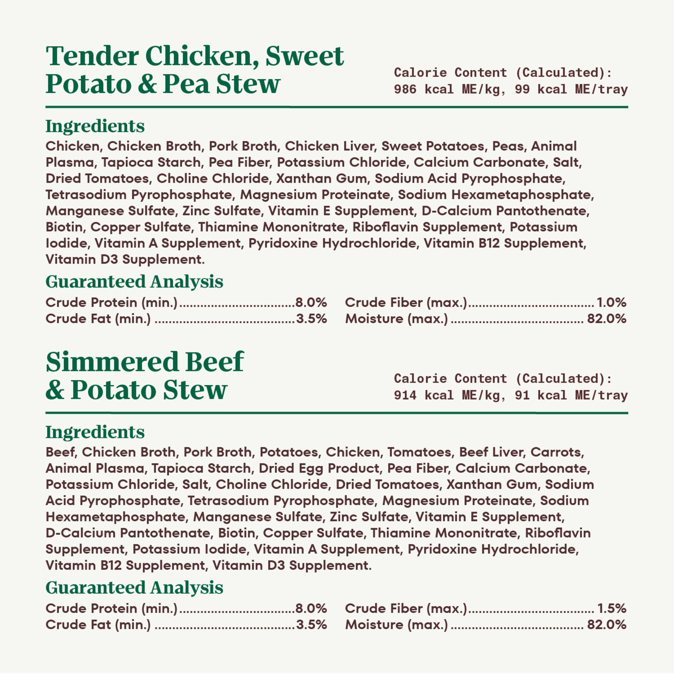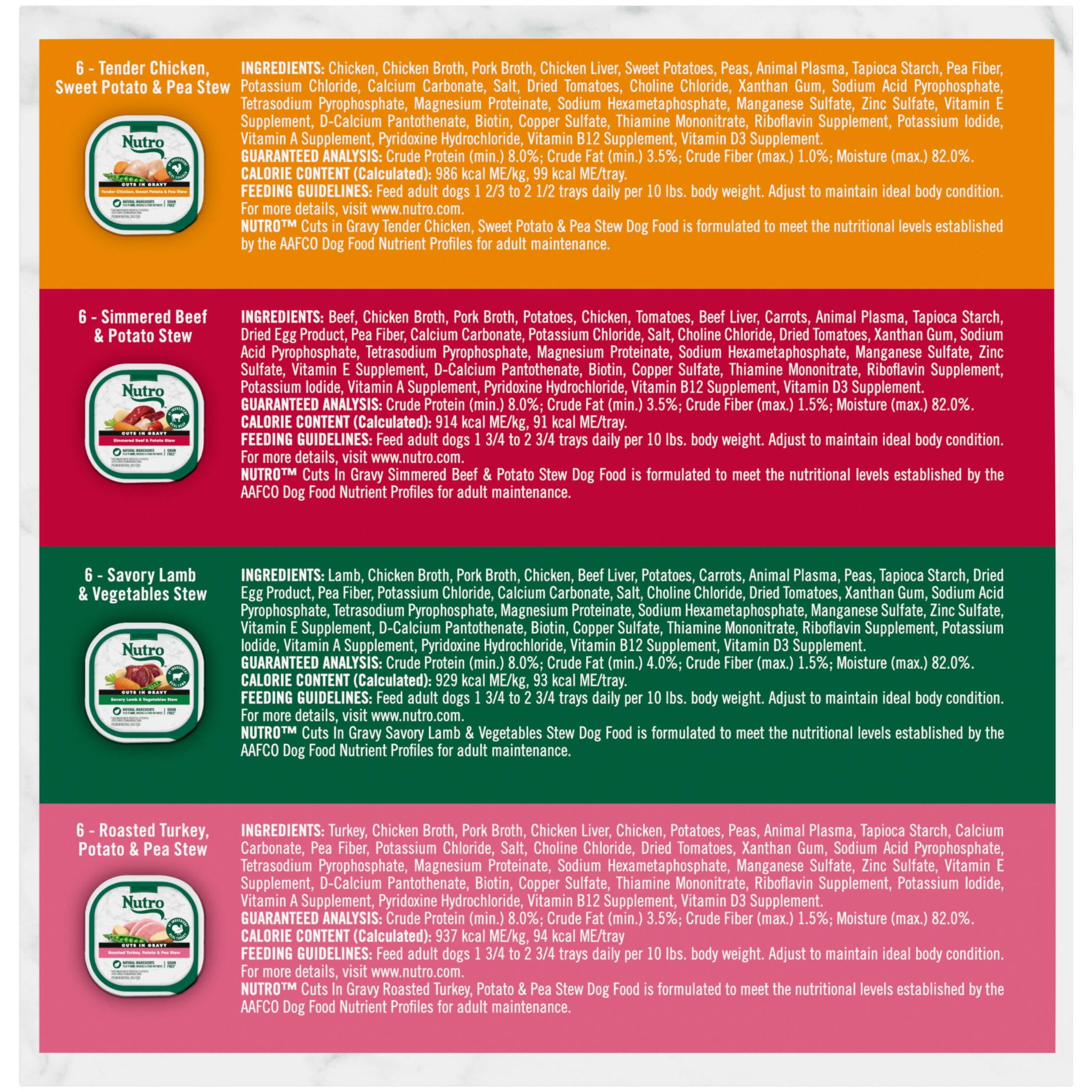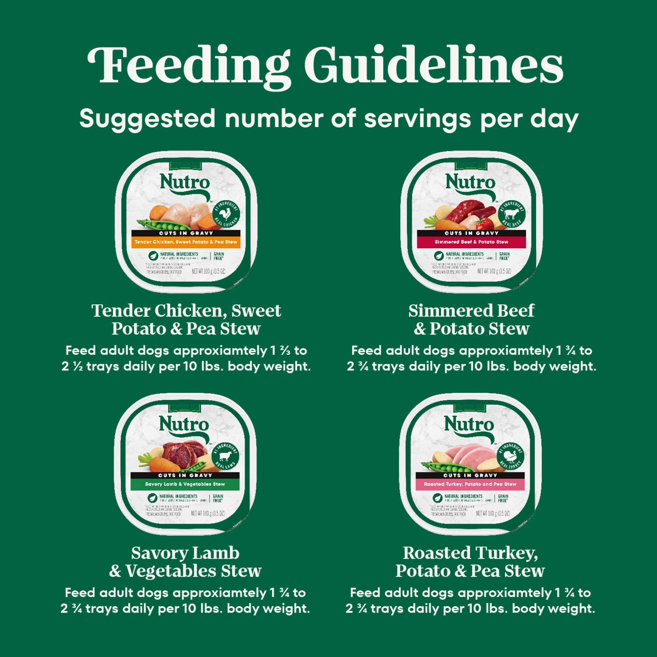 Nutro Recipes are centered around high-quality protein sources and wholesome ingredients rooted in nature. Every bowl provides essential nutrition for whole-body health to help grow healthy dogs. Nutro Natural Choice Cuts In Gravy Wet Dog Food 4 Flavors Variety Pack comes with 4 recipes: Tender Chicken, Sweet Potato & Pea Stew, Simmered Beef & Potato Stew, Savory Lamb & Vegetable Stew, and Roasted Turkey, Potato & Pea Stew. These Recipes provide your dog with real chicken, beef, lamb, or turkey as the #1 ingredient for a delicious flavor they will enjoy. These wet dog food recipes are formulated without grains and are made with the finest ingredients from around the world. These facilities have zero factory waste to landfill and use 100% renewable electricity. Nutro Cuts In Gravy is made with no chicken by-product meal, corn, wheat, or soy, although trace amounts may be present due to potential cross-contact during manufacturing. Give your dog food that fuels their vitality with Nutro Wet Dog Food Recipes.
