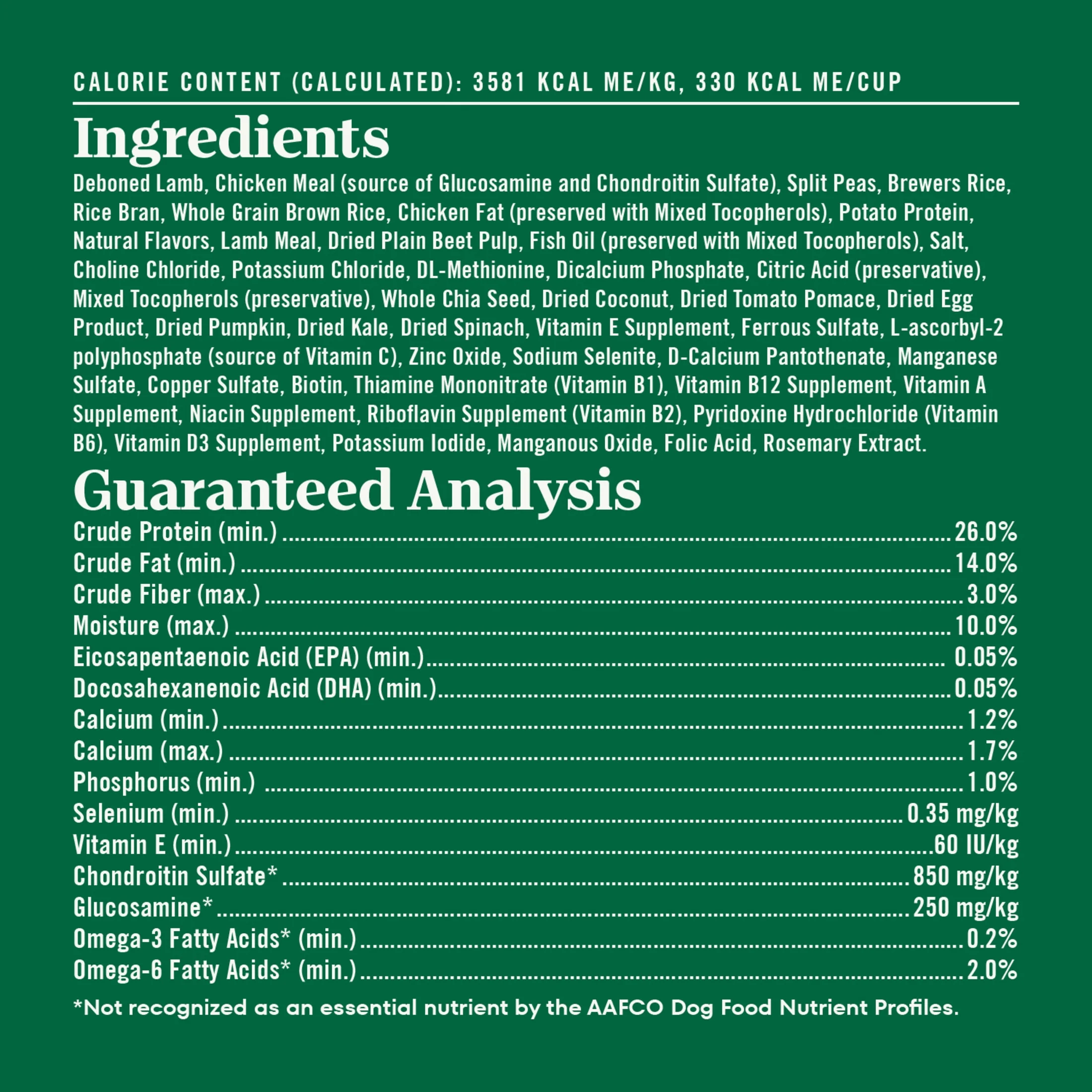 Made with real lamb as the #1 ingredient in this protein-rich recipe. Made with non-GMO ingredients; no chicken by-product meal, corn, wheat, or soy. Promotes healthy vitality by supporting healthy brain and eye development, healthy digestion, and immunity for your dog. Supports healthy skin and coat, strong bones, and strong muscles. Made with the finest ingredients from around the world.