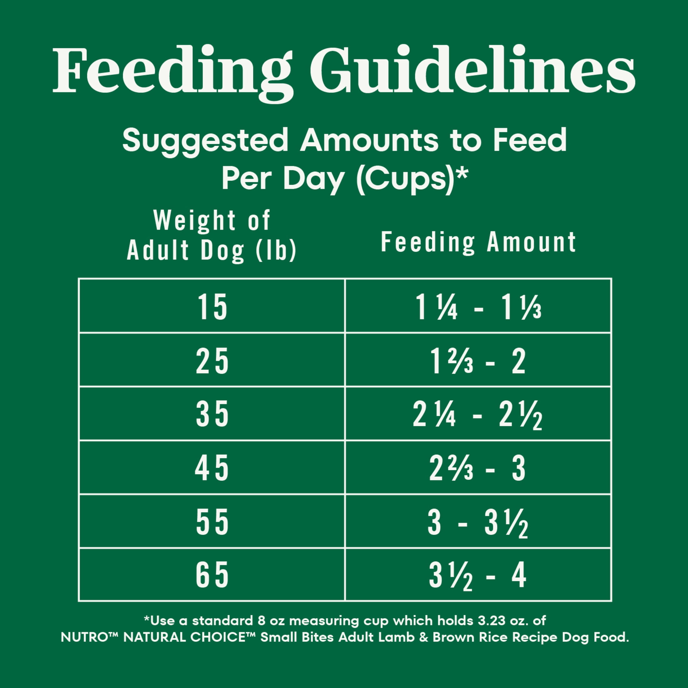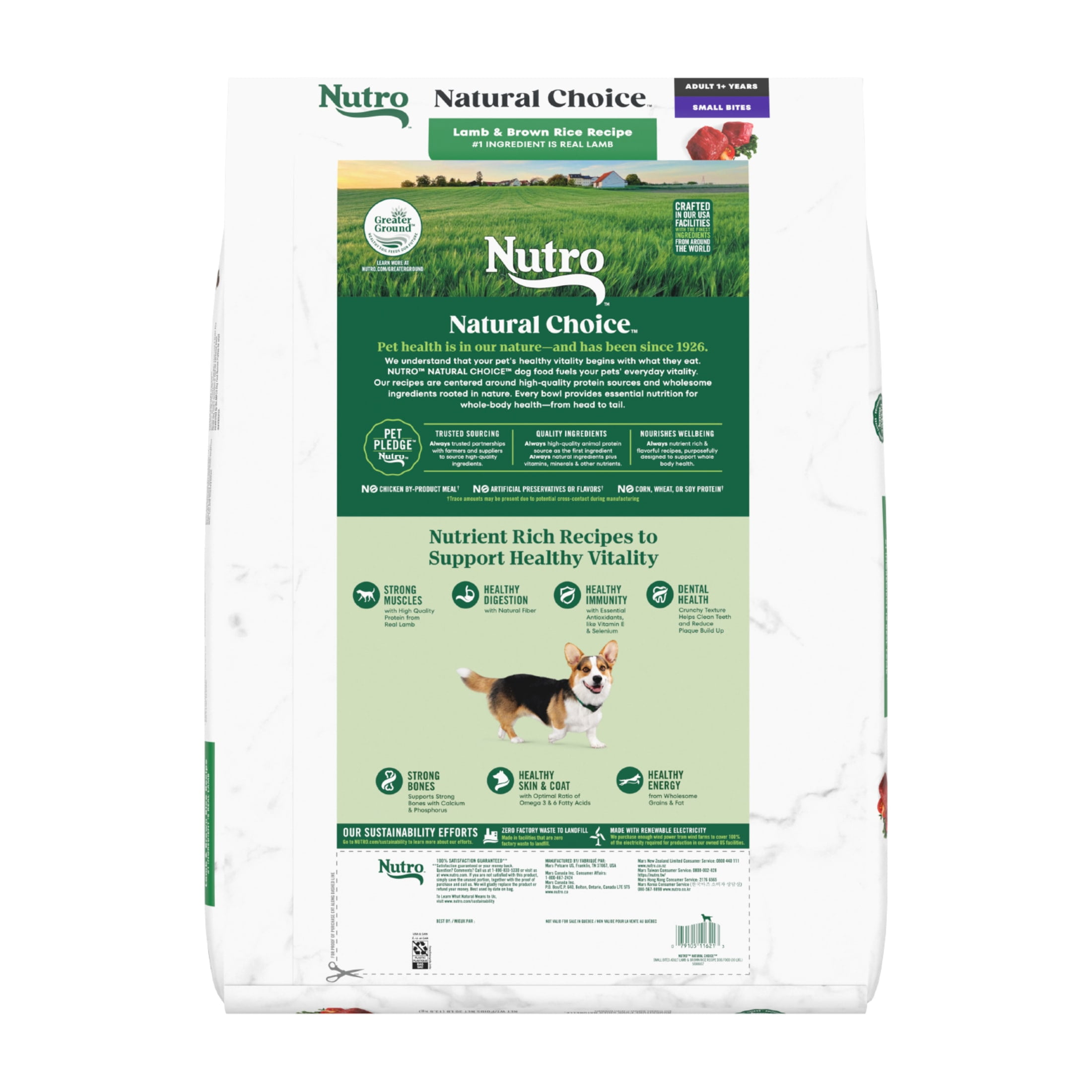 We understand that pet owners want the best for their dogs. That’s why Nutro has a partnership with trusted farmers and suppliers to source high-quality ingredients, giving your dog quality nutrition both you and your pet will appreciate. Made with chicken as the #1 ingredient, and crafted with vitamins, minerals, and other nutrients, Nutro Natural Choice Small Bites Adult Dry Dog Food, Chicken & Brown Rice Recipe brings real, recognizable ingredients to every mealtime. This dry dog food recipe has been designed for dogs that prefer smaller kibble and is made with a crunchy texture that helps clean teeth and reduce plaque buildup to support your dog’s dental health. Plus, it’s made with non-GMO ingredients and has no chicken by-product meal, corn, wheat, or soy. With ingredients that support healthy skin and coat, digestion, and immunity, this dry dog food recipe also supports your dog’s vitality. Packed with delicious flavor, high quality ingredients, and supportive benefits, serve your furry loved one something they will love with Nutro Natural Choice Dry Dog Food Recipes.