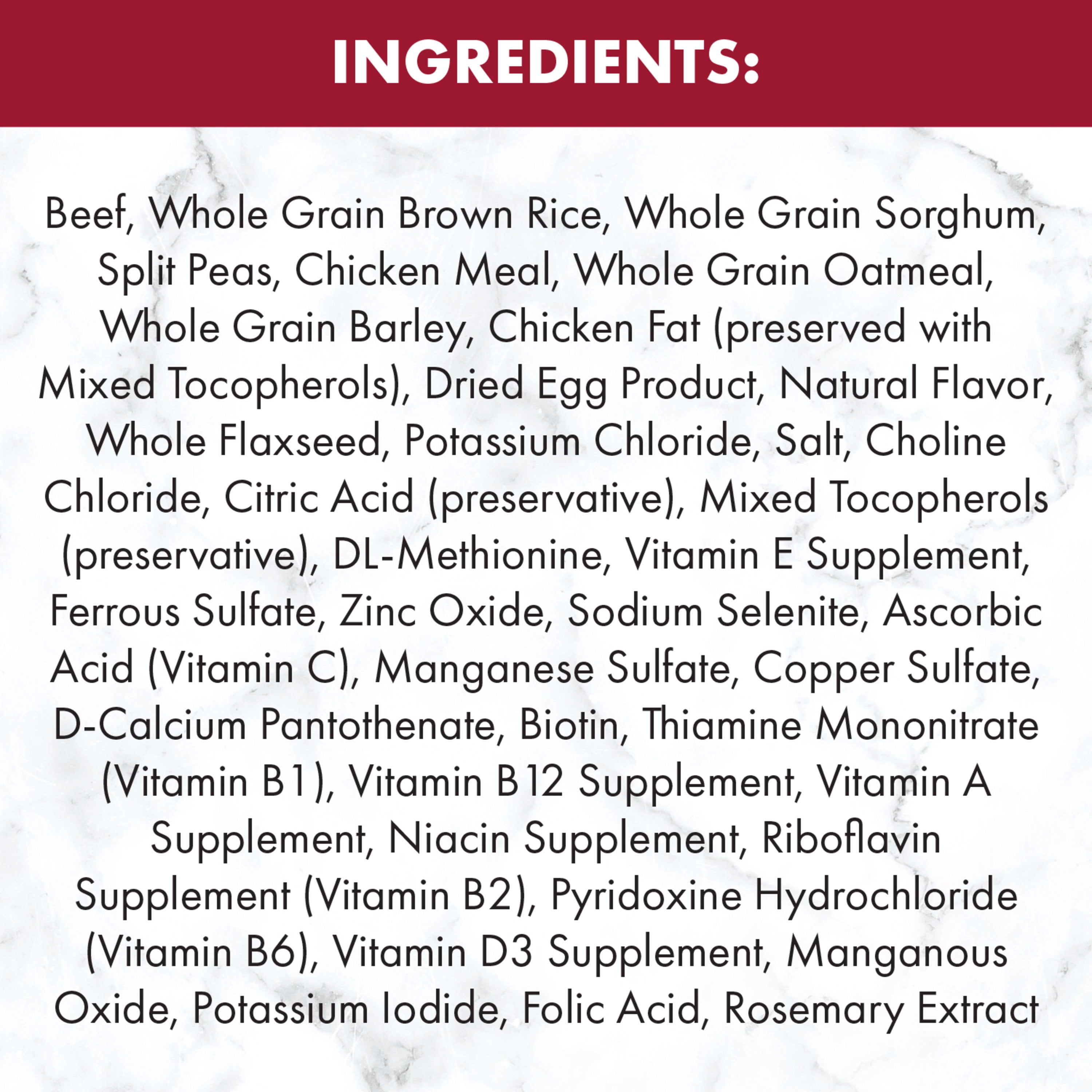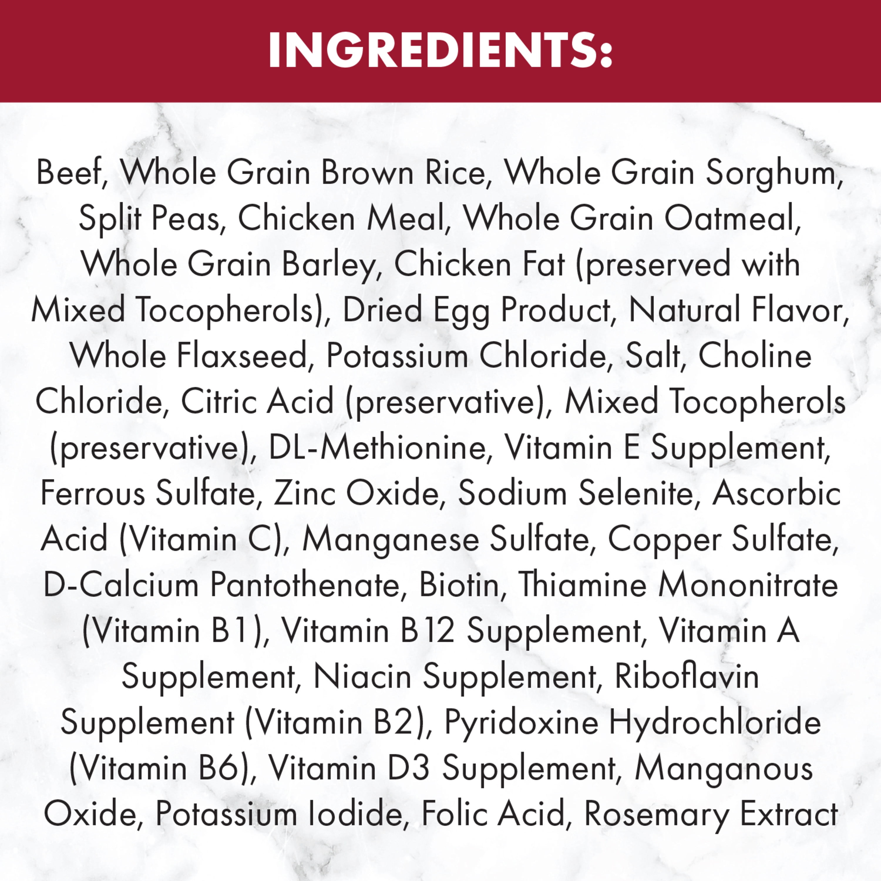 With a handful of key ingredient sources, these delicious recipes are full of flavor and nutrients. Crafted with Key Ingredient such as beef, whole grains, chicken, peas, egg and flaxseed plus natural flavors, vitamins, minerals and other nutrients. With the taste of real beef (#1 ingredient) and vegetables, this kibble makes a tasty meal your dog will love. Crafted with real, recognizable ingredients and without grains, chicken by-product meal, corn, wheat or soy, and no artificial flavors*, colors* or preservatives*.
