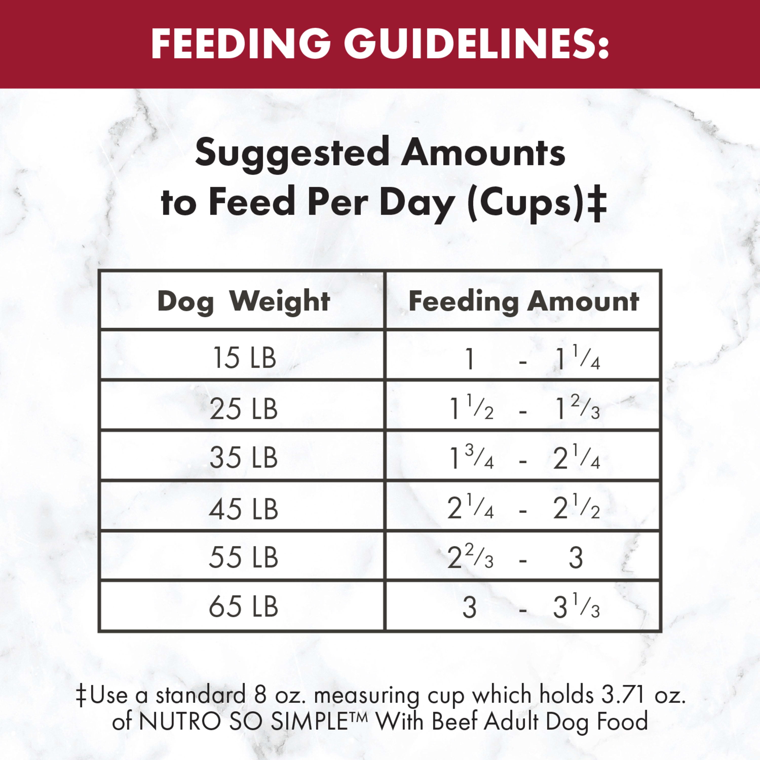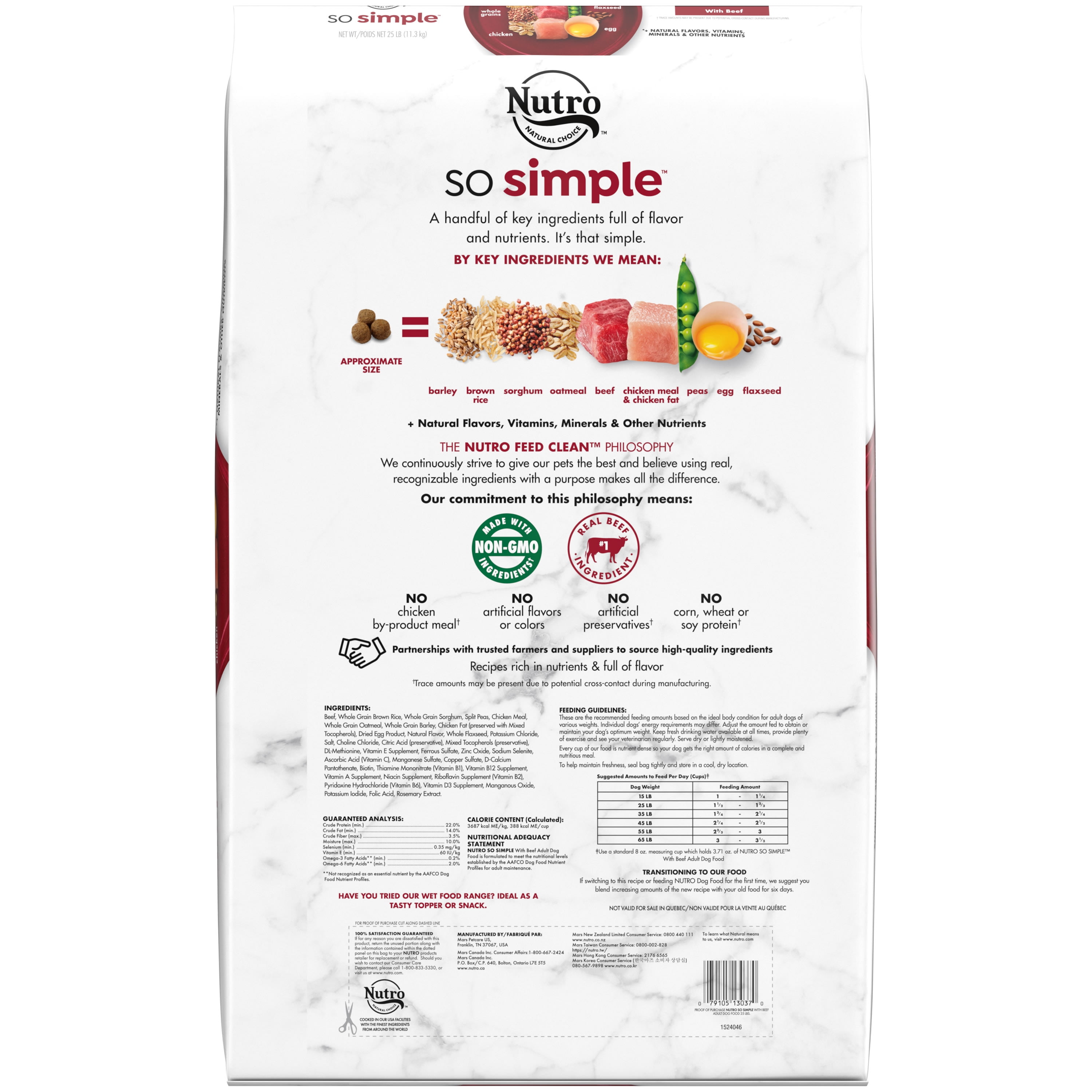 Dogs live for the simple things — like their favorite toy or the perfect head scratch. Nutro So Simple Dry Dog food believes feeding them well should be just as uncomplicated. This adult dry dog food is crafted with a handful of key ingredient sources like beef, whole grains, chicken, peas, egg and flaxseed plus natural flavors, vitamins, minerals and other nutrients. This delicious recipe starts with real beef as the 1st ingredient, plus it has no chicken by-product meal, corn, wheat or soy protein†. Feel good about giving your dog simple recipes rich in nutrients and full of flavor.†Trace amounts may be present due to potential cross-contact during manufacturing.