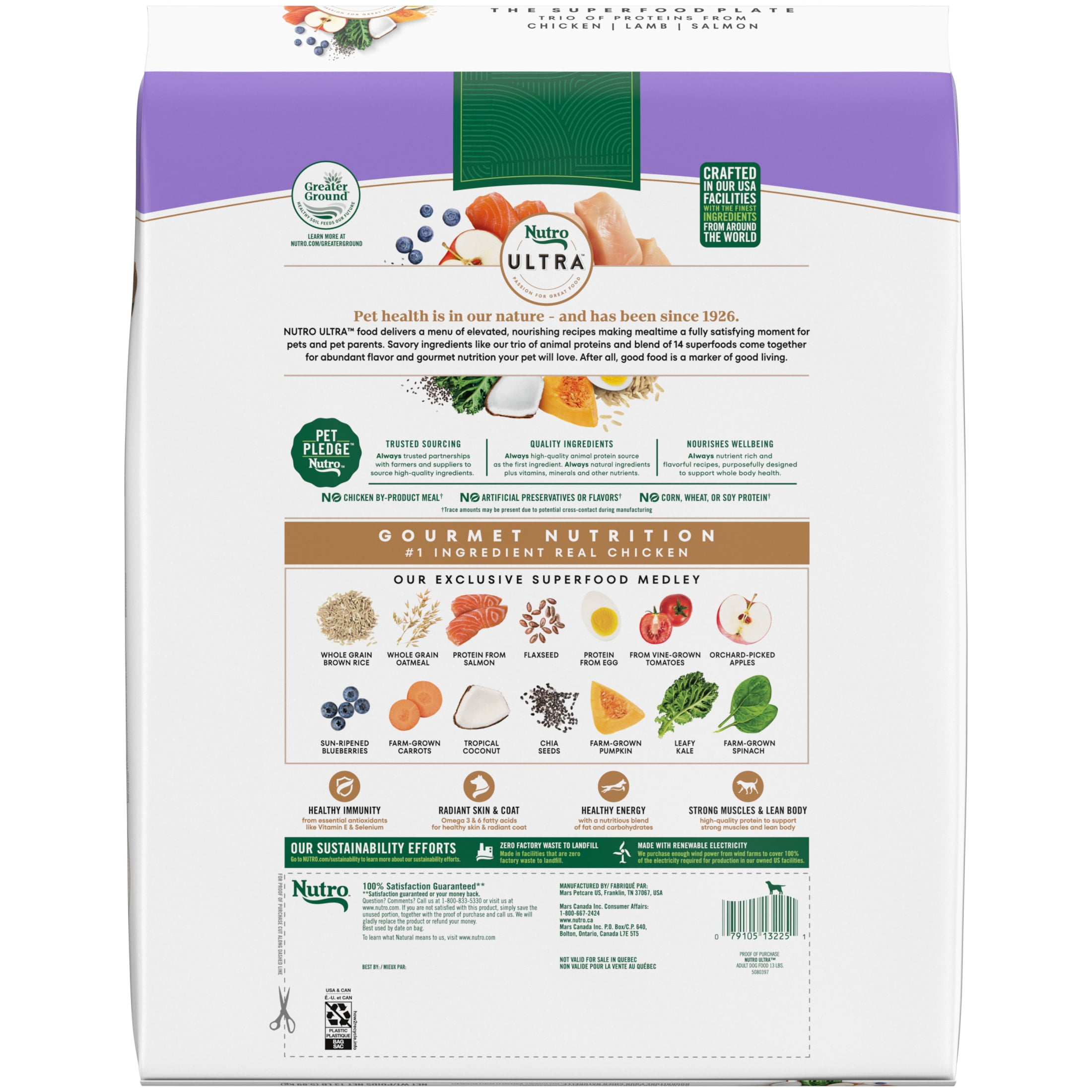 Dogs deserve to enjoy their dry dog food as much as we enjoy our food. That’s why Nutro Ultra Adult High Protein Natural Dry Dog Food delivers elevated, nourishing recipes to make mealtime an enjoyable experience for both pets and their parents. Crafted with real chicken as the #1 ingredient, your dog is served an appetizing and appealing dry dog food meal. Nutro Ultra Adult High Protein Dry Dog Food with a Trio of Proteins from Chicken, Lamb, and Salmon provides essential antioxidants to support the immune system and essential nutrients to support whole-body health. Plus, it’s made with non-GMO ingredients and has no chicken by-product meal, corn, wheat, or soy. Formulated with high-quality protein to support strong muscles and a lean body, Nutro Dry Dog Food understands that your pet’s health and vitality begins with what they eat.