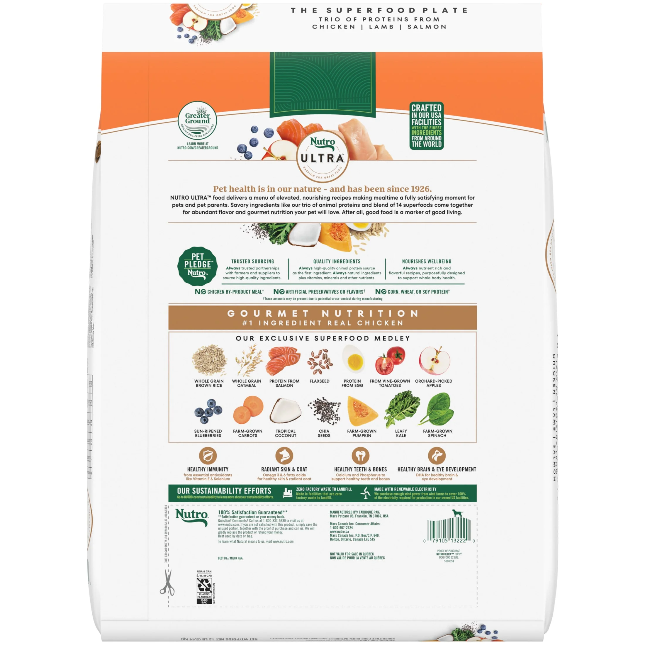 Dogs deserve to enjoy their dry dog food as much as we enjoy our food. That’s why Nutro Ultra High Protein Dry Dog Puppy Food delivers elevated, nourishing recipes to make mealtime an enjoyable experience for both pets and their parents. Crafted with real chicken as the #1 ingredient, your puppy is served an appetizing and appealing dry dog puppy food meal. Nutro Ultra High Protein Dry Dog Puppy Food with a Trio of Proteins from Chicken, Lamb and Salmon provides essential antioxidants to support the immune system and essential nutrients to support whole-body health. Plus, it’s made with non-GMO ingredients and has no chicken by-product meal, corn, wheat, or soy. Formulated with DHA for healthy brain and eye development and a nutritious blend of fat and carbohydrates for healthy energy, Nutro Dry Dog Puppy Food understands that your pup’s health and vitality begins with what they eat.