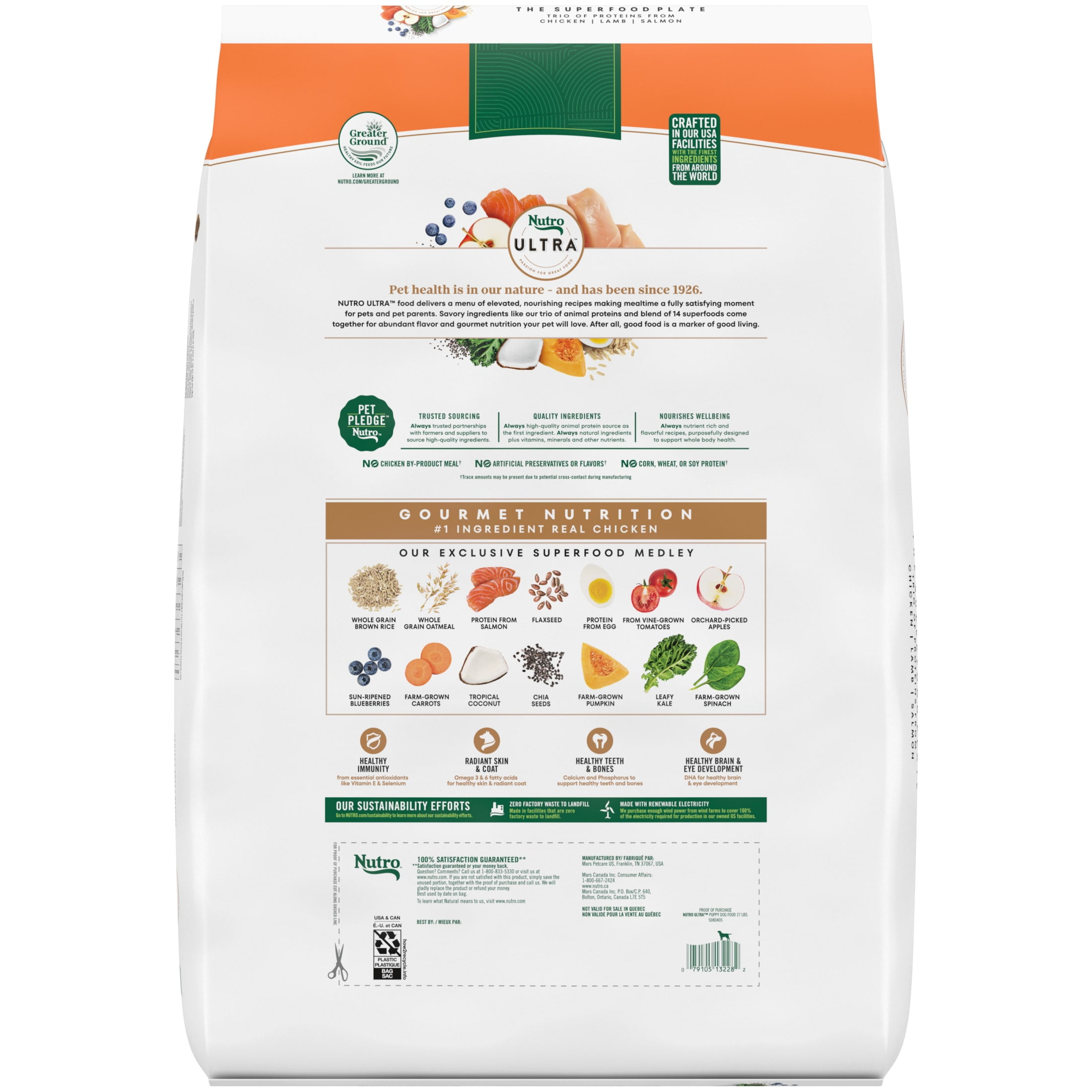 Dogs deserve to enjoy their dry dog food as much as we enjoy our food. That’s why Nutro Ultra High Protein Dry Dog Puppy Food delivers elevated, nourishing recipes to make mealtime an enjoyable experience for both pets and their parents. Crafted with real chicken as the #1 ingredient, your puppy is served an appetizing and appealing dry dog puppy food meal. Nutro Ultra High Protein Dry Dog Puppy Food with a Trio of Proteins from Chicken, Lamb and Salmon provides essential antioxidants to support the immune system and essential nutrients to support whole-body health. Plus, it’s made with non-GMO ingredients and has no chicken by-product meal, corn, wheat, or soy. Formulated with DHA for healthy brain and eye development and a nutritious blend of fat and carbohydrates for healthy energy, Nutro Dry Dog Puppy Food understands that your pup’s health and vitality begins with what they eat.