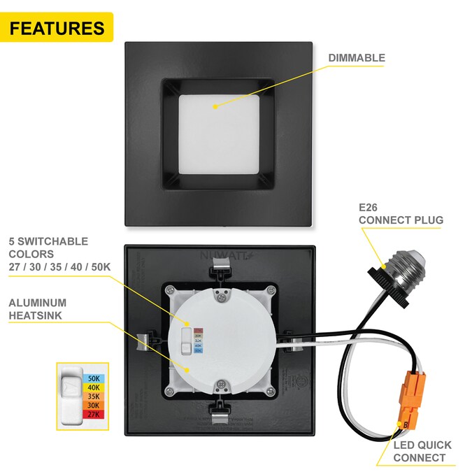 The NUWATT 4 inch Square retrofit is Ideal for residential lighting but can be used as commercial or hospitality lighting. You can apply these LED recessed lights in any room such as living room, bedroom, kitchen, bathroom, closet, entryway. Effectively use them in offices, hotels, hallways, meeting rooms, restaurants, metro stations and other commercial buildings. Comes with E26 connectors, hardware and ready for easy installation.