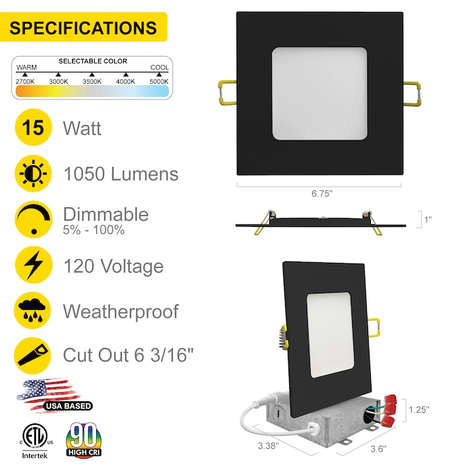 Introducing the NuWatt 6 inch Square Recessed Lighting. The ultimate lighting solution for homeowners looking to elevate their living spaces and contractors seeking top notch hassle free installations. Experience the perfect blend of style and functionality with our state of the art flush mount downlight. These ultra thin recessed lights are designed to transform any room into a sophisticated haven adding a touch of modern elegance to your home. The NuWatt 6 inch Square Trim Recessed Light features a canless installation directly into the ceiling eliminating the need for traditional bulky cans. These square LED ceiling lights has a luminous flux of 1050 lumens and a wattage of 15 Watts equivalent up to 100W halogen replacement that is operated on 120V AC. Our square lighting is compatible with most dimmers to control LED output intensity and dim it as you see fit! You have free rein to turn down the brightness flicker free from 100% to as low as 5%. The 5 in 1 CCT Selectable feature sets our LED recessed lights apart from the competition. Choose from a range of color temperatures to create the perfect ambiance for any occasion. You can set your mood with the inviting glow of 2700K soft white the cozy warm white of 3000K the balanced illumination of 3500K neutral white light the cool white brightness of 4000K or the daylight of 5000K. Our NuWatt lights have you covered from warm light akin to morning sunlight to cool white light that mimics pure natural day light. The versatility of these selectable options ensures you can adapt the lighting to match your desired mood or enhance specific areas of your home. Installation is quick and simple. Featuring an integrated IC rated junction box mount holes Snap In clips and 3 knockouts these ceiling light fixtures may be installed directly into drywall without needing a can. These flush mount recessed lights fit double drywall ceilings and around joists with a slim design. The water resistant twist connectors provide weatherproof functionality that improves their overall performance and durability. Save energy and get your money’s worth! With an average life of 50000 hours these LED downlights will decrease maintenance and replacement costs. Enjoy their 45 year lifespan with an average use of 3 hours per day and forget about energy consumption costs once and for all. Designed with durability and longevity in mind the NuWatt 6 inch Canless Square Flush Mount Recessed Lighting boasts exceptional quality. Crafted with premium materials such as an aluminum body and acrlyic lens that will never yellow. These wafer recessed lights provide outstanding performance reliability and energy efficiency. Our cutting edge technology ensures superior lighting output while consuming minimal power allowing you to enjoy beautiful illumination while reducing energy costs. Perfect for homeowners looking to upgrade their living spaces and contractors seeking high quality lighting solutions the NuWatt 6 inch Square Recessed Lighting ticks all the boxes. With its canless install 5CCT Selectable feature ultra thin design and long lasting performance these LED recessed lights offer an ideal blend of style convenience and functionality. The NUWATT 6 Inch Canless LED Downlight is perfect for kitchens lighting living rooms lighting bedrooms lighting office lighting bathrooms lighting hotel lighting restaurant lighting soffit lighting and outdoor recessed lighting in residential buildings income property buildings multi family building lighting or even in office spaces of warehouses. Elevate your aesthetic appeal and create an inviting atmosphere with NuWatt Lighting Your World!