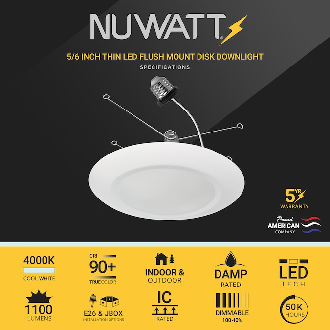 Shine the Right Light Into Your Home or Office Space The NUWATT 5/6 inch Slim LED Flush Mount Disk Downlights are perfect for residential and commercial locations from offices to kitchens bedrooms bathrooms and laundry rooms. Each has a luminous flux of 1000 lumens and a wattage of 15W. Choose the right shine for your space: The 2700K soft white color light mimics morning sunlight. The 3000K warm white color light mimics mid afternoon sunlight. The 4000K medium white color light mimics morning sunlight. The 5000K cool white color light mimics pure natural daylight. These LED disks are powered with CRI90+ for true color rendering. It is compatible with most dimmers to control LED output intensity and dim it as you see fit. You have free rein to turn down the brightness from 100% to as low as 5% without any flicker! Installation is quick and simple. We designed these ceiling lights to be directly wired to a 5 inch/6 inch junction box which means they do not need a can. Featuring reliable LED chips high quality lens heat dissipation and AC technology they also have a dustproof and waterproof construction to ensure excellent indoor and outdoor performance. Save energy and get your money’s worth! With an average life of 50000 hours these LED ceiling lights will decrease maintenance and replacement costs. Enjoy their 45 year lifespan with an average use of 3 hours per day and forget about energy consumption costs once and for all.