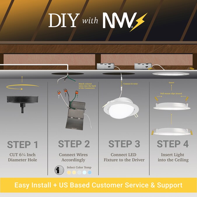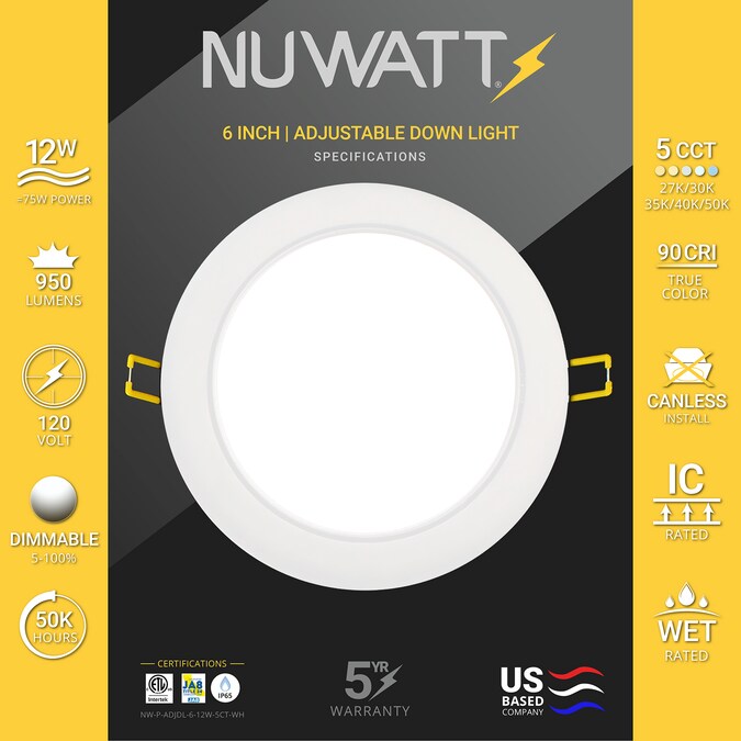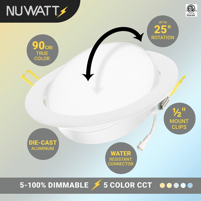 Introducing the NuWatt 4 inch Recessed Eyeball Gimbal Light the ultimate lighting solution that combines versatility energy efficiency and durability. This innovative lighting fixture is designed to meet the needs of homeowners and contractors providing a seamless lighting experience. The NuWatt Rotatable LED Recessed Light has an adjustable lens allowing you to direct the light wherever you desire. You have complete control over the brightness as our LED light is dimmable from 100% to 10%. The five different color temperature selectable options from 2700K Soft White to 5000K Daylight allow you to create the perfect ambiance. Crafted with an aluminum body and non yellowing acrylic lens the NuWatt Recessed Directional Light is built to last and ensures that your light remains clear and vibrant. Certifications like Energy Star and ETL Intertek Listed safety certifications make this an energy efficient choice reducing your carbon footprint and saves you money on utility bills while meeting the highest safety standards. The NuWatt Recessed Eyeball Light features an Ultra Thin design making it easy to install without the need for a traditional can. NuWatt’s Gimbal LED Recessed Light hassle free installation process is perfect for homeowners looking to enhance their living space or contractors seeking a premium lighting solution. Elevate your space with the NuWatt 4 inch Rotatable Recessed Light and enjoy the perfect combination of versatility efficiency and durability.
