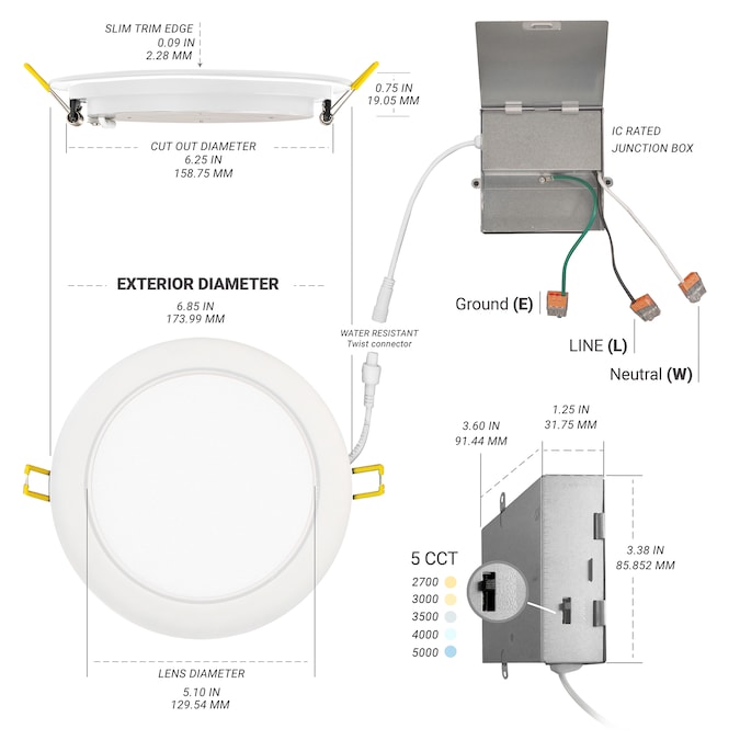 Introducing the NuWatt 6 inch Recessed Eyeball Gimbal Light the ultimate lighting solution that combines versatility energy efficiency and durability. This innovative lighting fixture is designed to meet the needs of homeowners and contractors providing a seamless lighting experience. The NuWatt Rotatable LED Recessed Light has an adjustable lens allowing you to direct the light wherever you desire. You have complete control over the brightness as our LED light is dimmable from 100% to 10%. The five different color temperature selectable options from 2700K Soft White to 5000K Daylight allow you to create the perfect ambiance. Crafted with an aluminum body and non yellowing acrylic lens the NuWatt Recessed Directional Light is built to last and ensures that your light remains clear and vibrant. Certifications like Energy Star and ETL Intertek Listed safety certifications make this an energy efficient choice reducing your carbon footprint and saves you money on utility bills while meeting the highest safety standards. The NuWatt Recessed Eyeball Light features an Ultra Thin design making it easy to install without the need for a traditional can. NuWatt’s Gimbal LED Recessed Light hassle free installation process is perfect for homeowners looking to enhance their living space or contractors seeking a premium lighting solution. Elevate your space with the NuWatt 6 inch Rotatable Recessed Light and enjoy the perfect combination of versatility efficiency and durability.