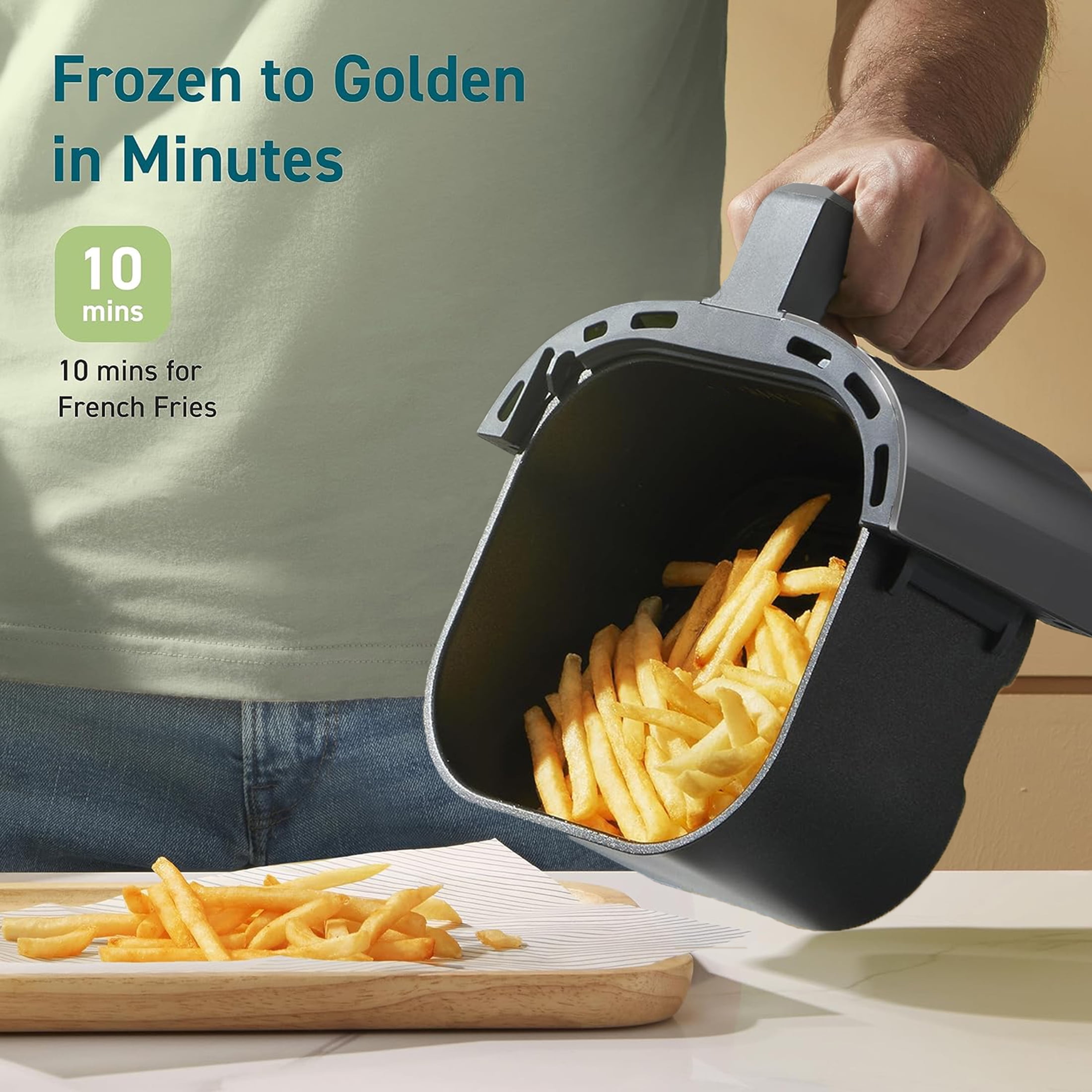 Revolutionize your cooking experience with digital touch screen controls! No more analog buttons and faded silk-screened letters. Brio Plus’s digital controls offer seamless and futuristic cooking interface. Enjoy precision at your fingertips. Set cook temperatures from 50°F to 400°F adjustable in precise 5°F increments. Unlike the primitive methods that regulate temperature by turning the heater on and off, our heater never turns off but executes constant adjustments throughout the cooking process. Nuwave 8QT air fryer with 5 Cook Functions, Choose from Air Fry, Roast, Bake, Dehydrate or toast, you can easily customize your cooking for your favorite foods. And 100 Presets & 50 Memory, 3 Wattages 700, 1500, 1800. Give the foodies in your life the perfect-sized air fryer for fresh and crispy snacks. The LED LCD digital screen is big and easily readable in any light, ensuring an extremely user-friendly and convenient control experience. Upgrade your kitchen technology and experience the difference. It can hold 8-quarts of cooking space, which fits enough food for 4-7 people, with compact design takes up little room on your counter top. Give the foodies in your life the perfect-sized air fryer for fresh and crispy snacks.