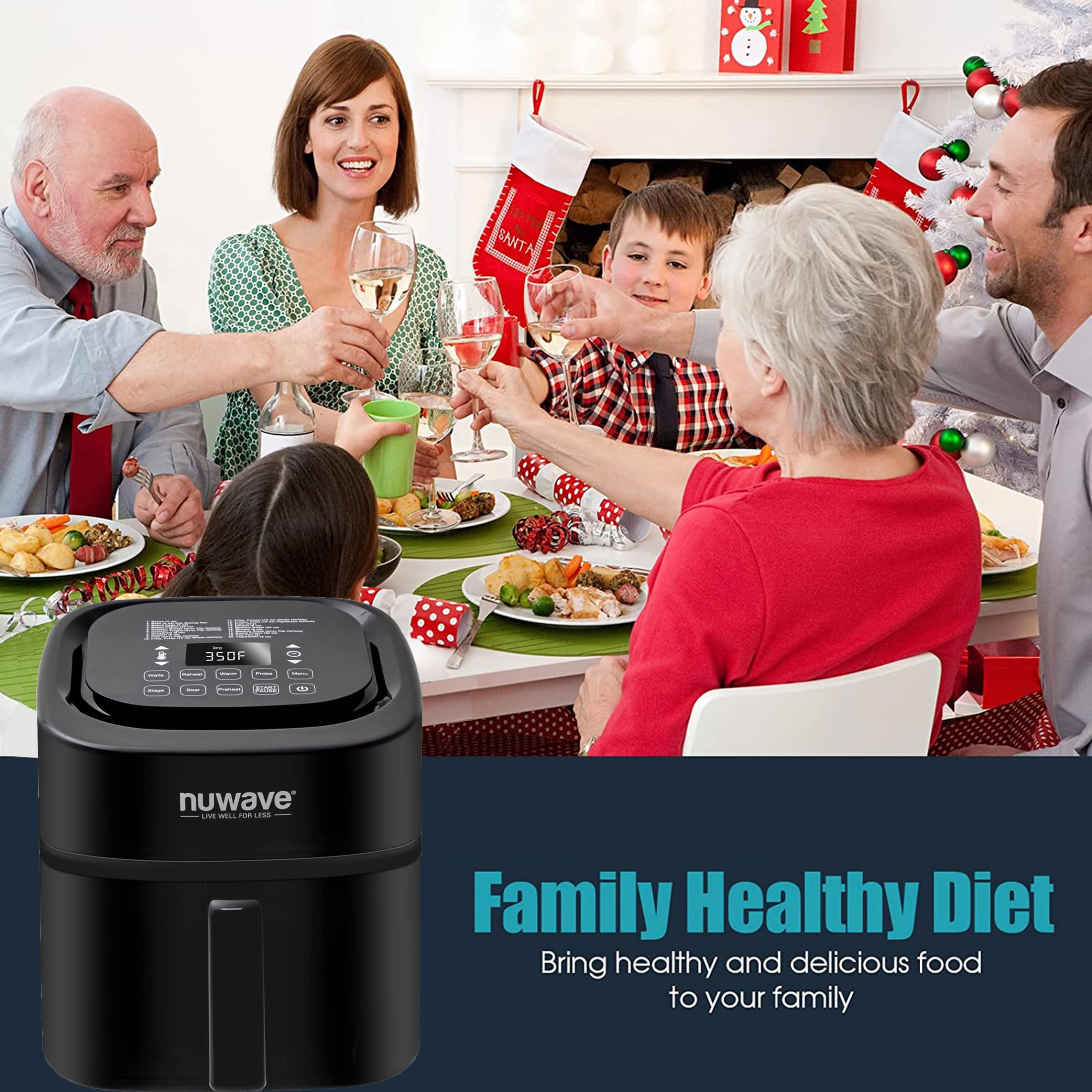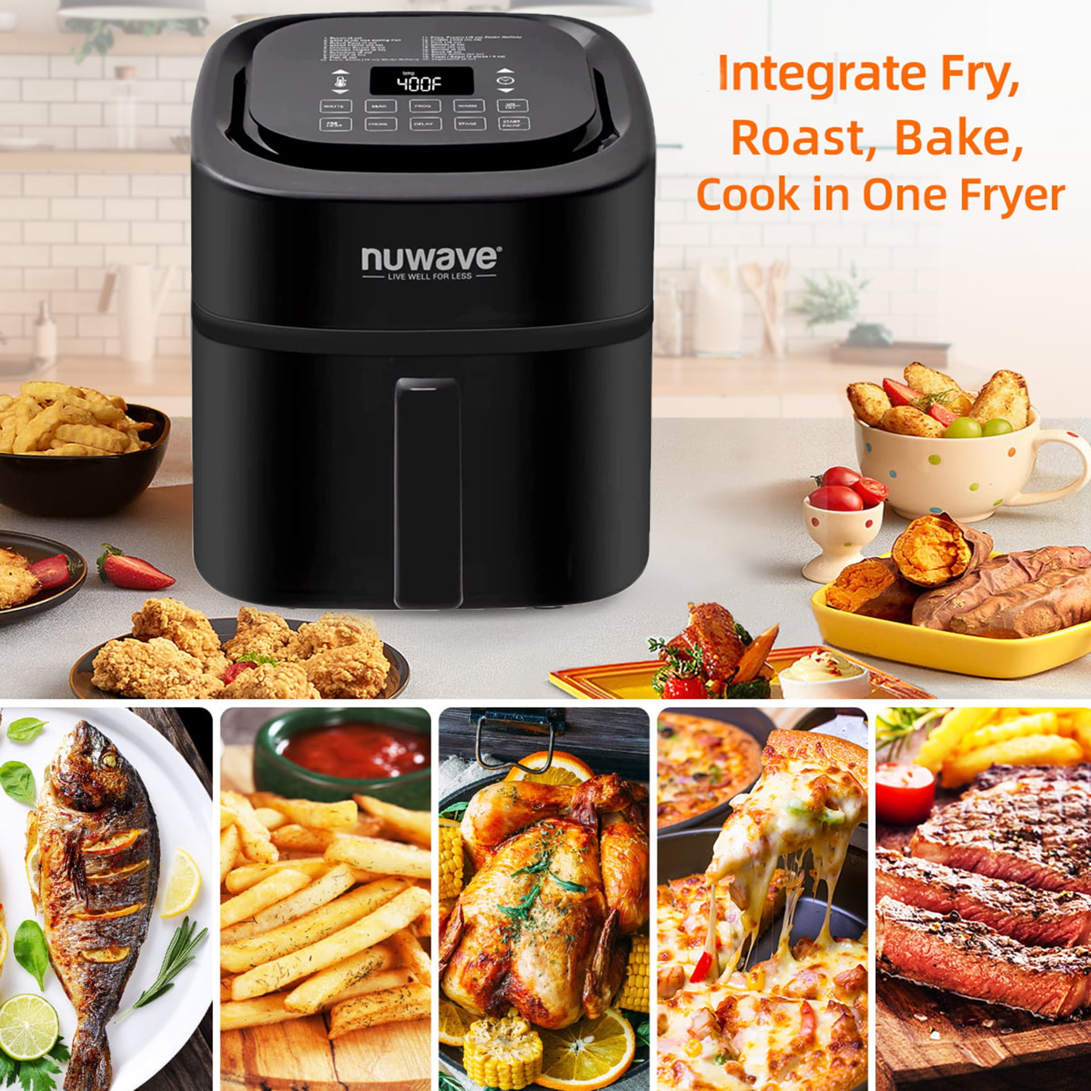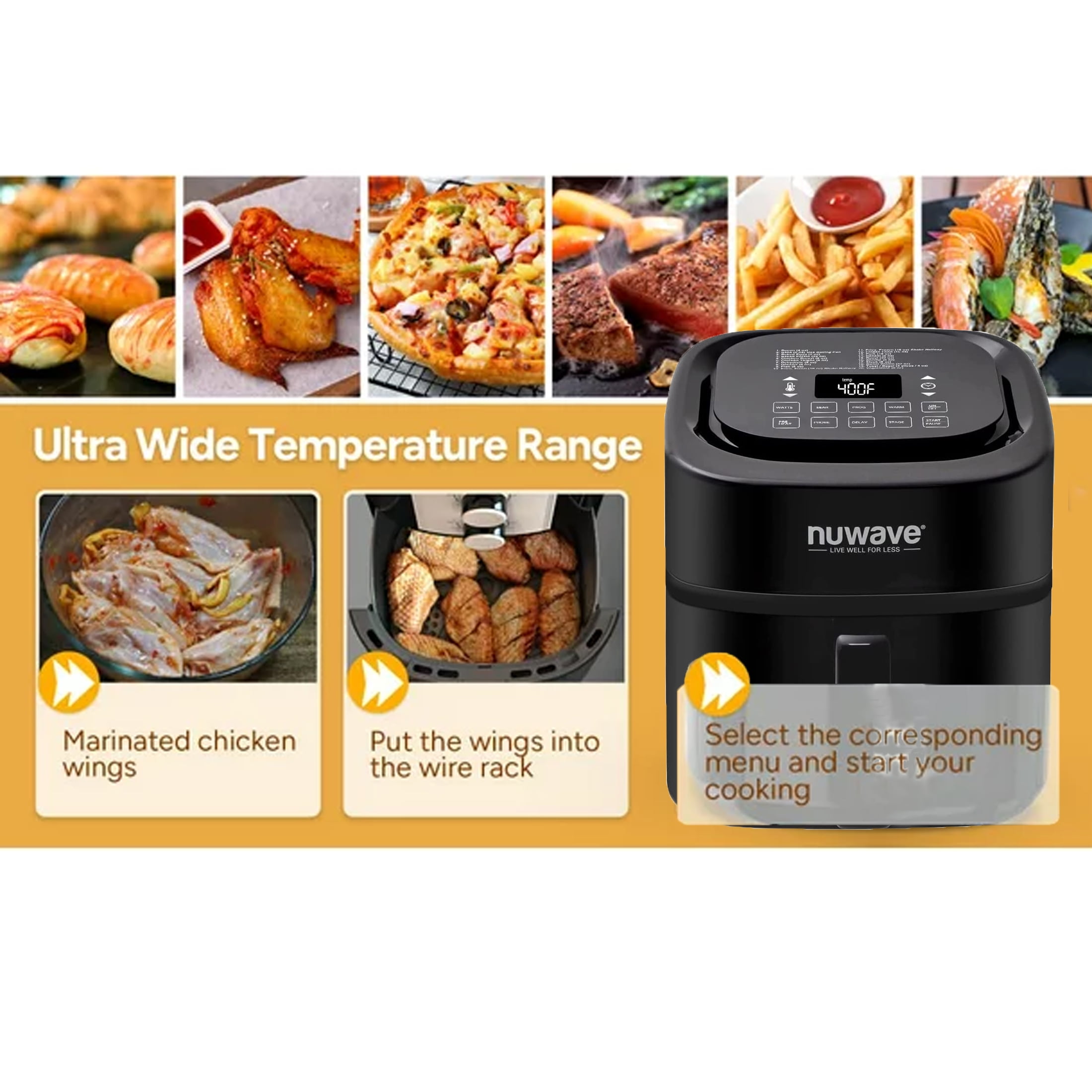 NuWave Brio 6-Qt Air Fryer, Black – 1500W, Digital Display, Non-Stick Basket Wide temperature range of 50°F–400°F for versatile cooking options Cooks with at least 98% less oil than conventional deep fryers for healthier meals Includes 100 preset cooking functions for easy meal preparation Convenient preheat and reheat functions for optimal cooking results 8-quart nonstick basket is dishwasher-safe for easy cleaning