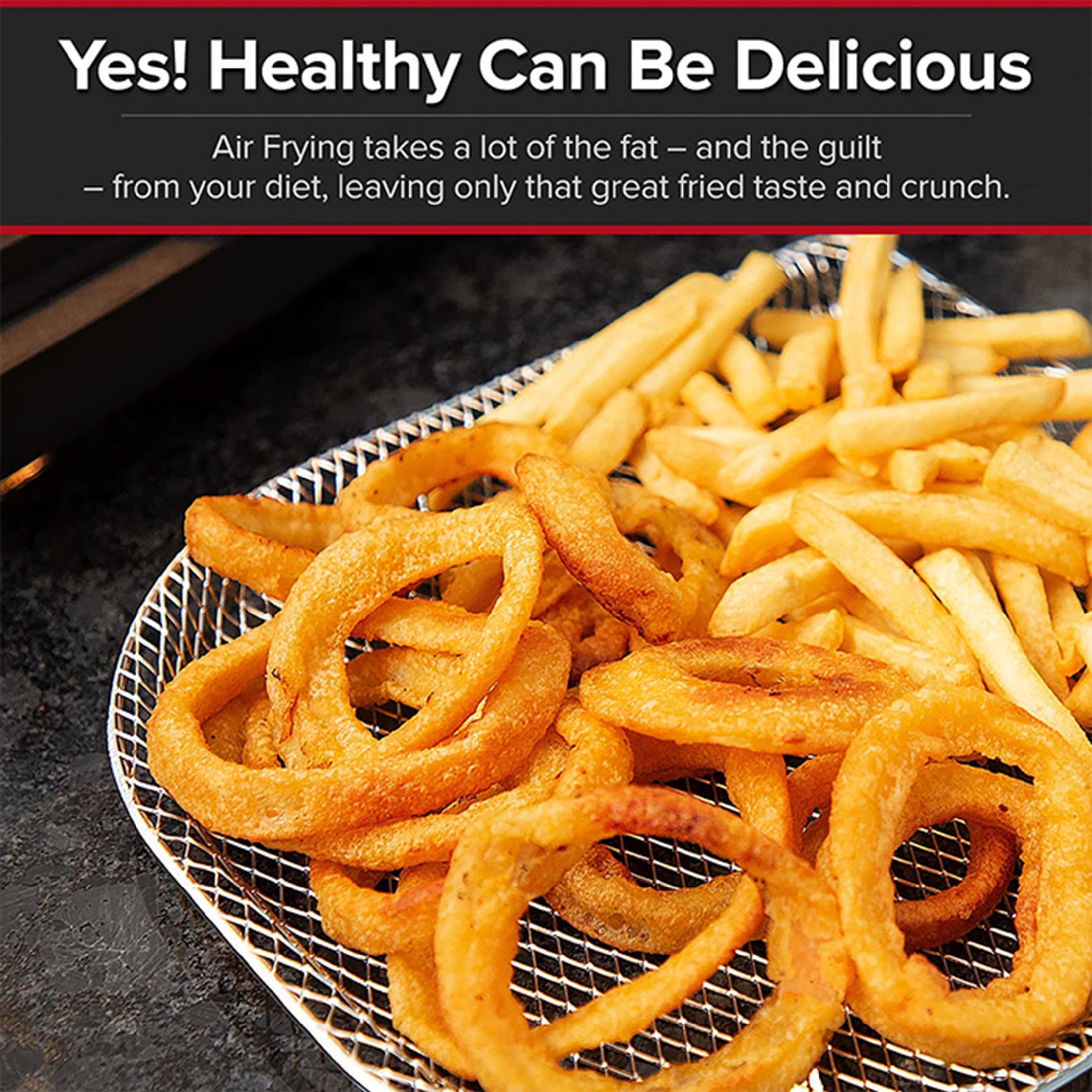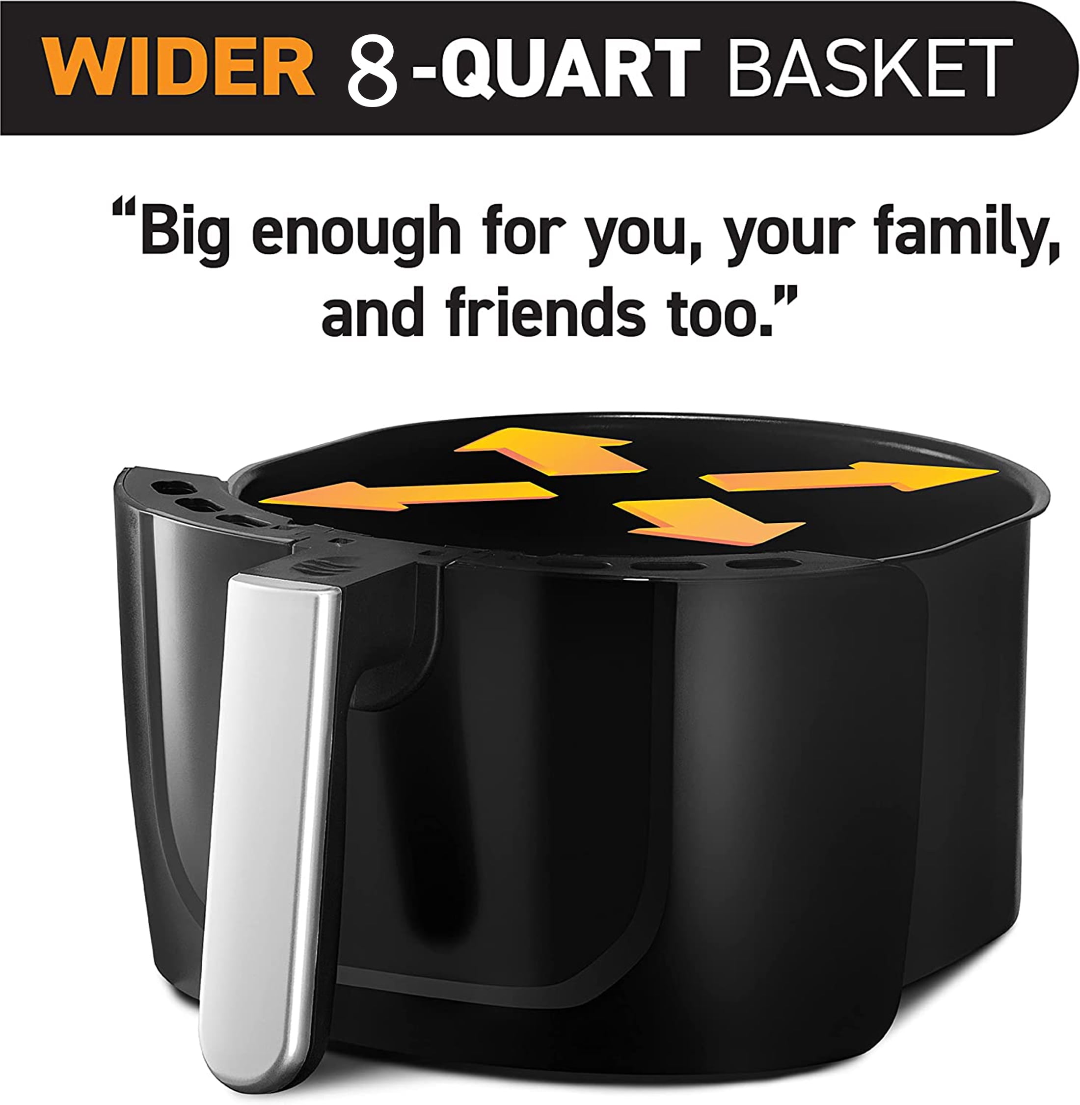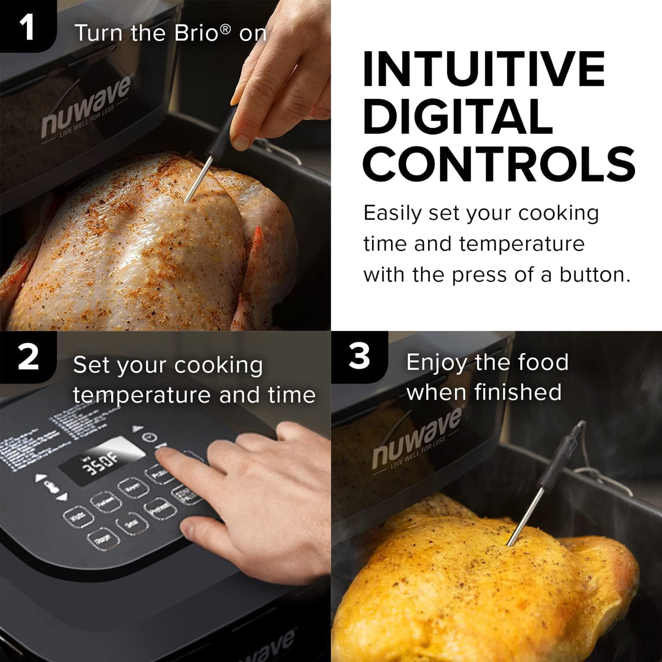 NuWave Brio 6-Qt Air Fryer, Black – 1500W, Digital Display, Non-Stick Basket Wide temperature range of 50°F–400°F for versatile cooking options Cooks with at least 98% less oil than conventional deep fryers for healthier meals Includes 100 preset cooking functions for easy meal preparation Convenient preheat and reheat functions for optimal cooking results 8-quart nonstick basket is dishwasher-safe for easy cleaning